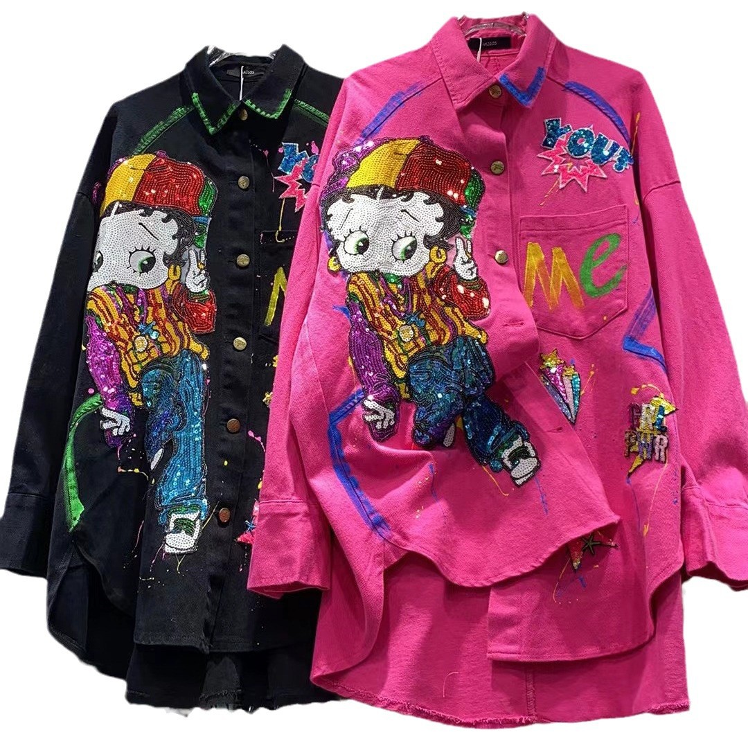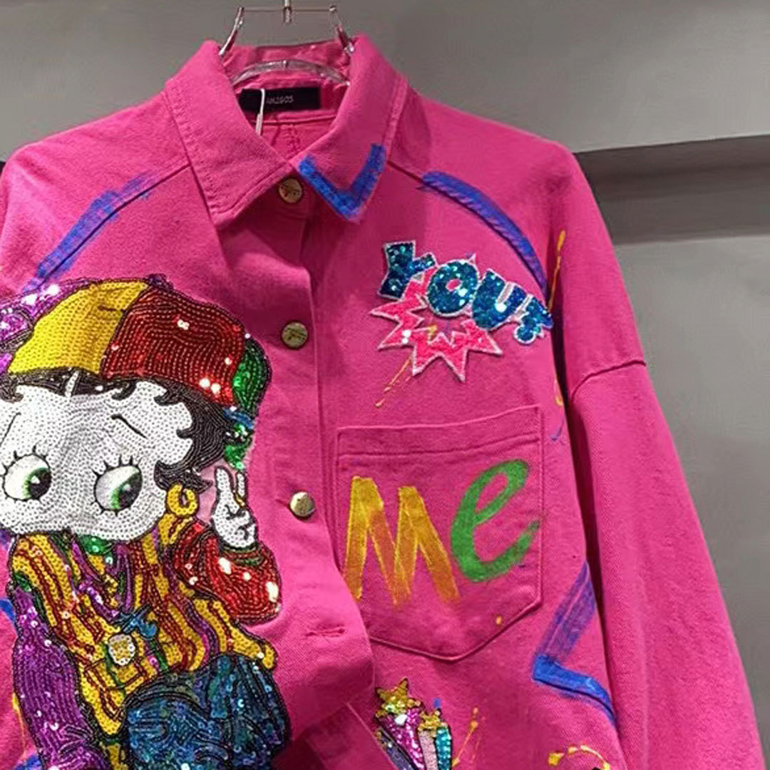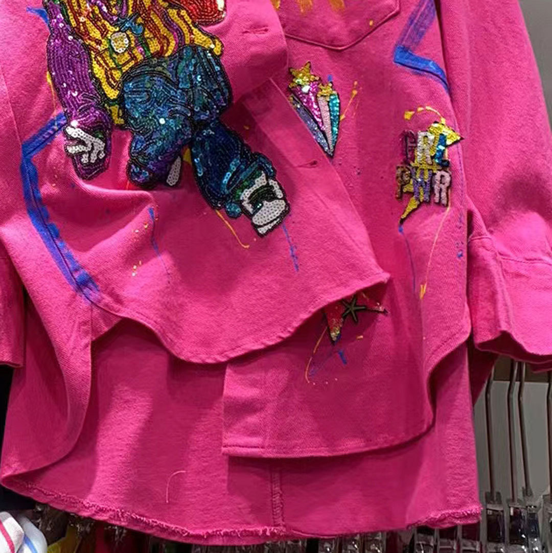 European aged denim jacket for women with a high-end feel, medium to long windbreaker, spring and autumn cartoon nail bead graffiti, western-style cardigan trend