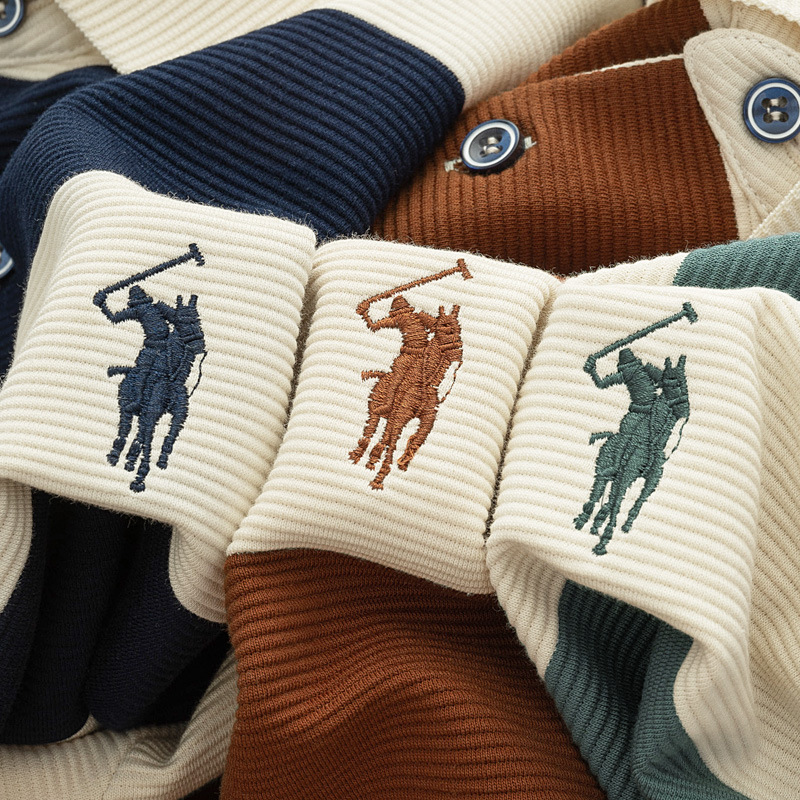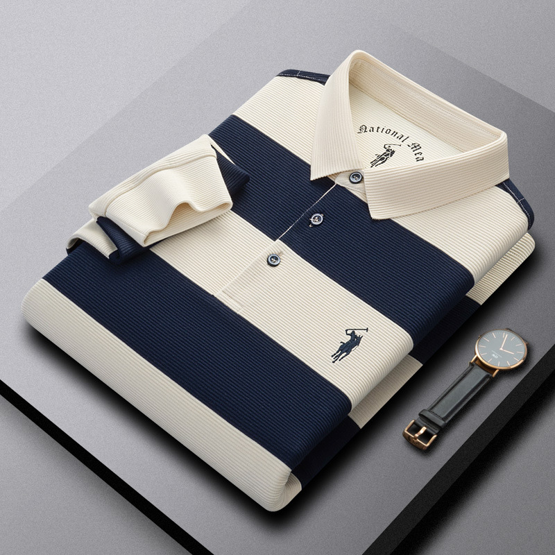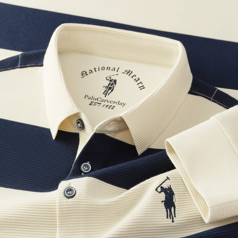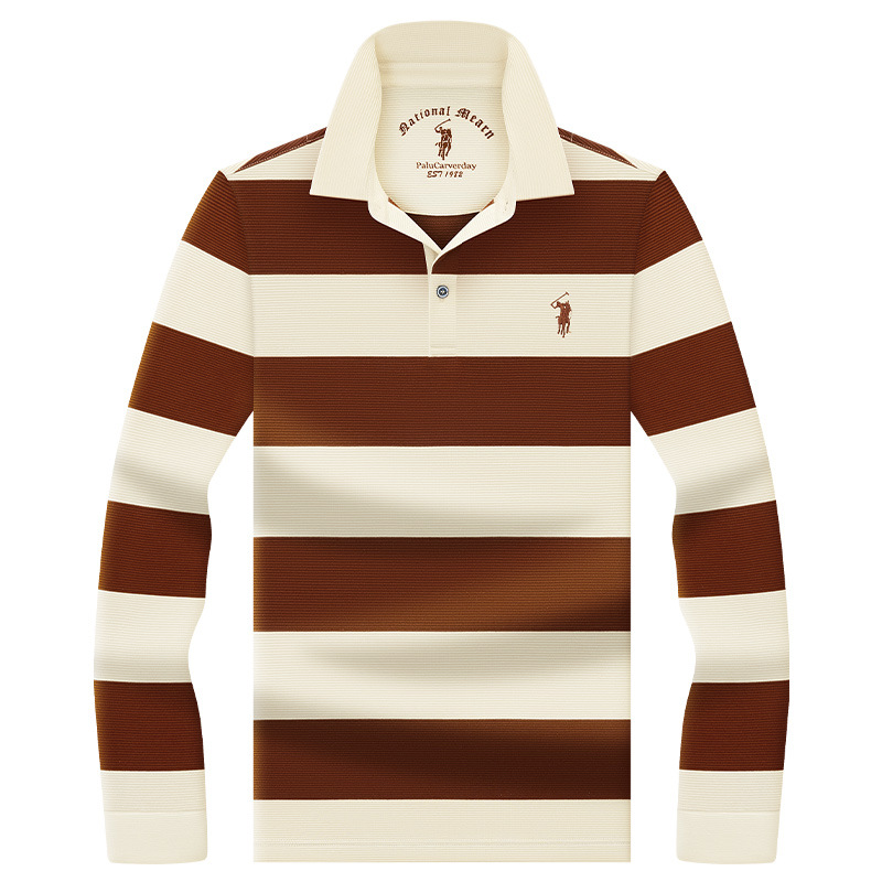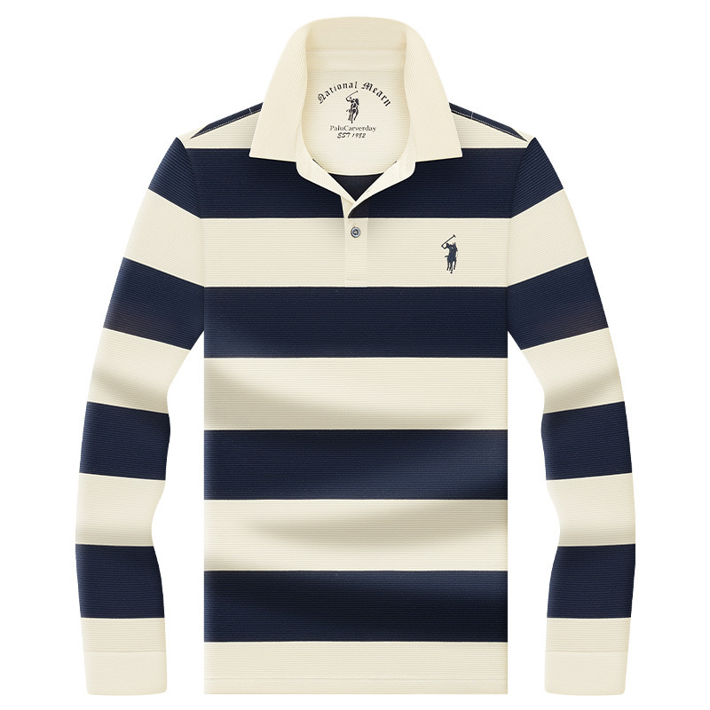 Tiktok live broadcast of Spring and Autumn Men's long sleeved T-shirt striped lapel pony logo POLO shirt middle-aged business T