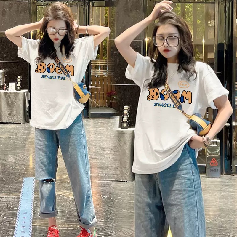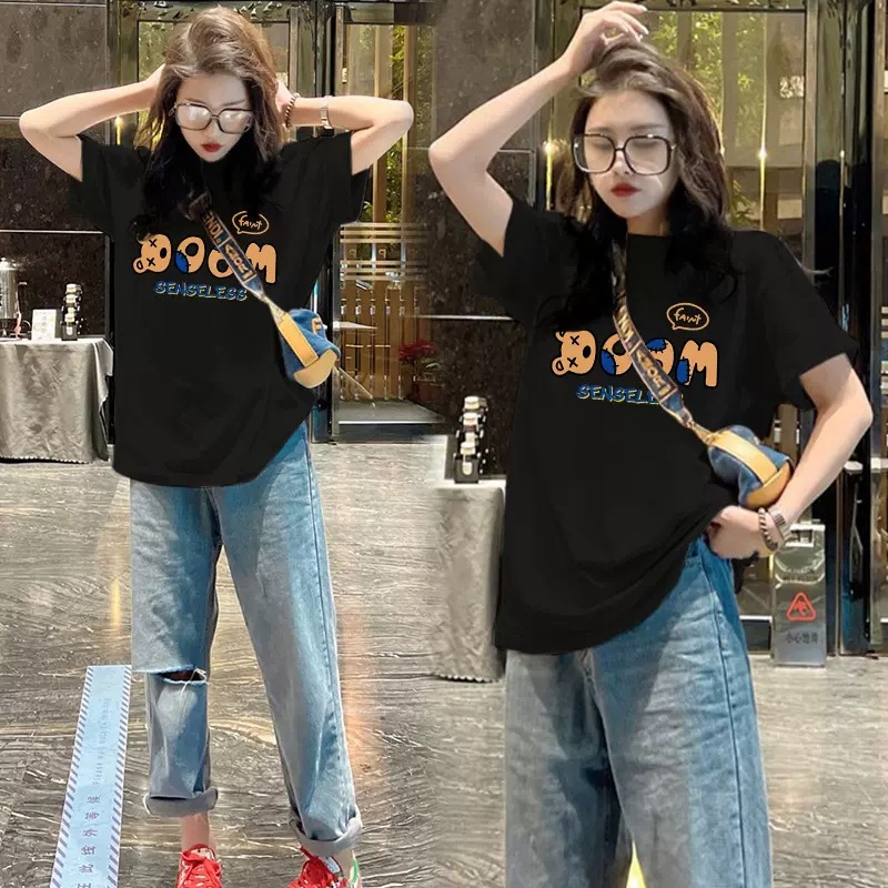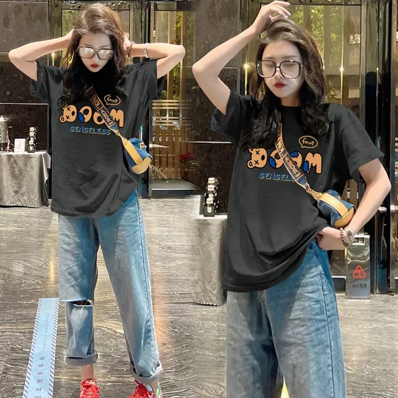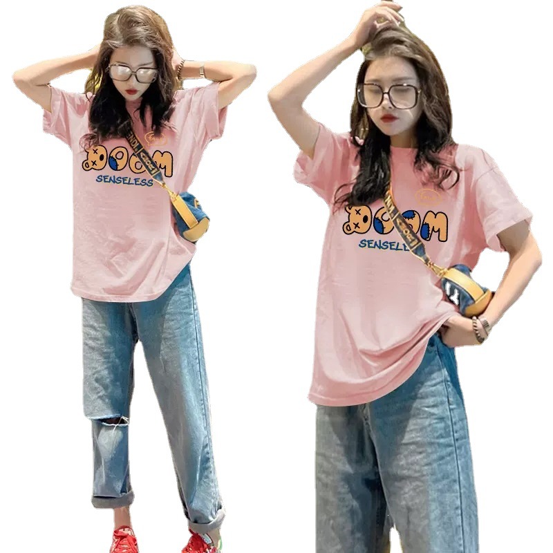 European top 2023 new short sleeved T-shirt for women in summer, mid to long round neck loose print student T-shirt, trendy Instagram
