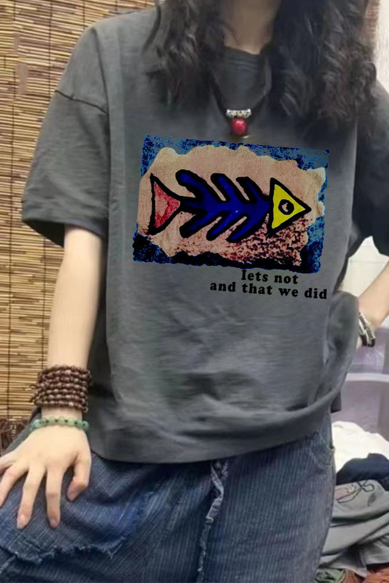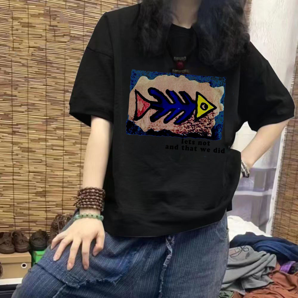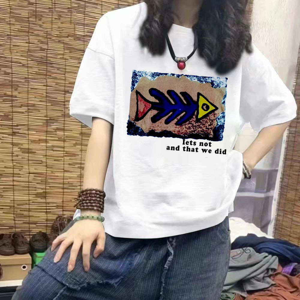 Short sleeved T-shirt for women cartoon spring and summer 2023 new round neck student versatile loose mid to long half sleeved top trend