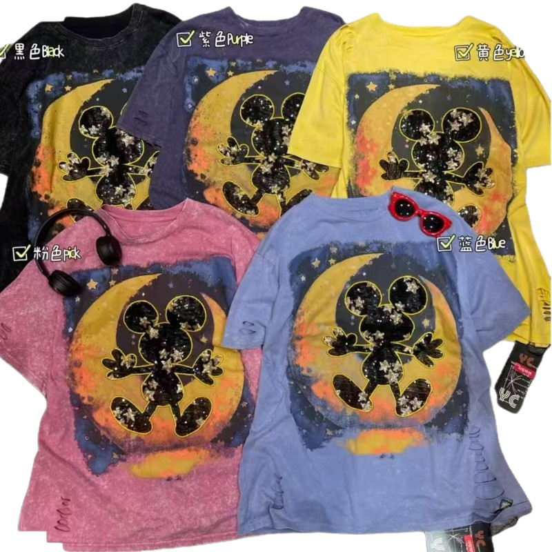25 Spring/Summer New Mickey Moon Pattern Washed T-shirt Trendy Versatile Loose European Short Sleeve Top Trendy