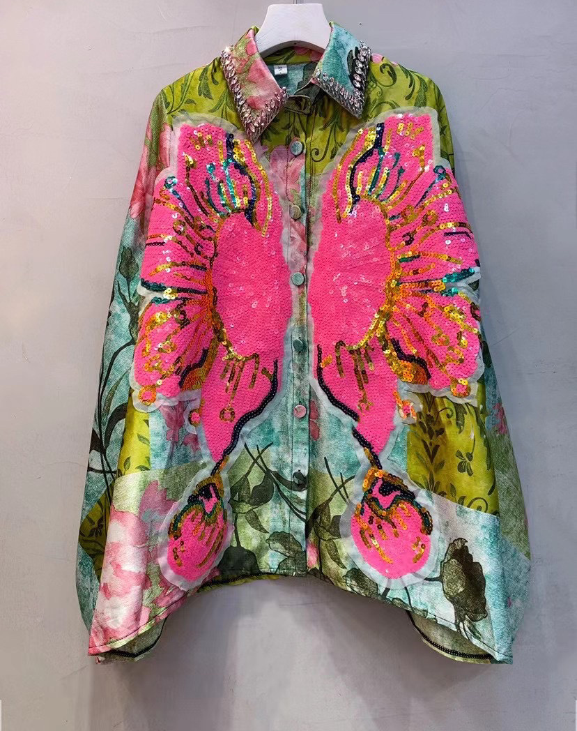 Thailand Chaopai 2024 Spring New Vintage Printed Shirts Women's Beaded Sequins Versatile Loose Shirts
