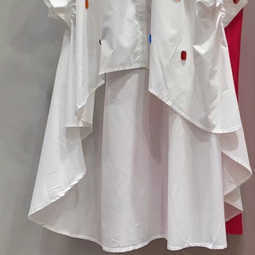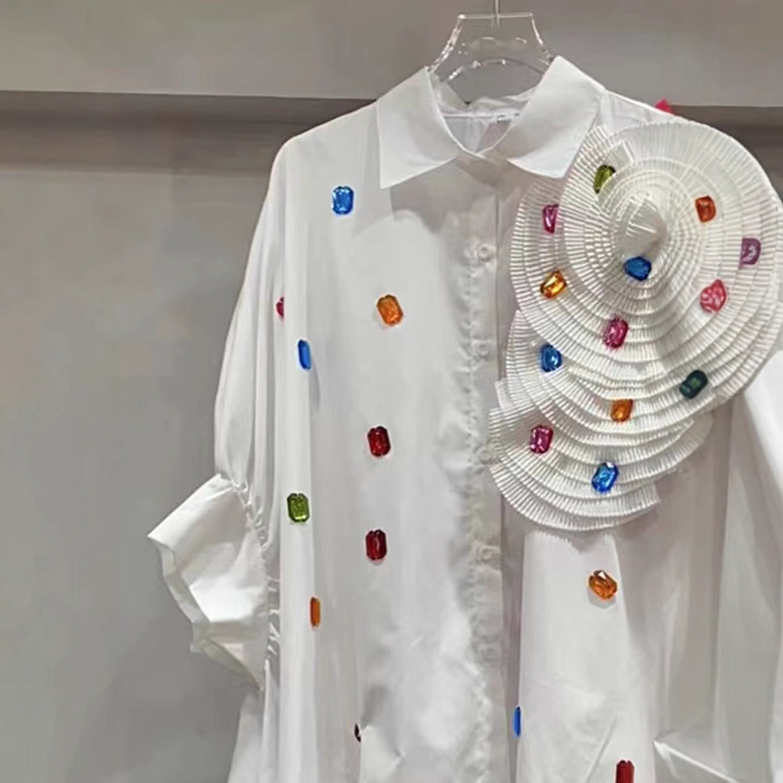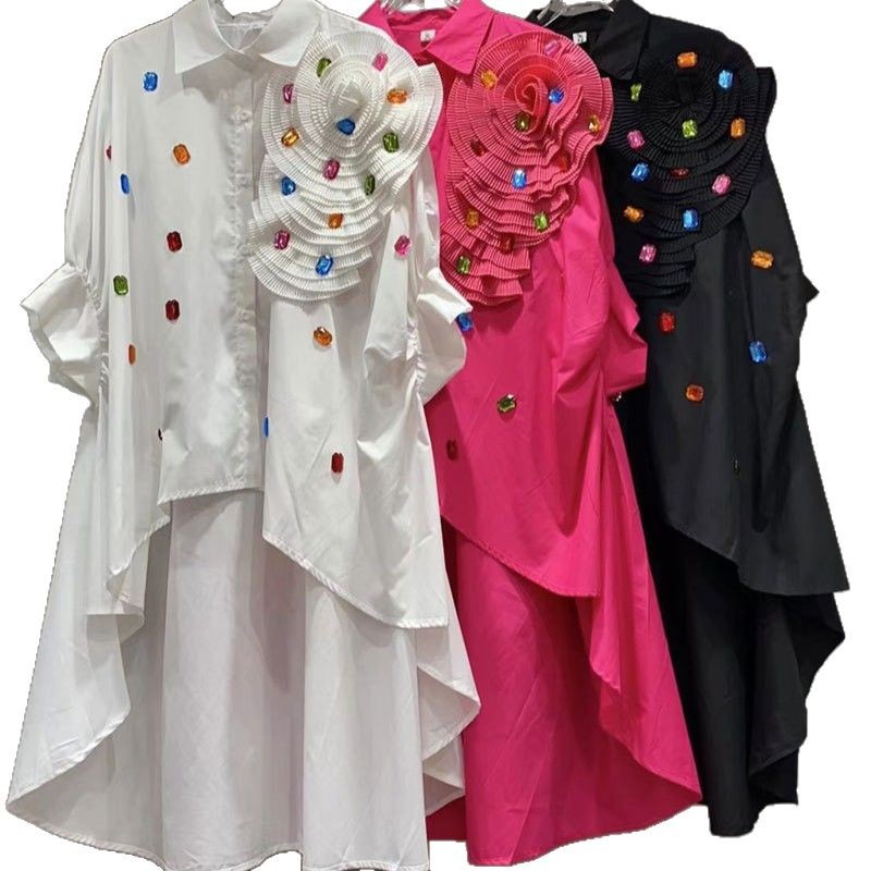 2025 Spring New Long Shirt Irregular Design Bat Sleeve Three Dimensional Flower Shirt Loose Concealing Meat Women's Clothing