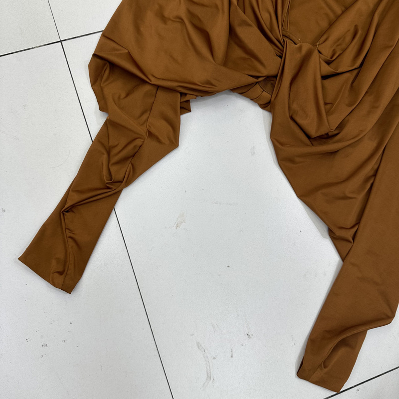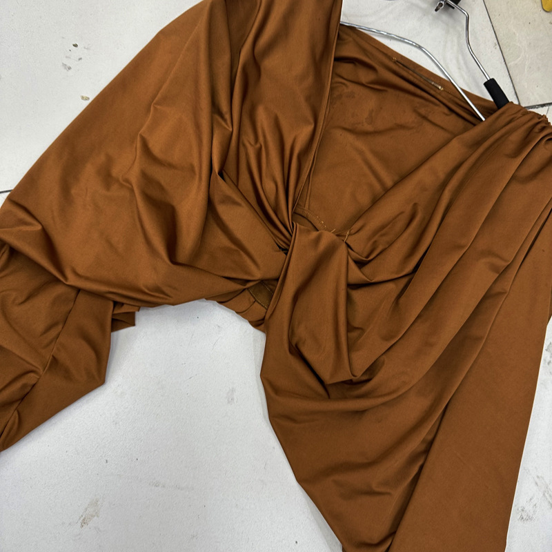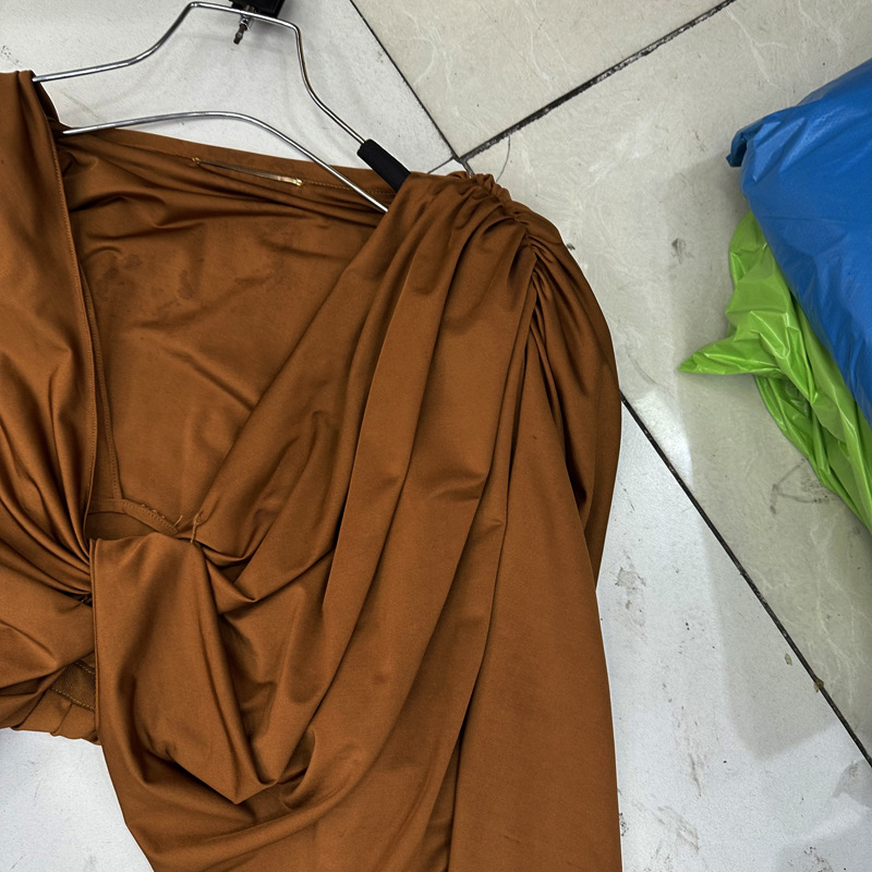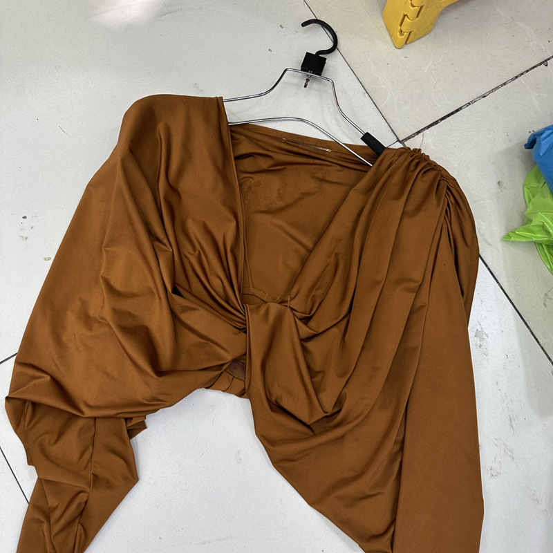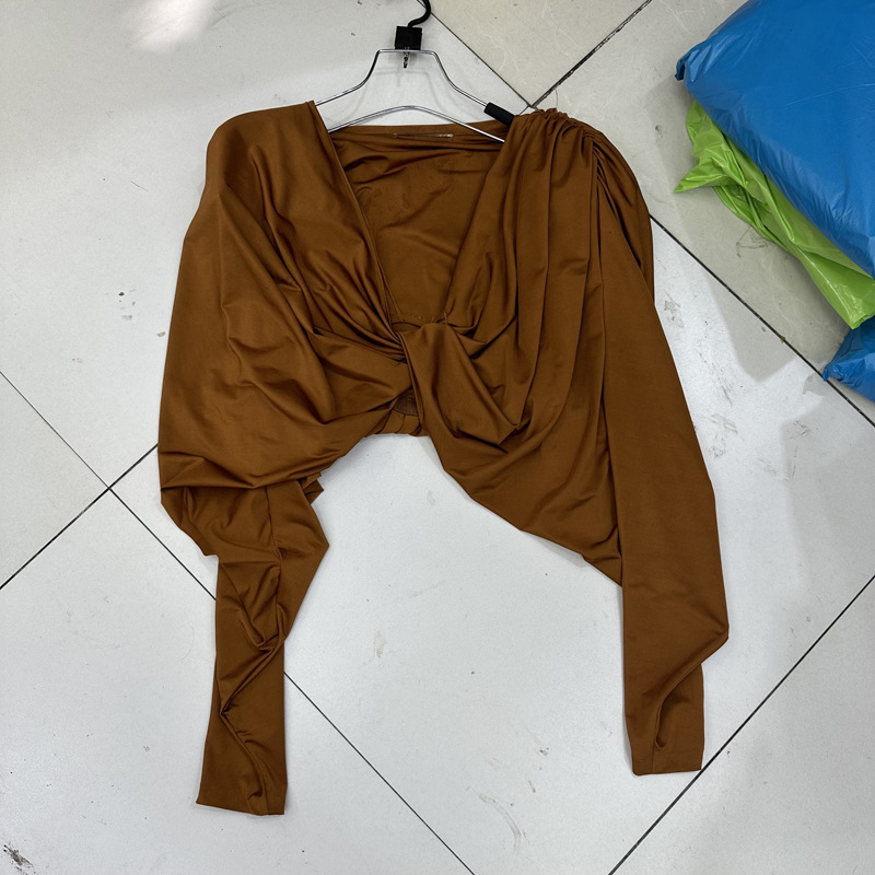 Thirteen Rows Autumn New Deep V-neck Shoulder Pads Pinch Folds Long Sleeves Shrink Waist to Show Thinning Acetic Acid Temperament Women's Shirt D1 # 8906