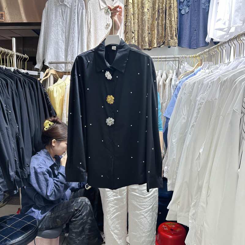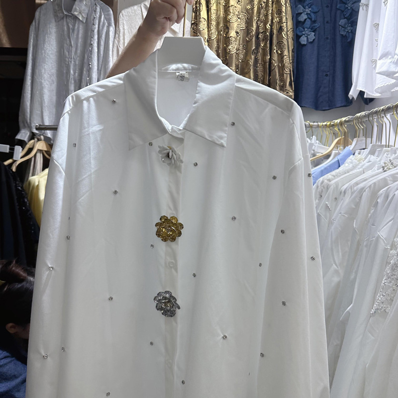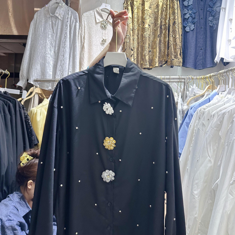 Thirteen line French style niche rhinestone asymmetrical collar, lapel, bubble sleeves, long sleeves, floral single breasted shirt A1 # 863