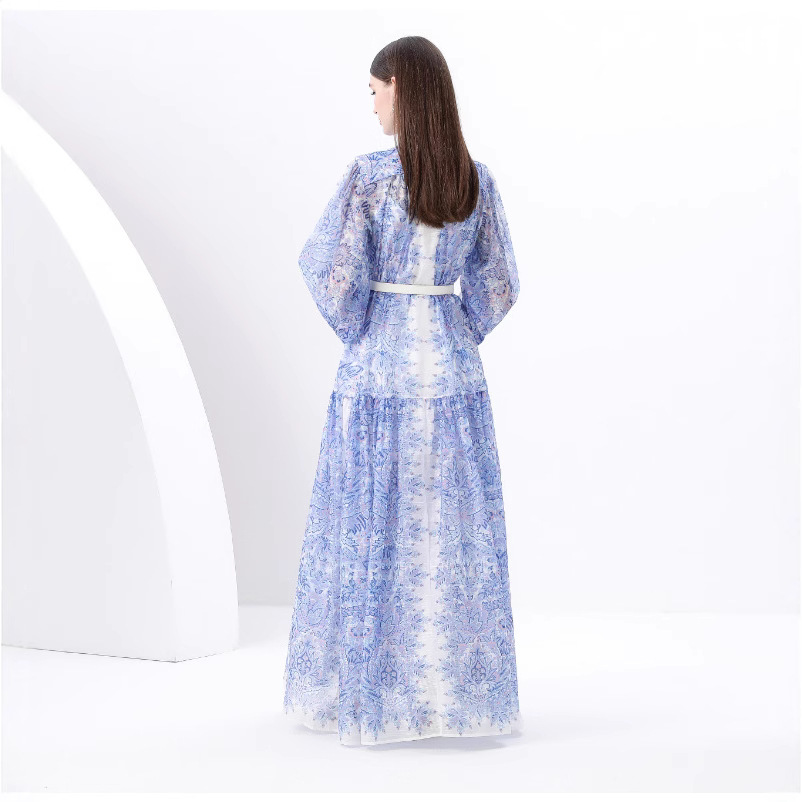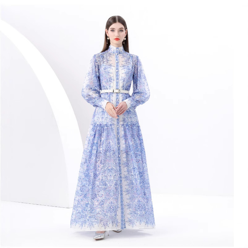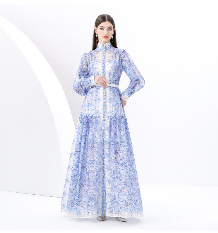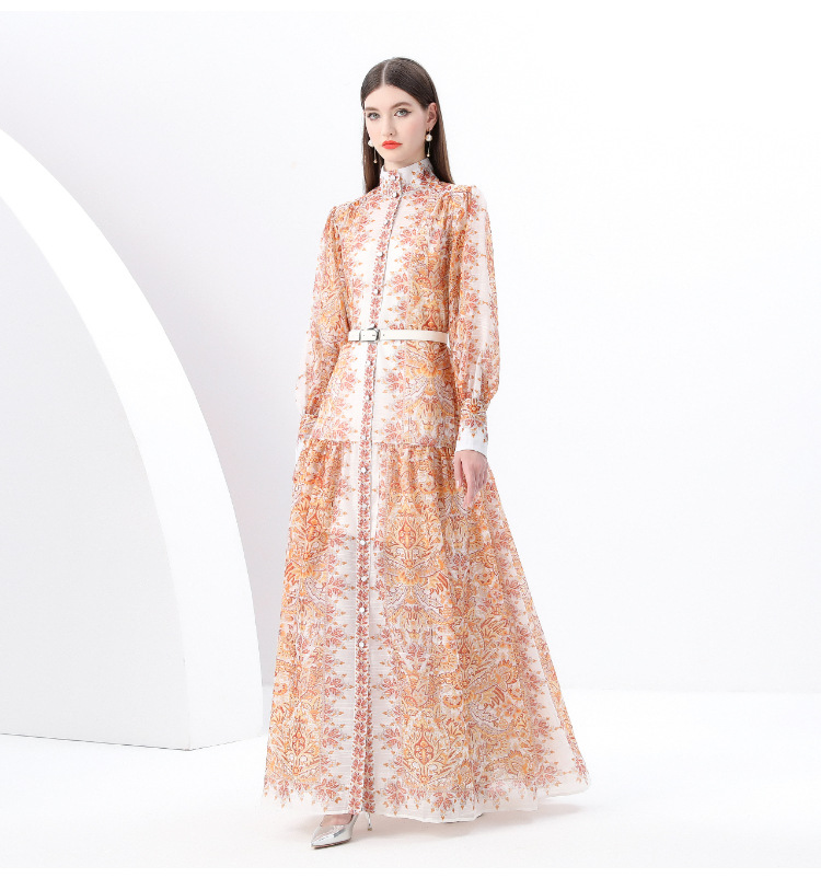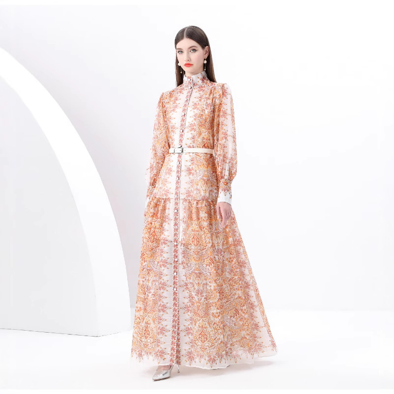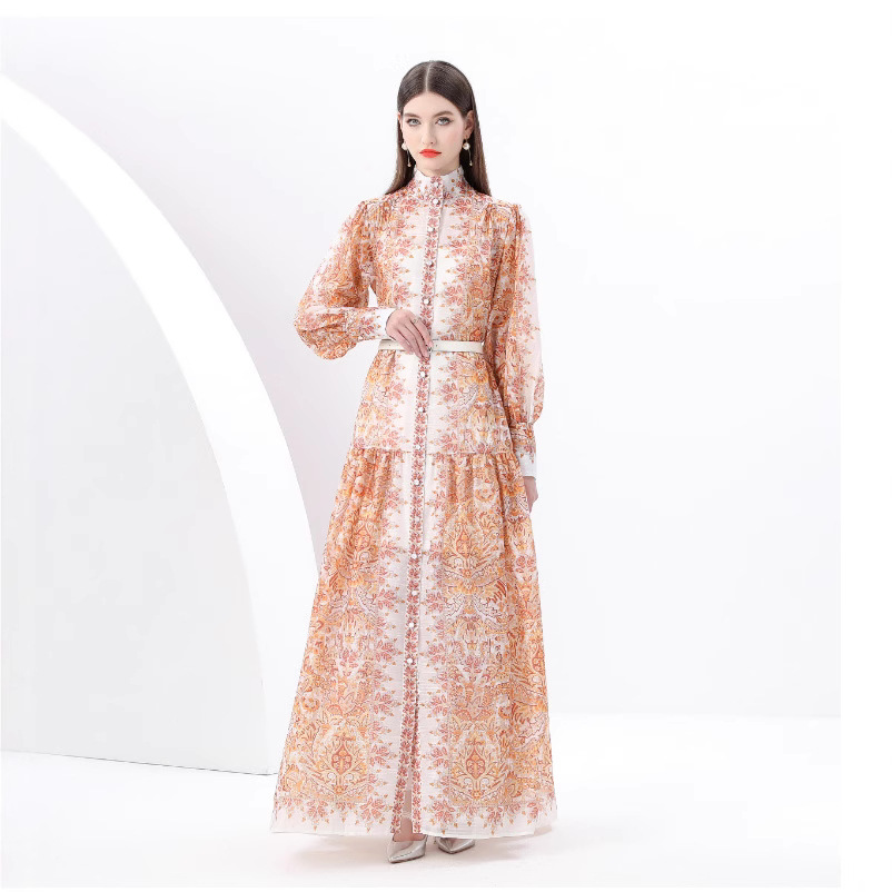 2025 early spring vacation style stand up collar lantern sleeve printed single breasted waist cinched dress for women, pleated elegant long dress