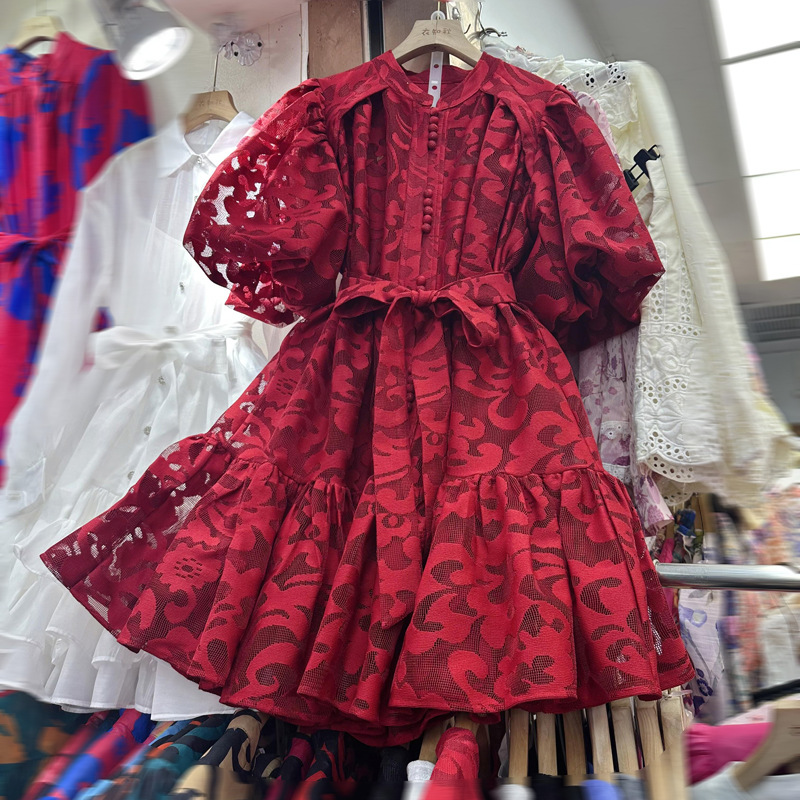 Thirteen line Thai niche loose bubble sleeve single breasted plush lace up bubble sleeve dress A3 # 8970