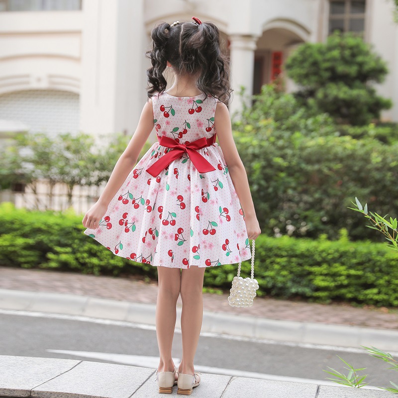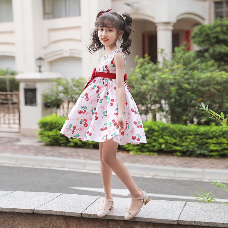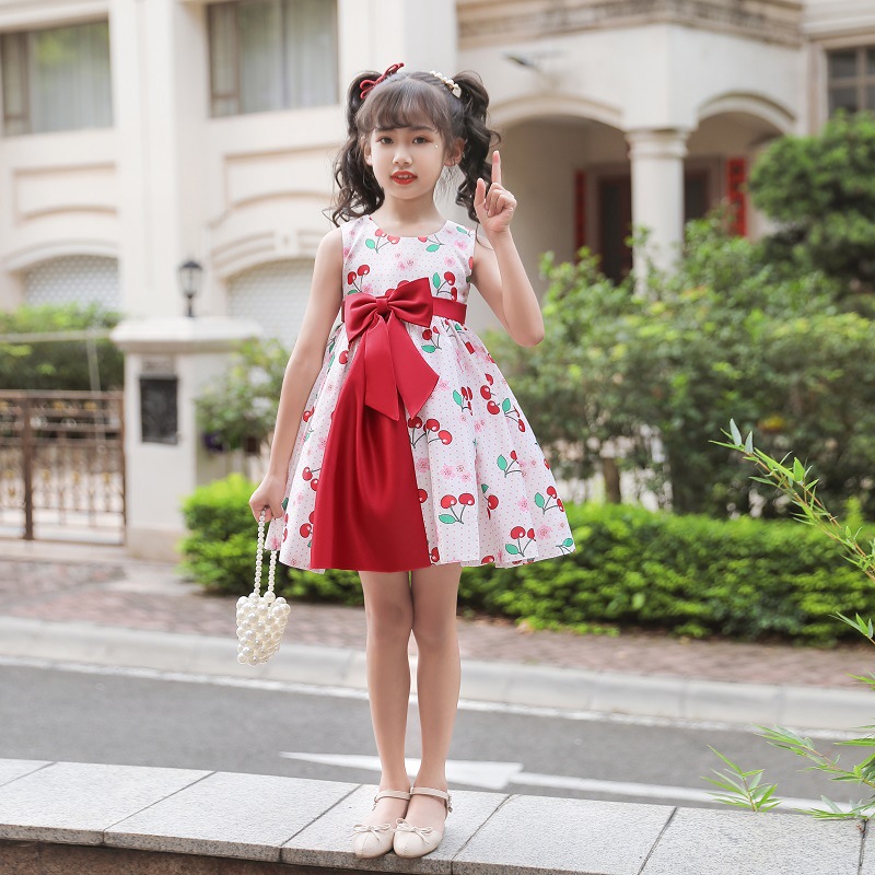 New summer Korean version small cherry big bow cute floral dress for girls, breathable princess dress day