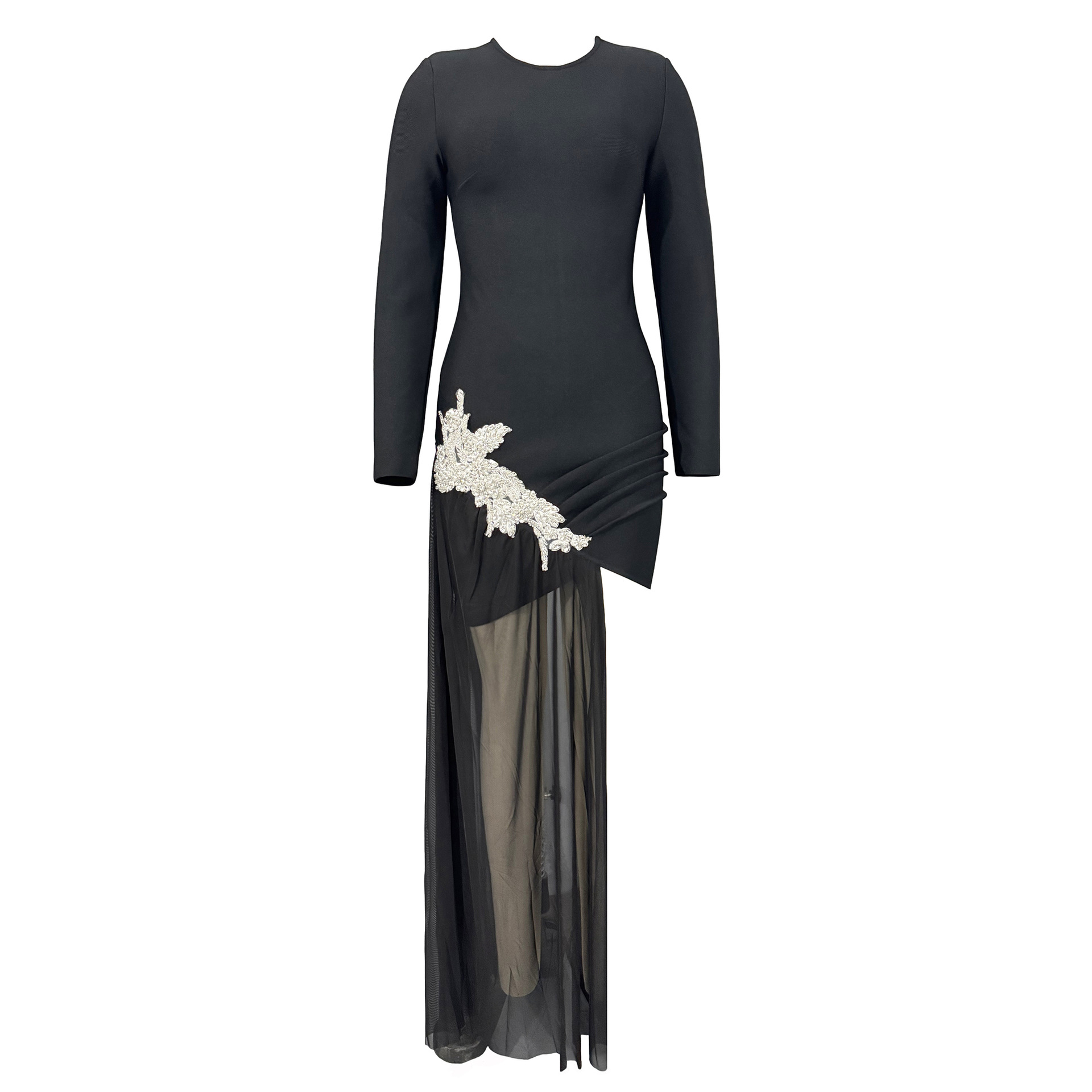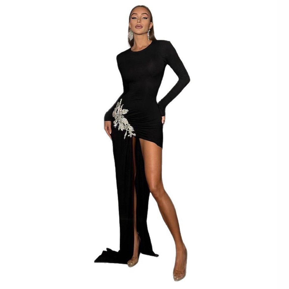 Cross border European and American fashion diamond studded slim fit long sleeved bandage skirt sexy mesh splicing hip hugging dress party dress