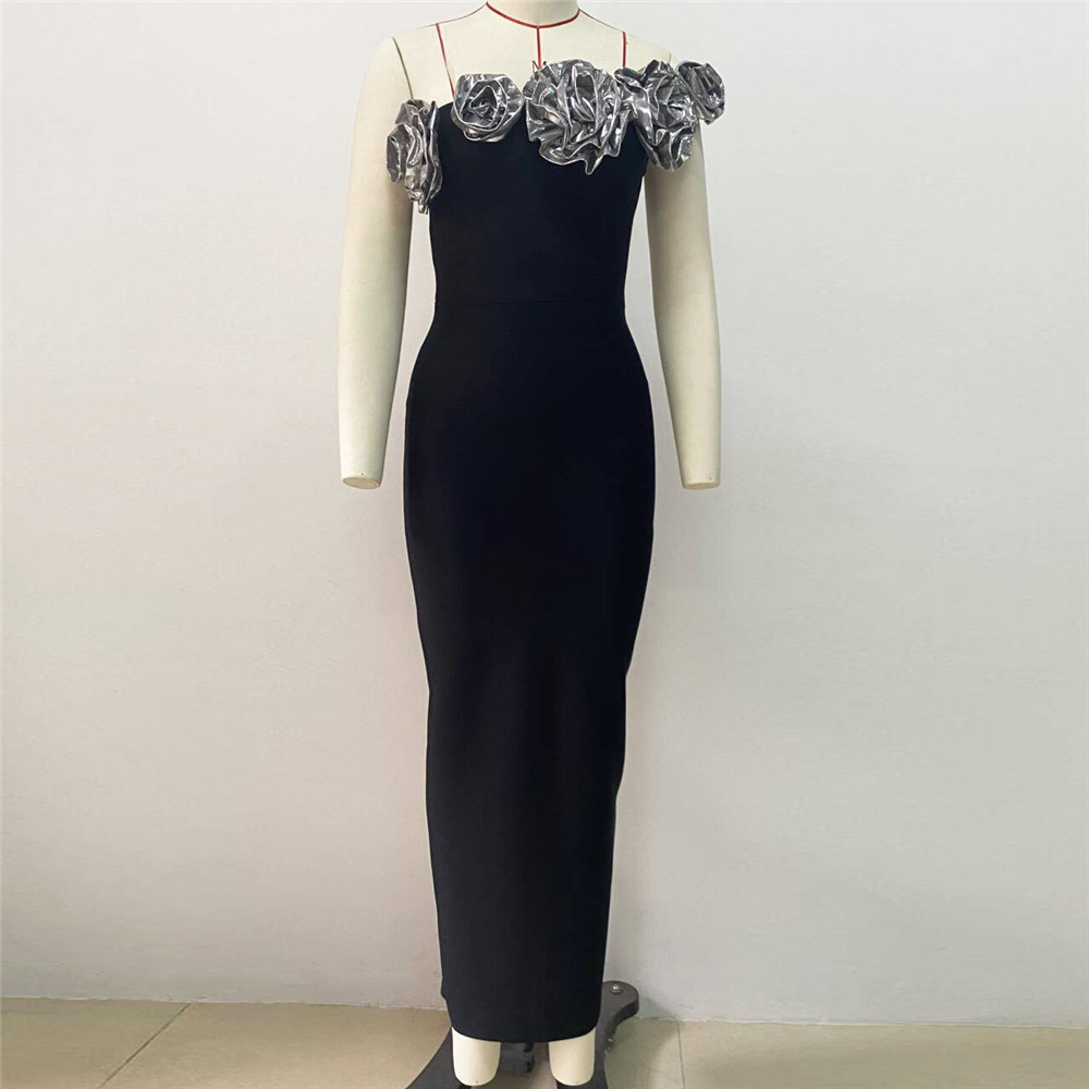 European and American new 2024 design sense three-dimensional gold flower sloping shoulder sleeveless bandage dress party dinner dress