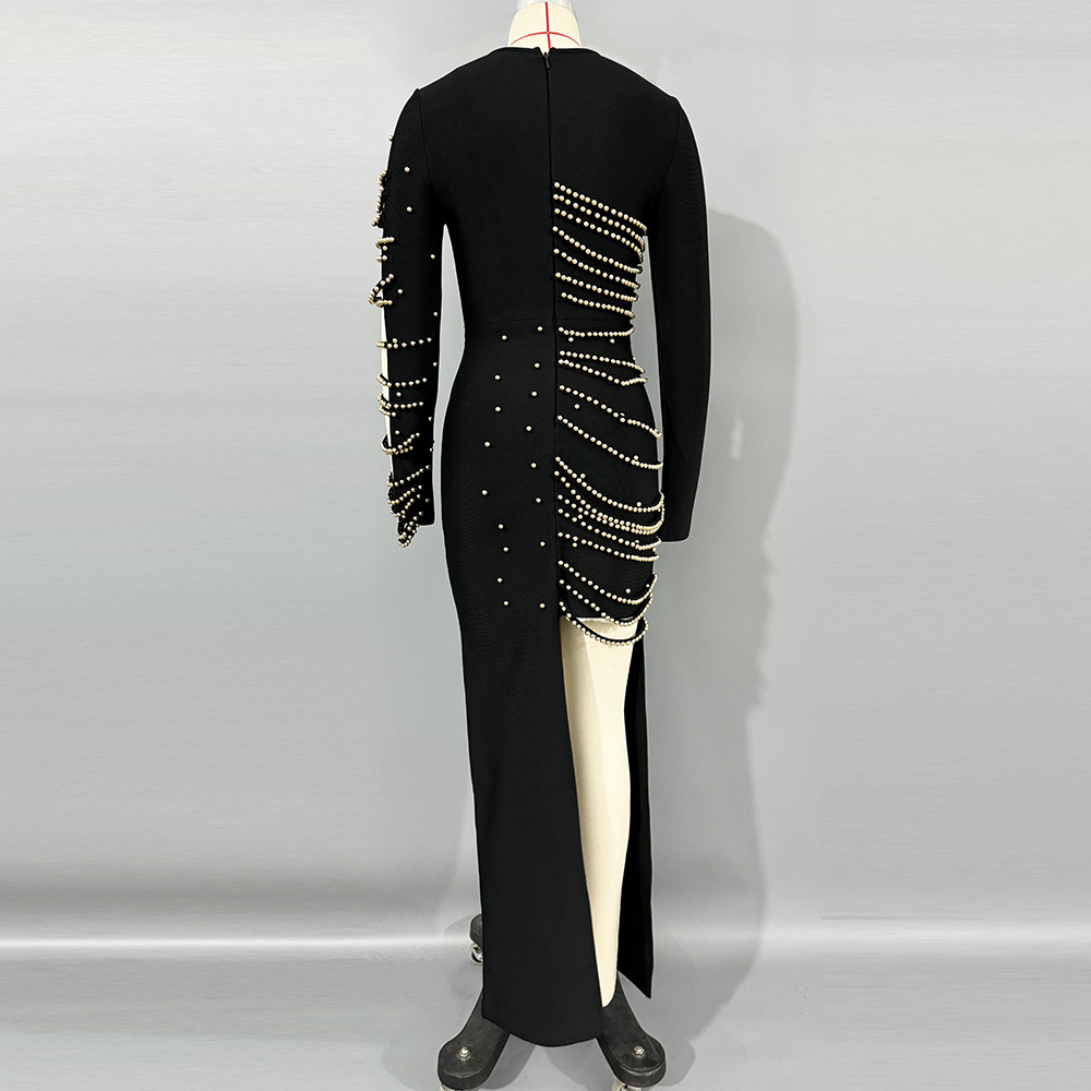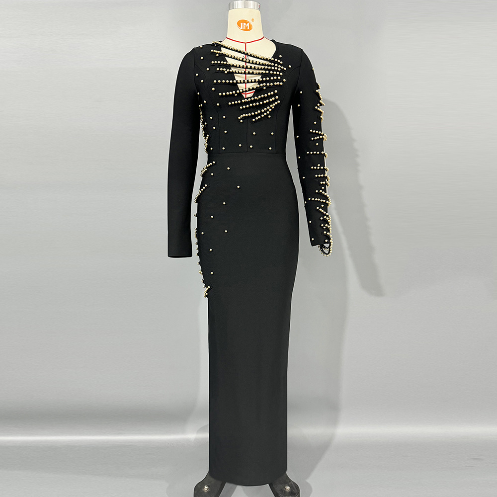 European and American cross-border new sexy V-neck hollow out heavy industry nail bead long sleeved bandage skirt socialite banquet evening gown jumpsuit
