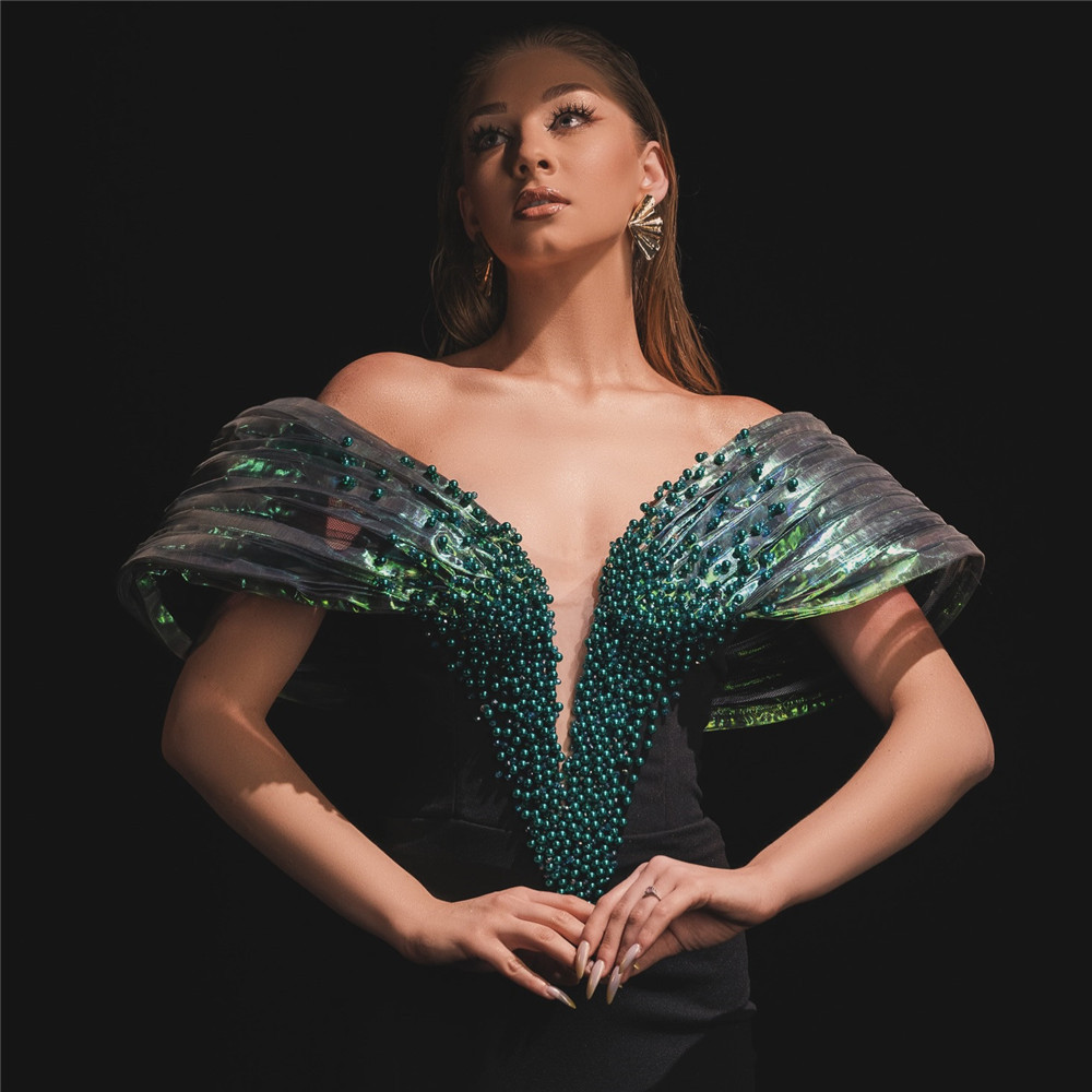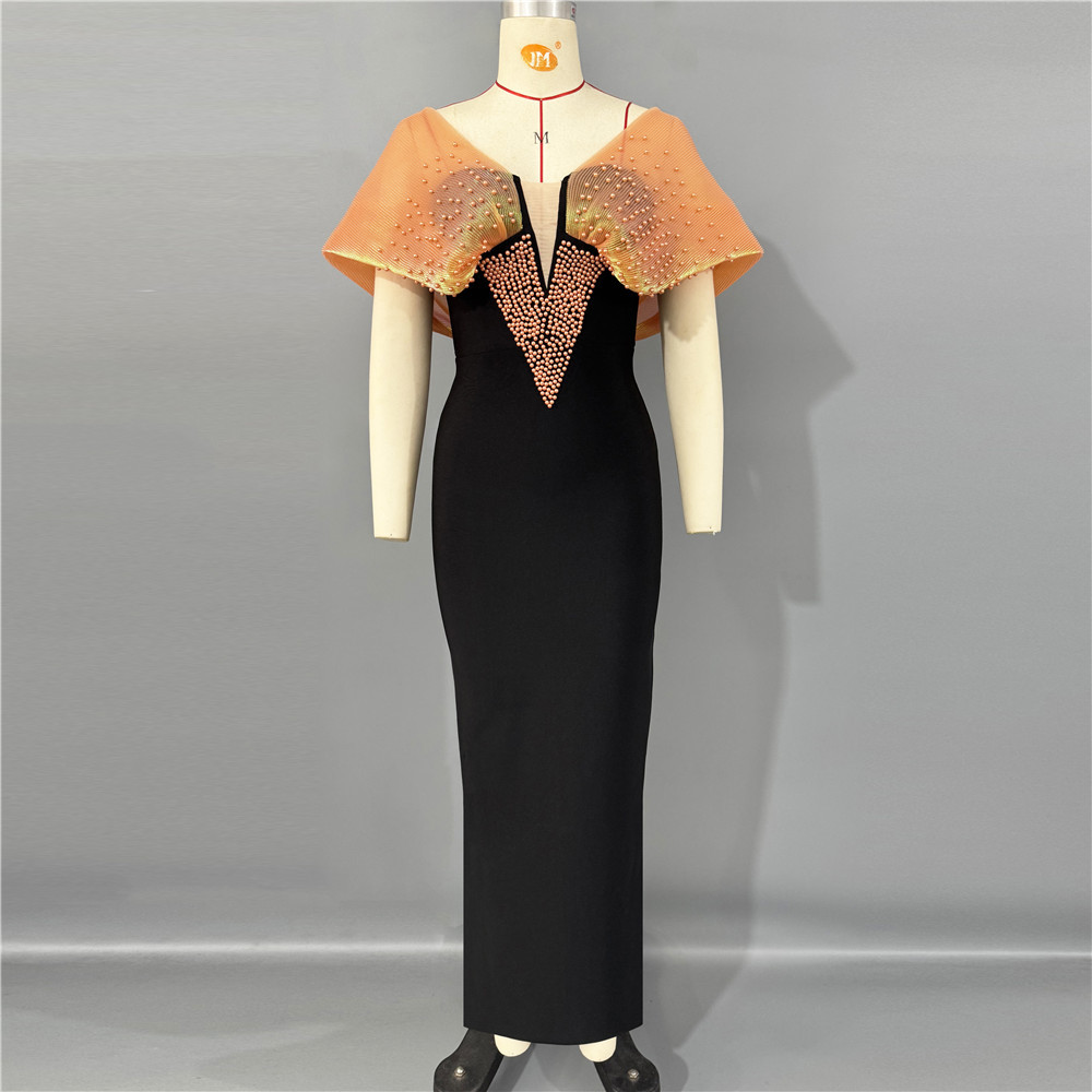 Cross border European and American new sexy V-neck nail bead design sense splicing bandage skirt banquet party evening dress long skirt