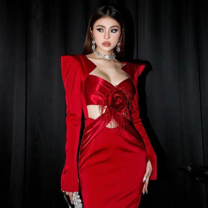 New European and American style bandage dress Christmas women's temperament long skirt sexy long sleeved hollow evening dress Amazon