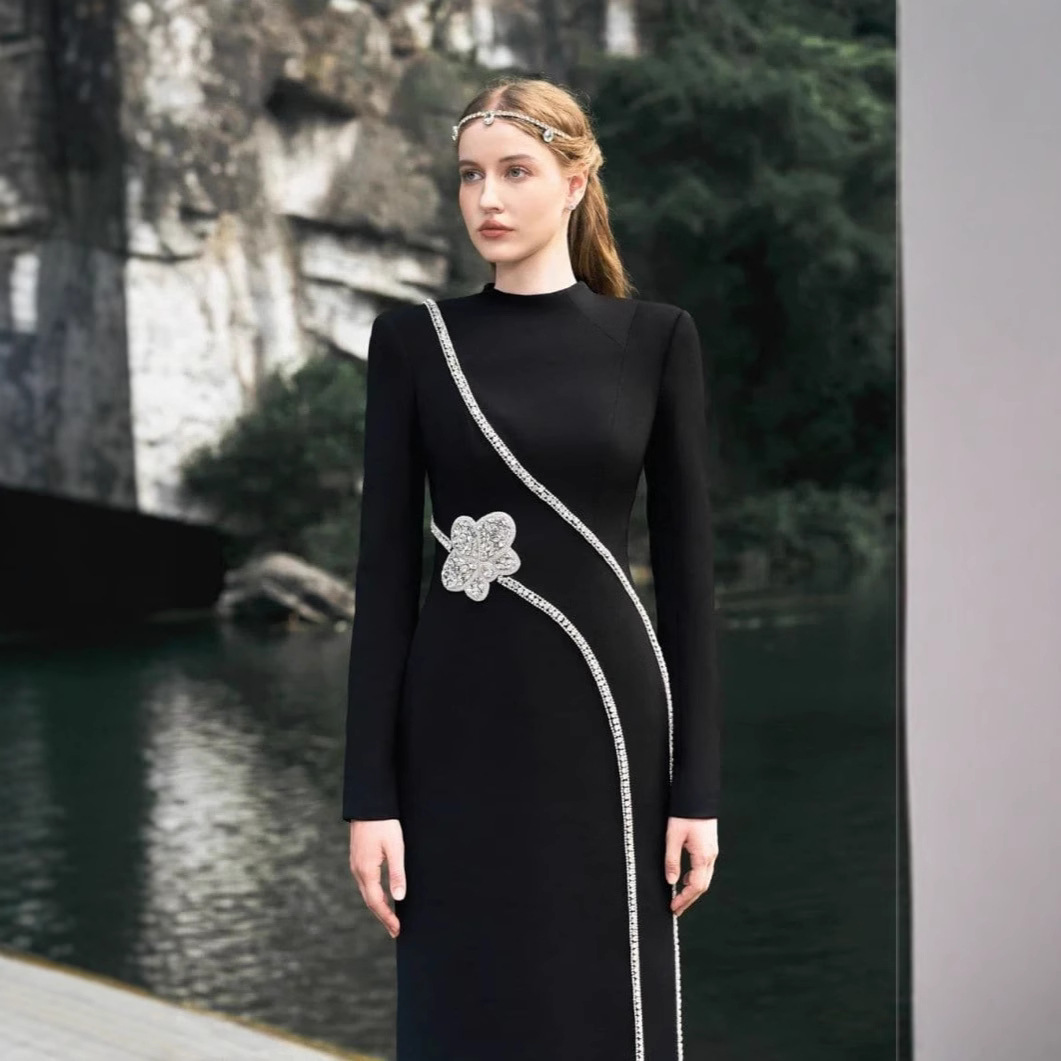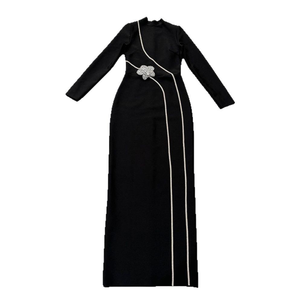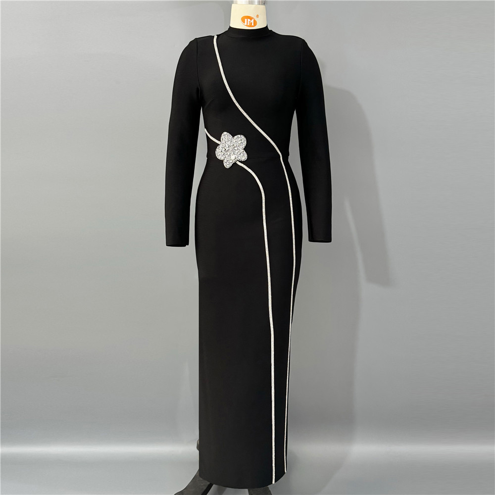 European and American new long sleeved slim fit slit bandage dress temperament nail bead inlaid diamond long skirt dress cross-border