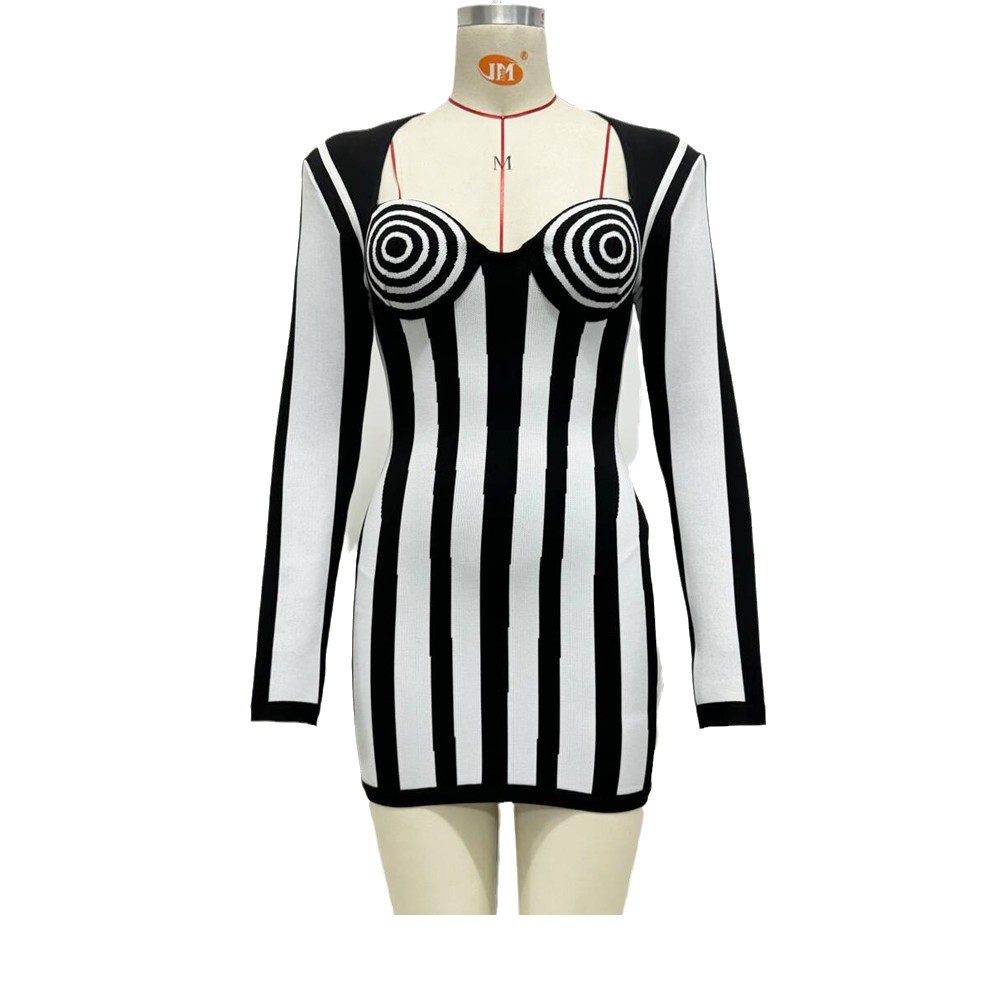 New black and white vertical stripe bandage dress, elegant and fashionable design for European and American high streets, party dress, foreign trade