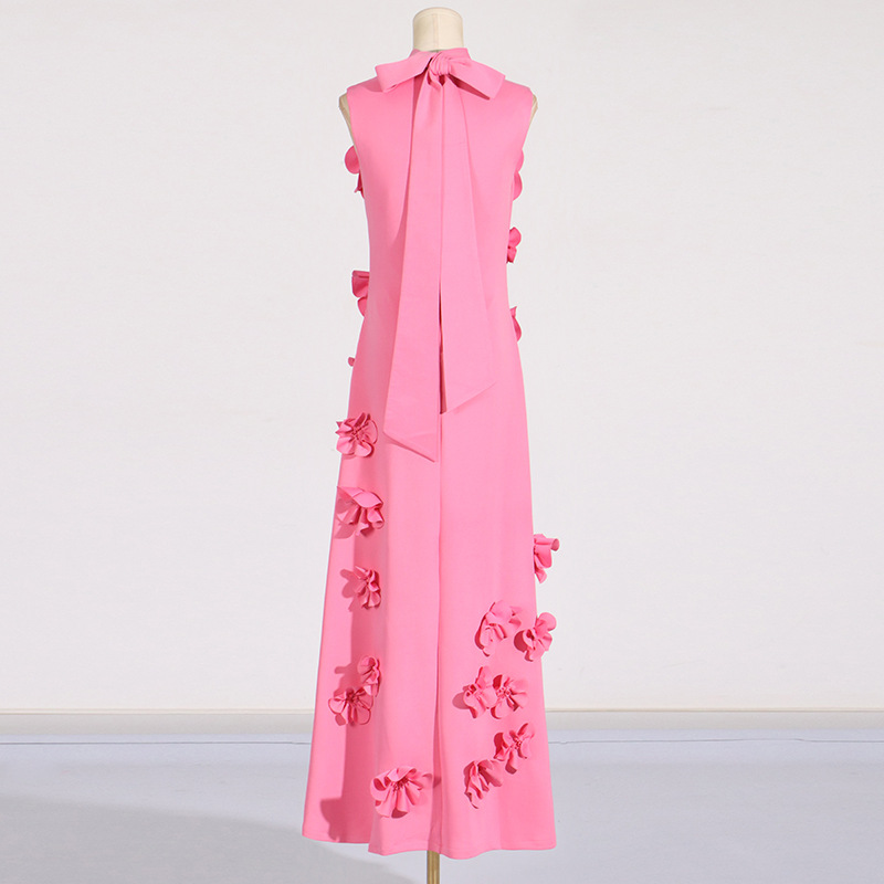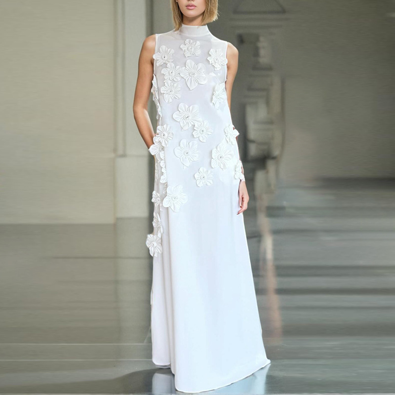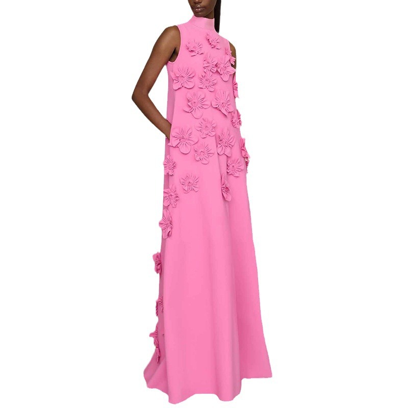 Elegant temperament, stand up collar sleeveless solid color long dress, 2025 new three-dimensional flower collage design, long dress