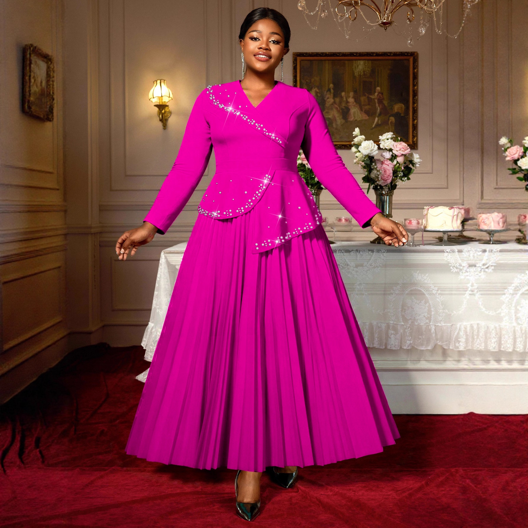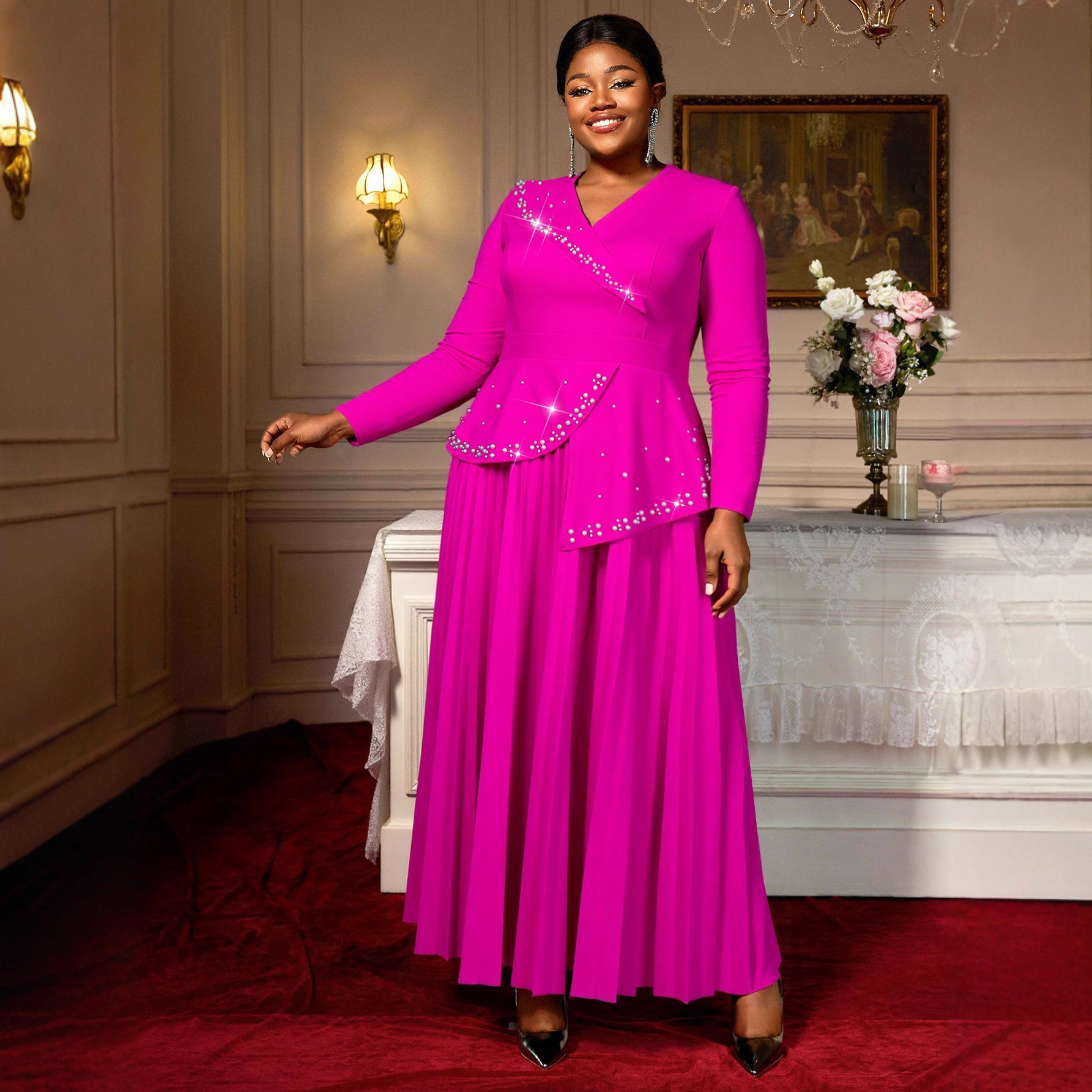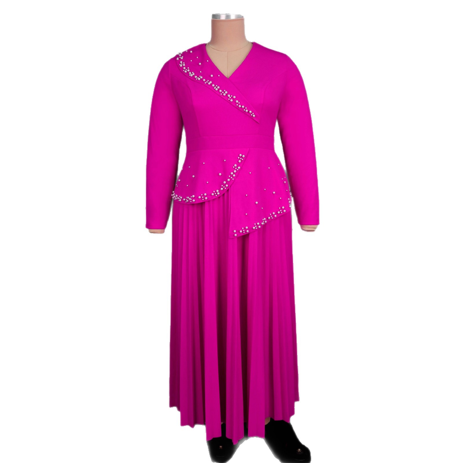 European and American plus size women's collar, rose red nail bead pleated skirt, ruffle edge A hem, slimming dress, Dresses