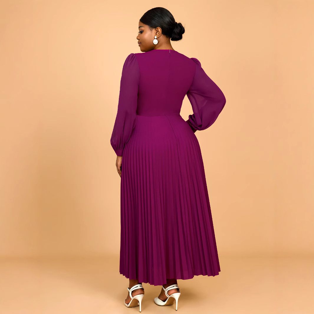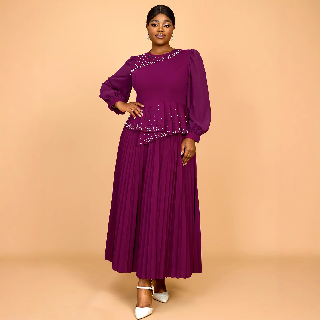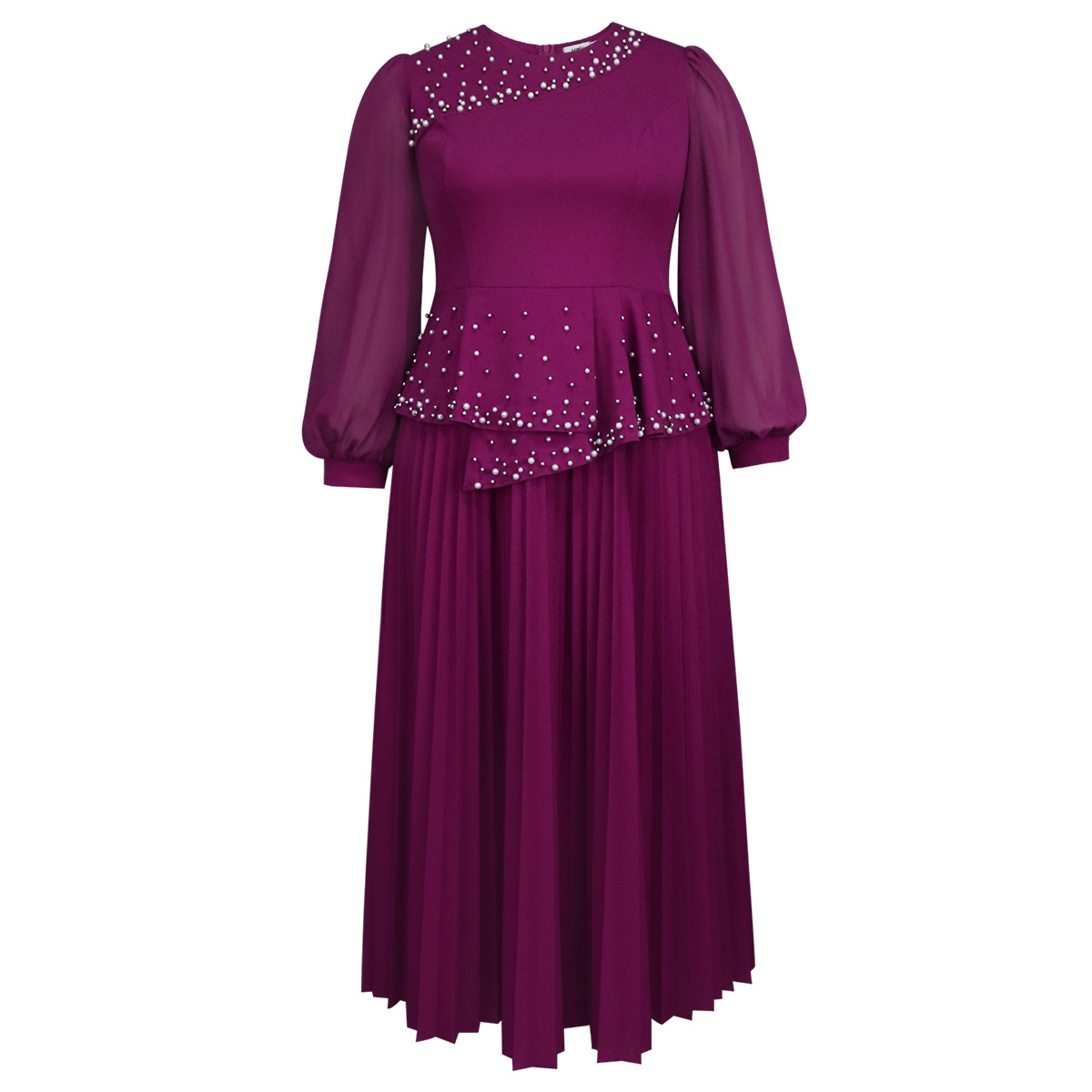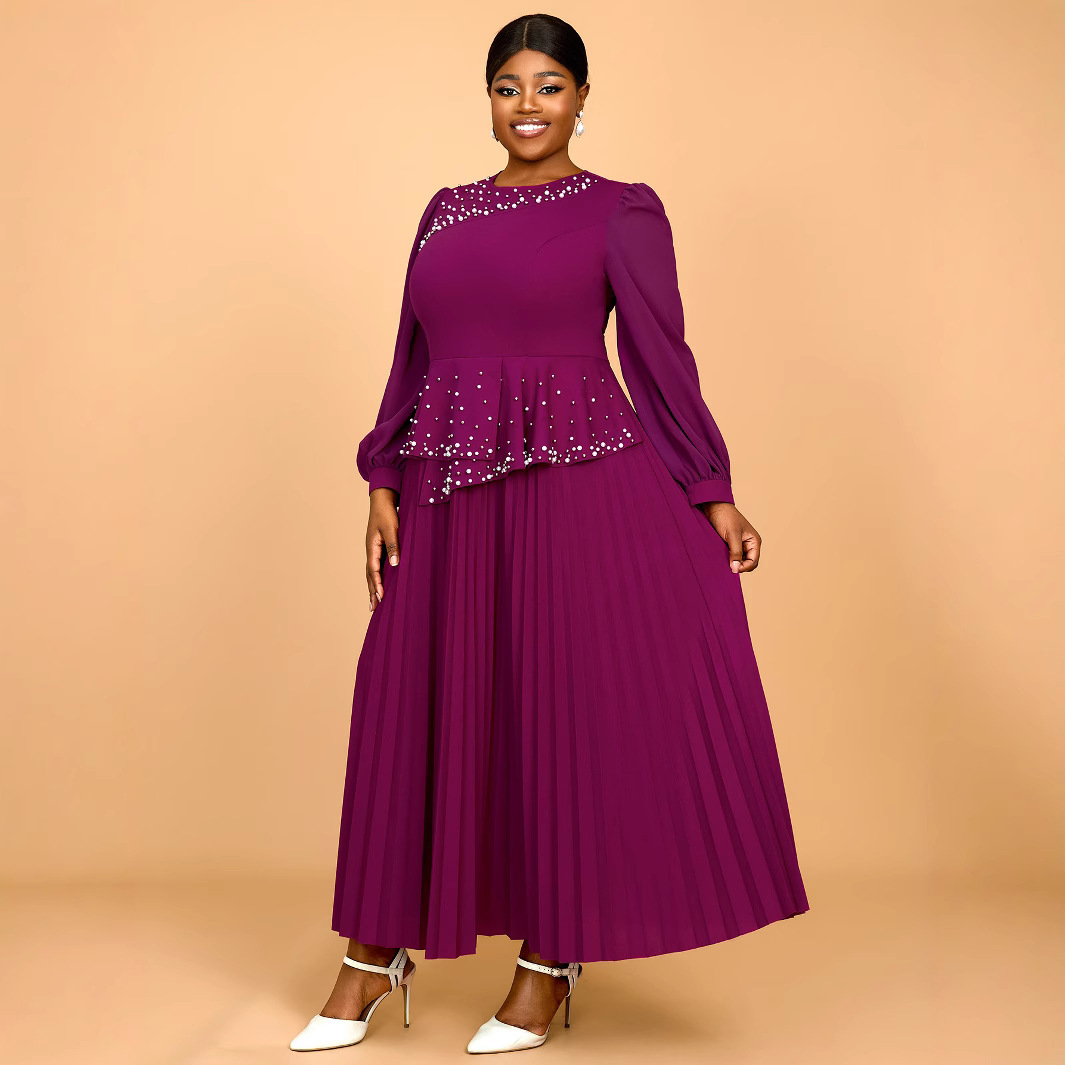 AM041203 Cross border plus size European and American ruffle edge dress, round neck nail bead pleated skirt, luxury dress