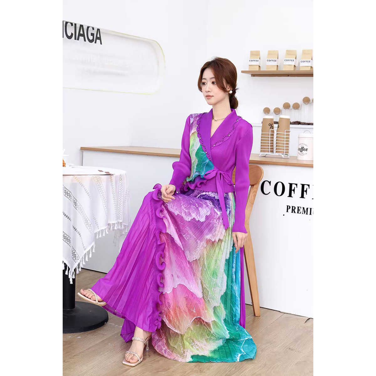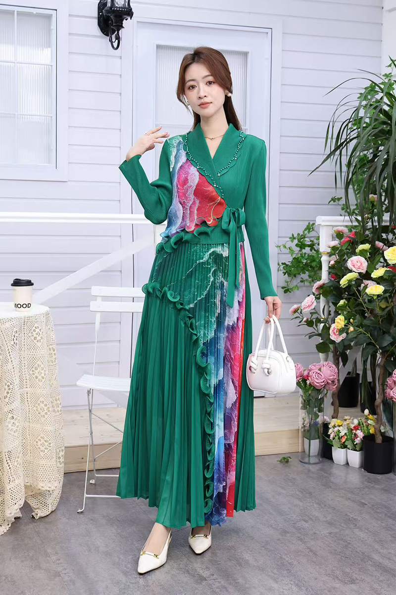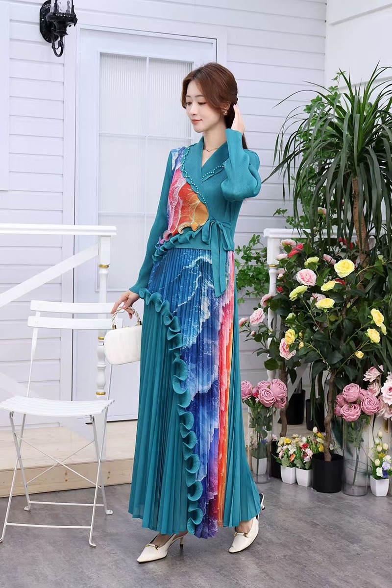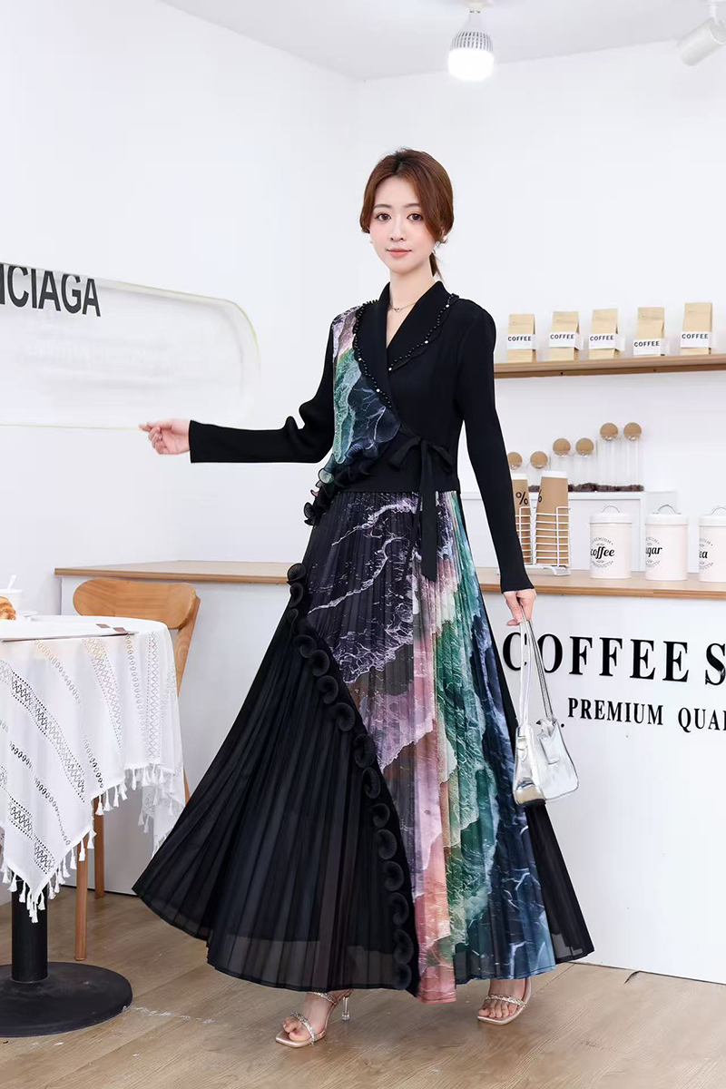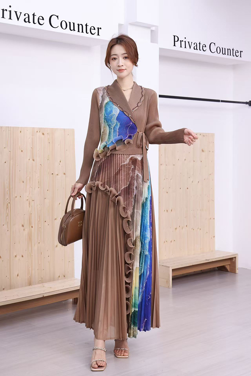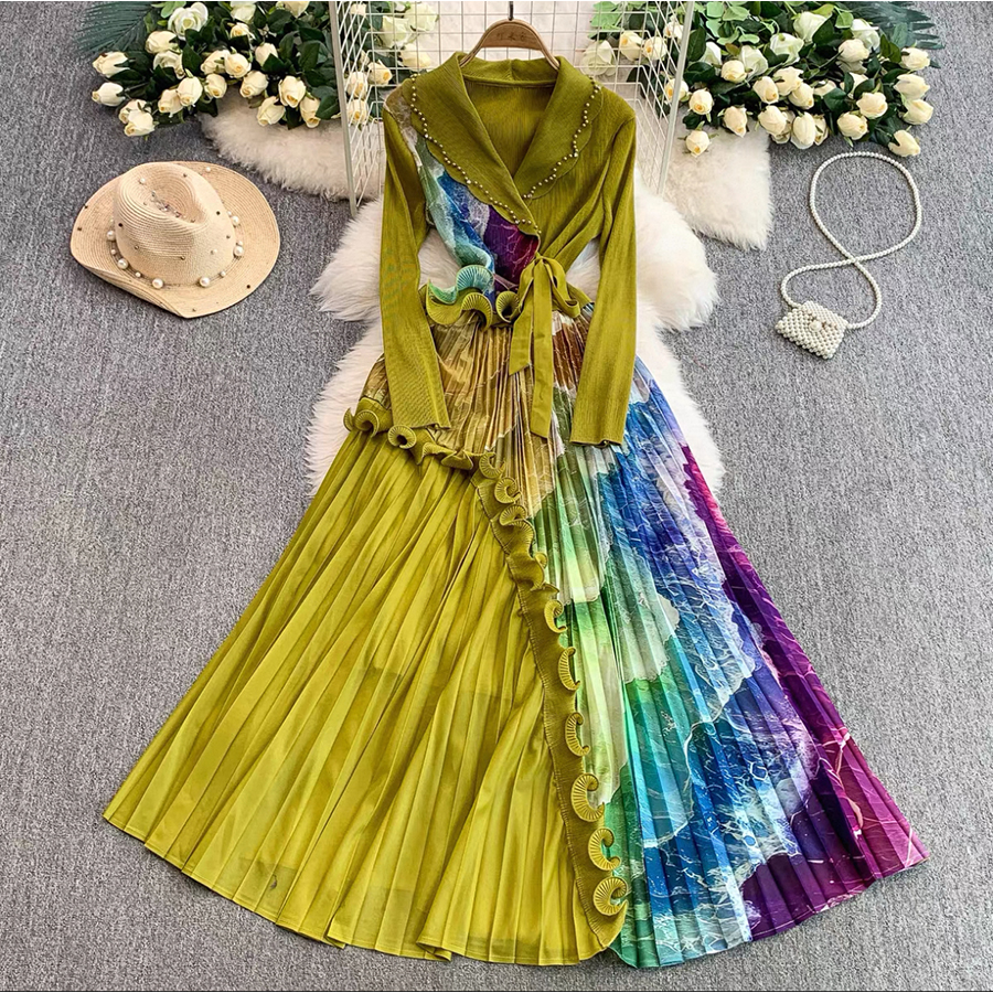 Miyake Europe and America Cross border Heavy Industry Mushroom Edge Nail Bead V-neck Waist Fold Printed Dress Design Feel Lotus Leaf Edge