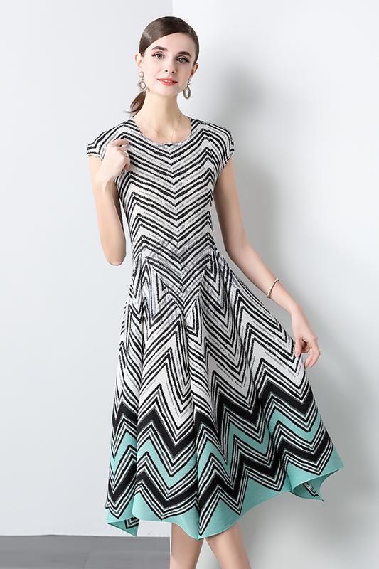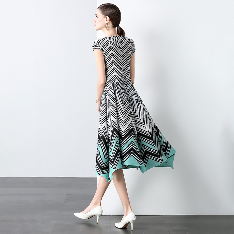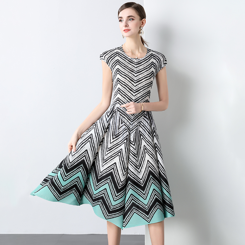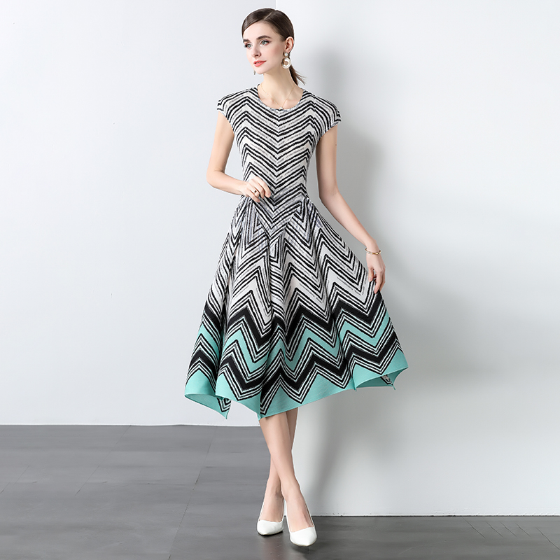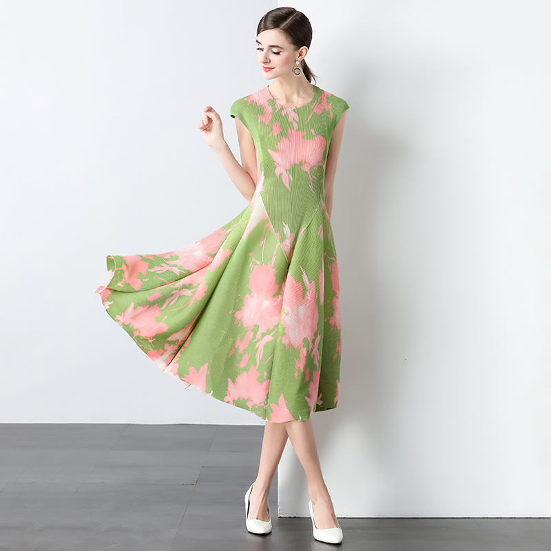 Sanzhai Foreign Trade Fashion Wrinkle Dress 2025 New Round Neck Sleeve Printed Waist Shrinking and Slimming Puff Skirt