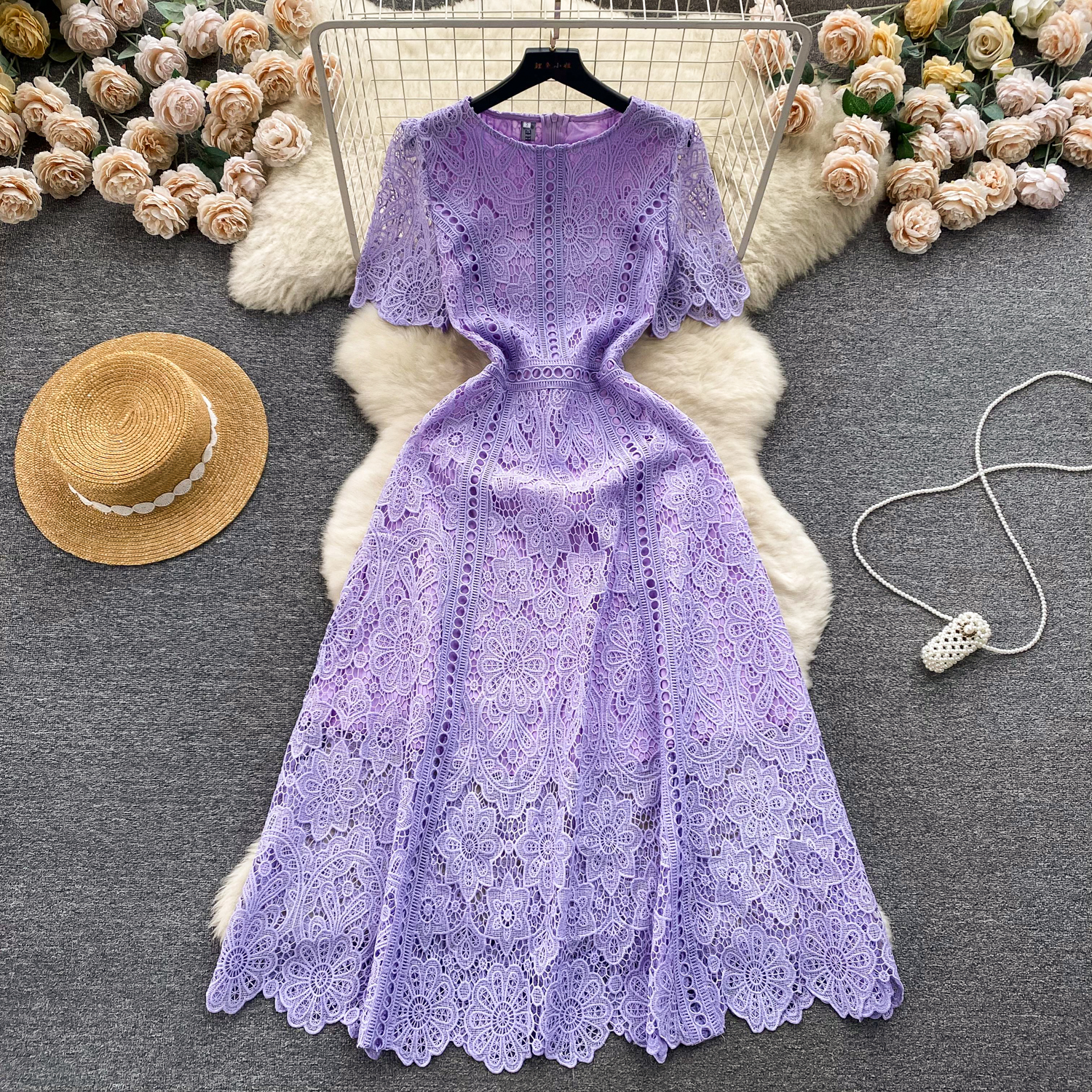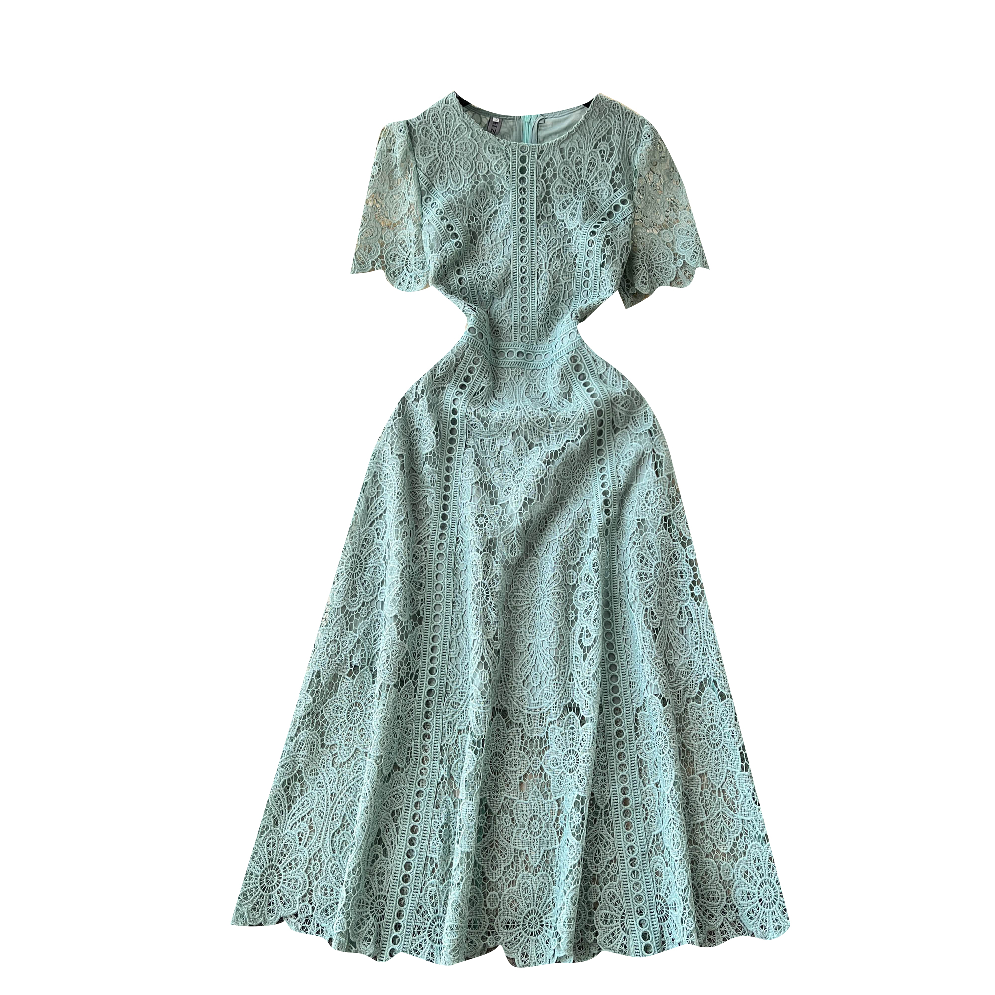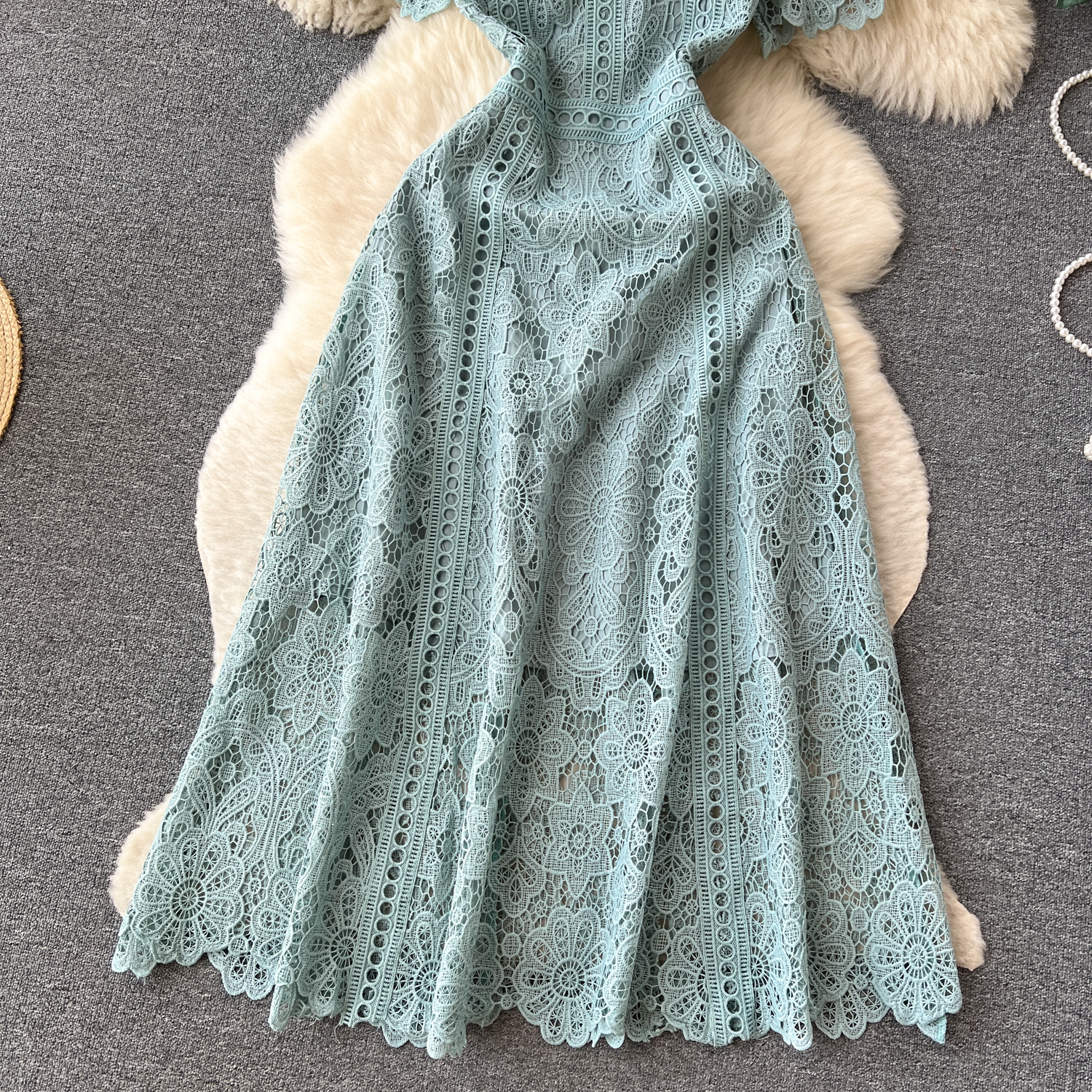 A niche retro high-end round neck lotus leaf sleeve lace dress for women's summer new style, slimming and elegant long skirt