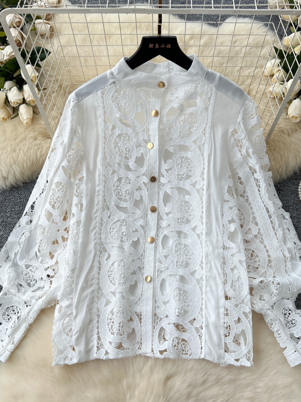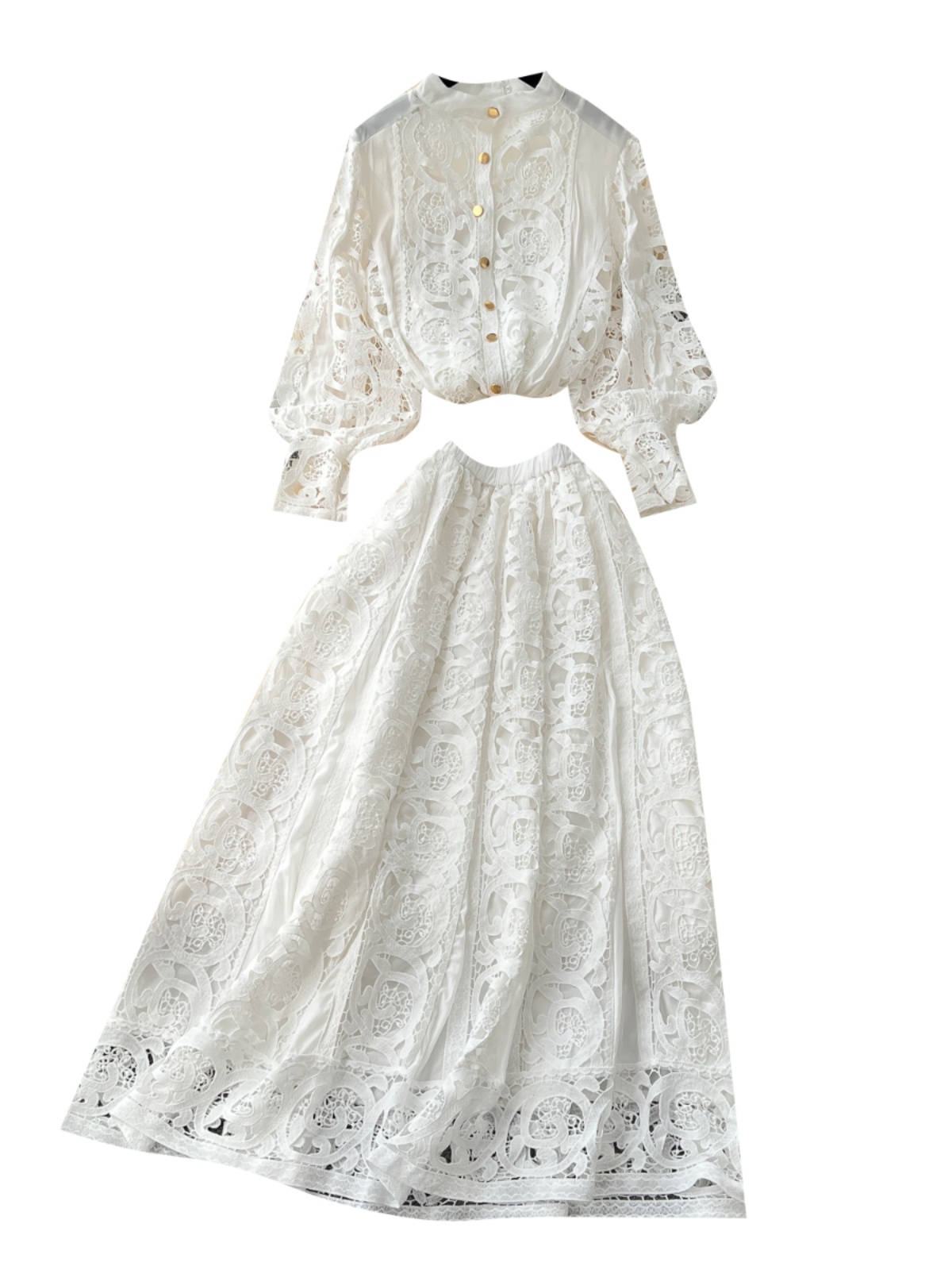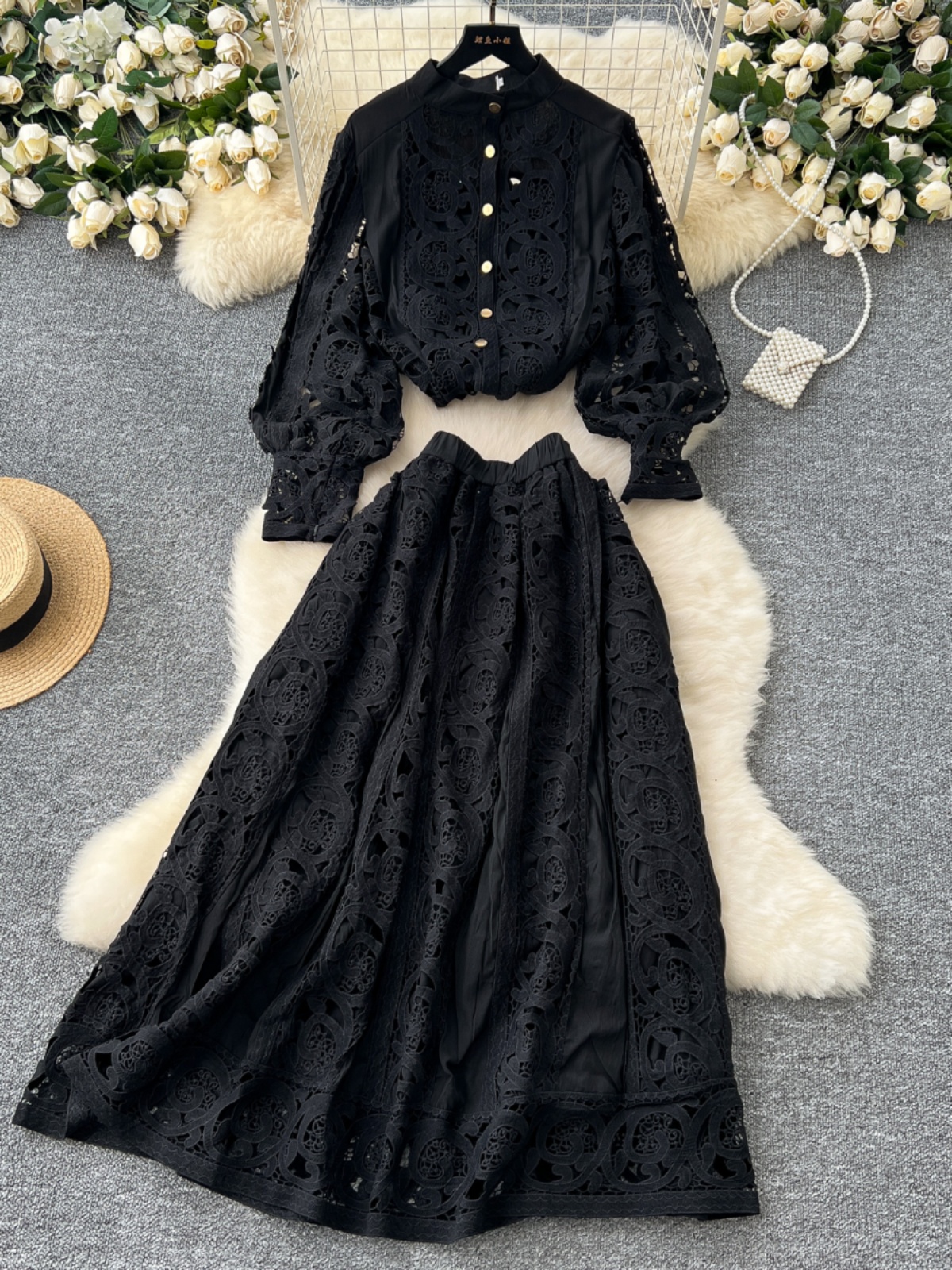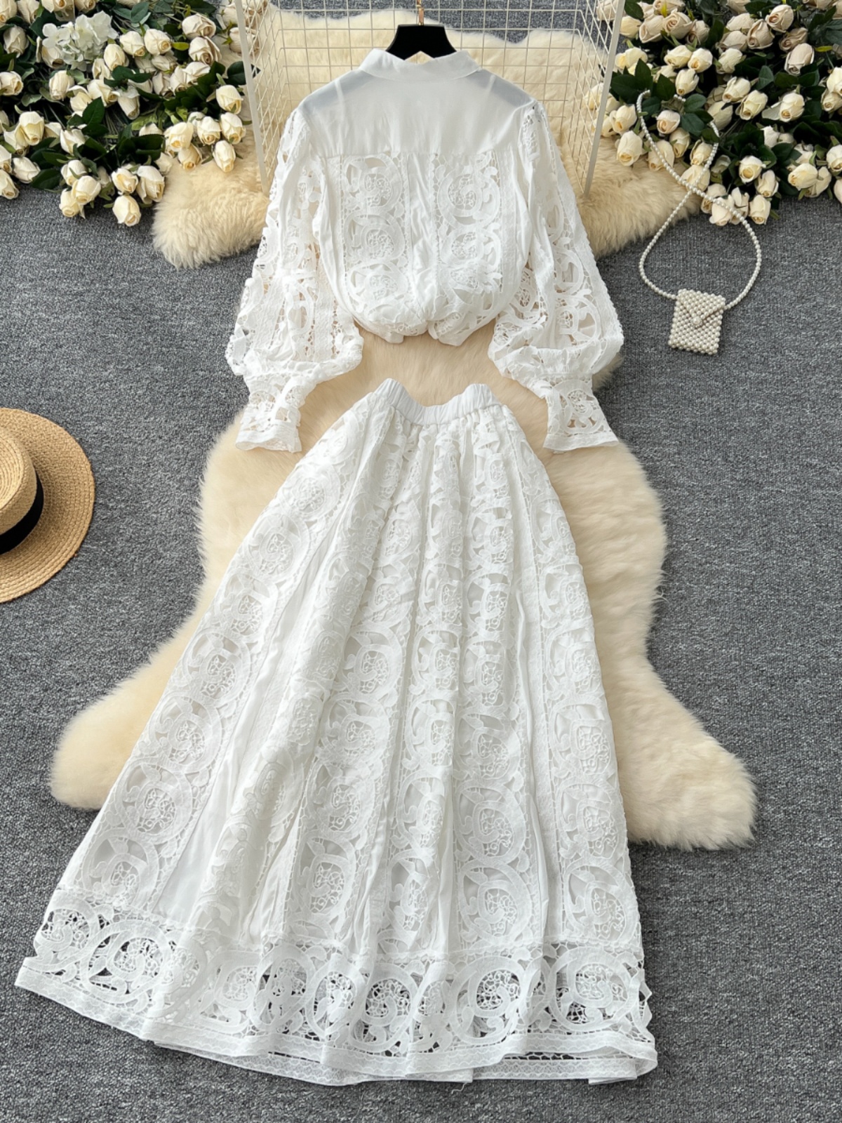 French and Western style anti-aging suit for women, featuring a hollowed out hook flower lace lantern sleeve shirt and a high waisted knee high skirt