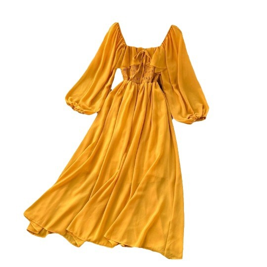 CHIC Gentle Style Dress Spring and Autumn New Women's French Retro Square Neck Western Style Bubble Sleeves Chiffon Solid Color Middle Skirt