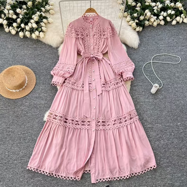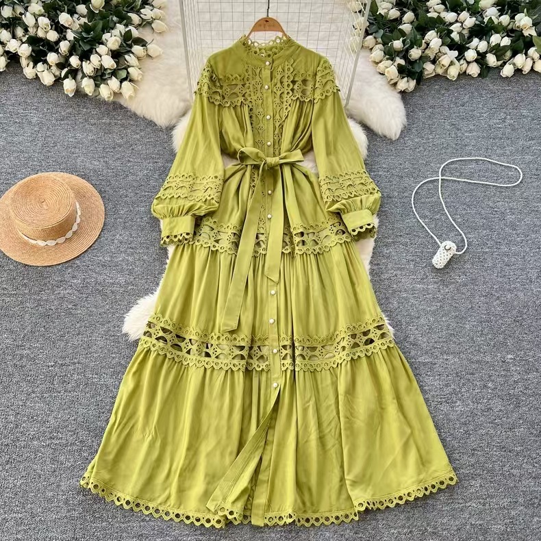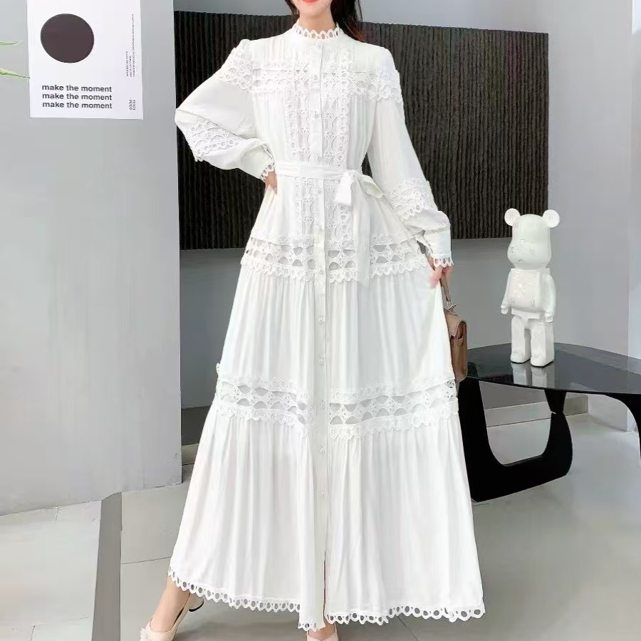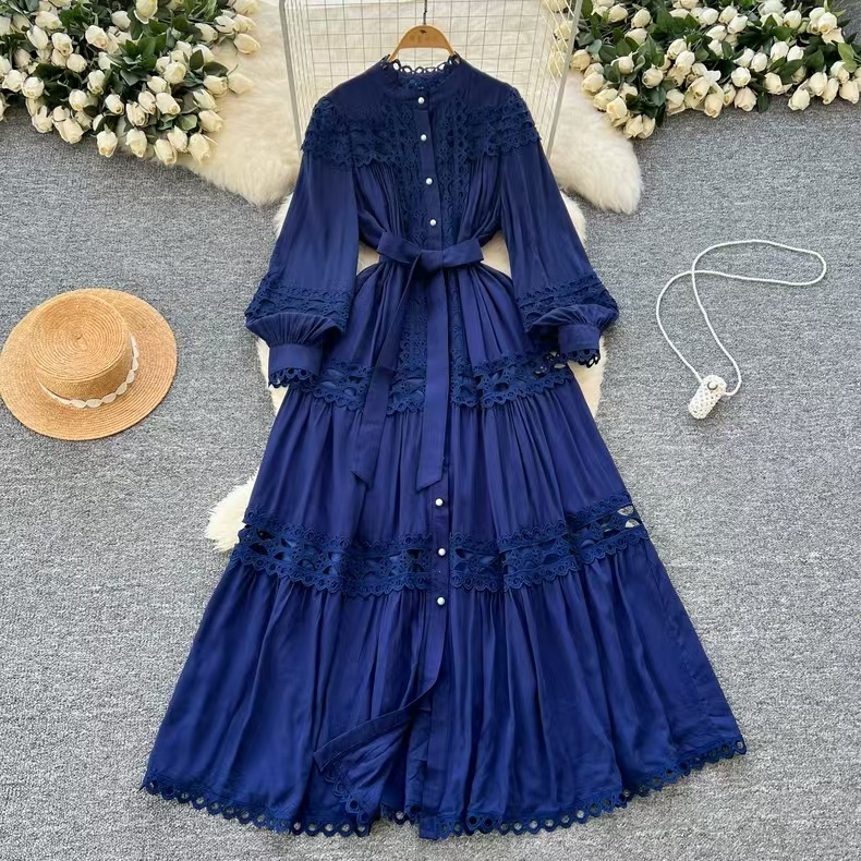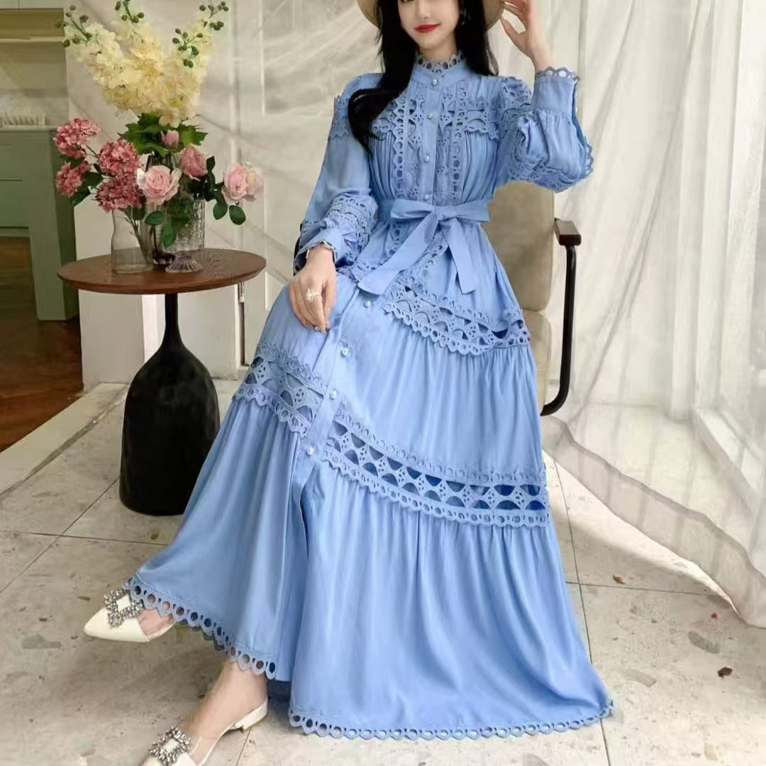 Palace style dress, summer dress, women's heavy industry, hollowed out lace splicing, slim fit, long French lantern sleeve dress, long skirt