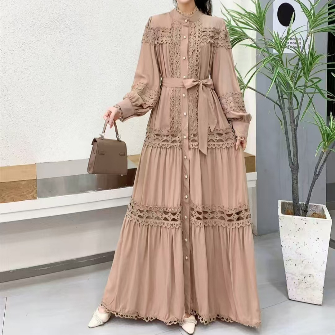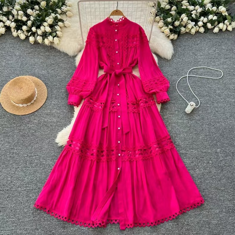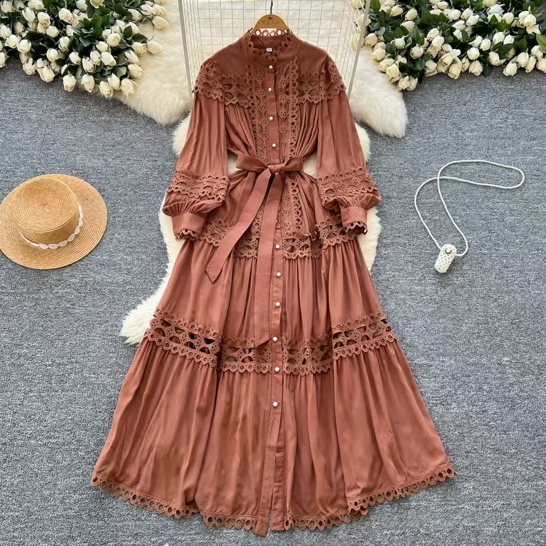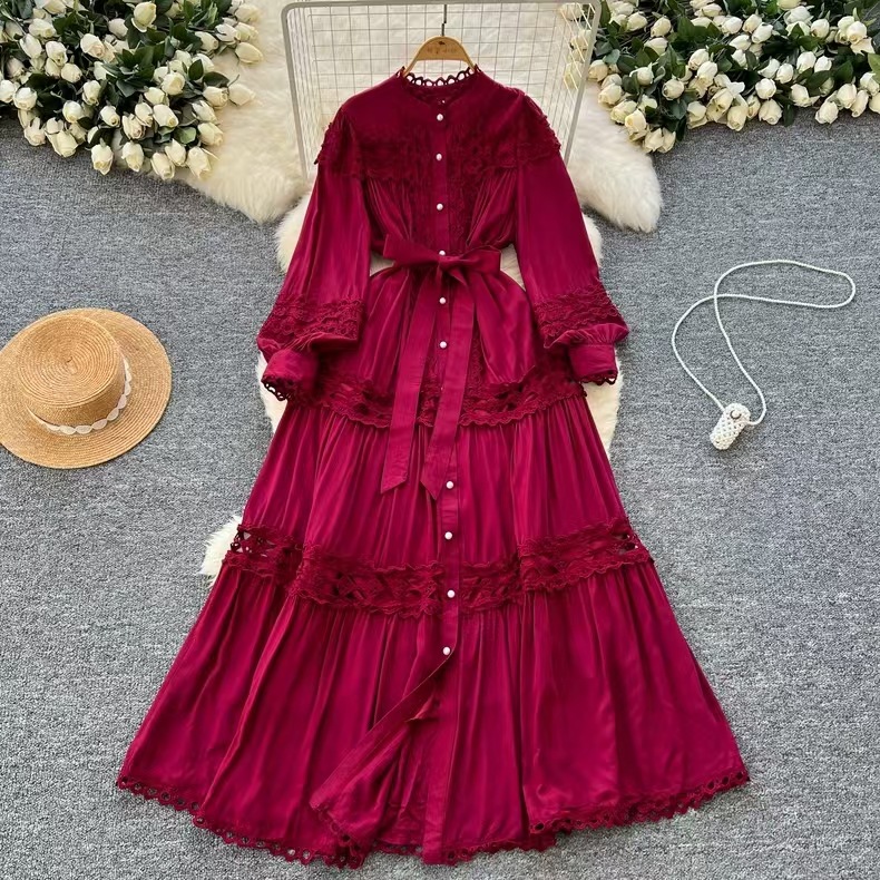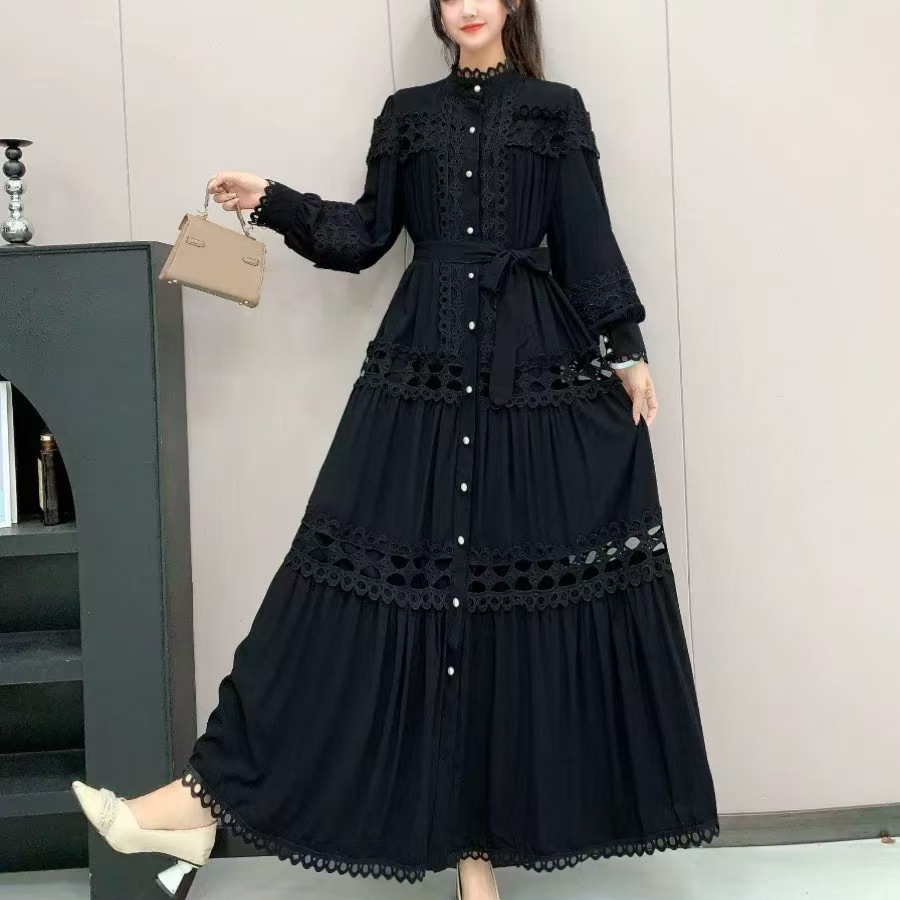 Palace style dress, summer dress, women's heavy industry, hollowed out lace splicing, slim fit, long French lantern sleeve dress, long skirt