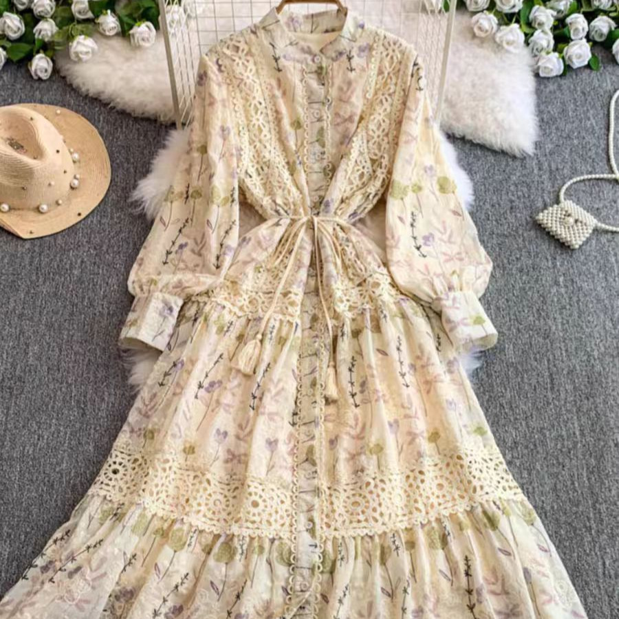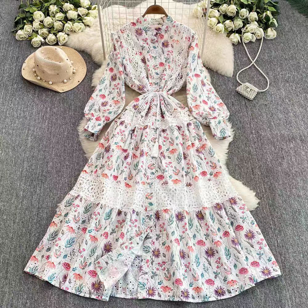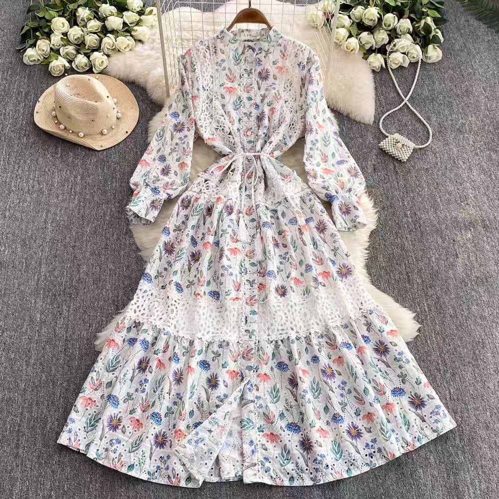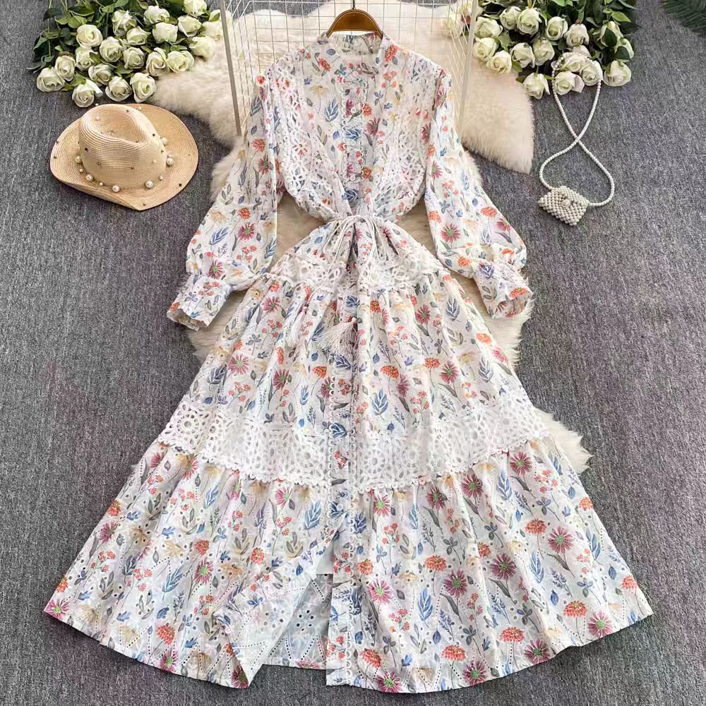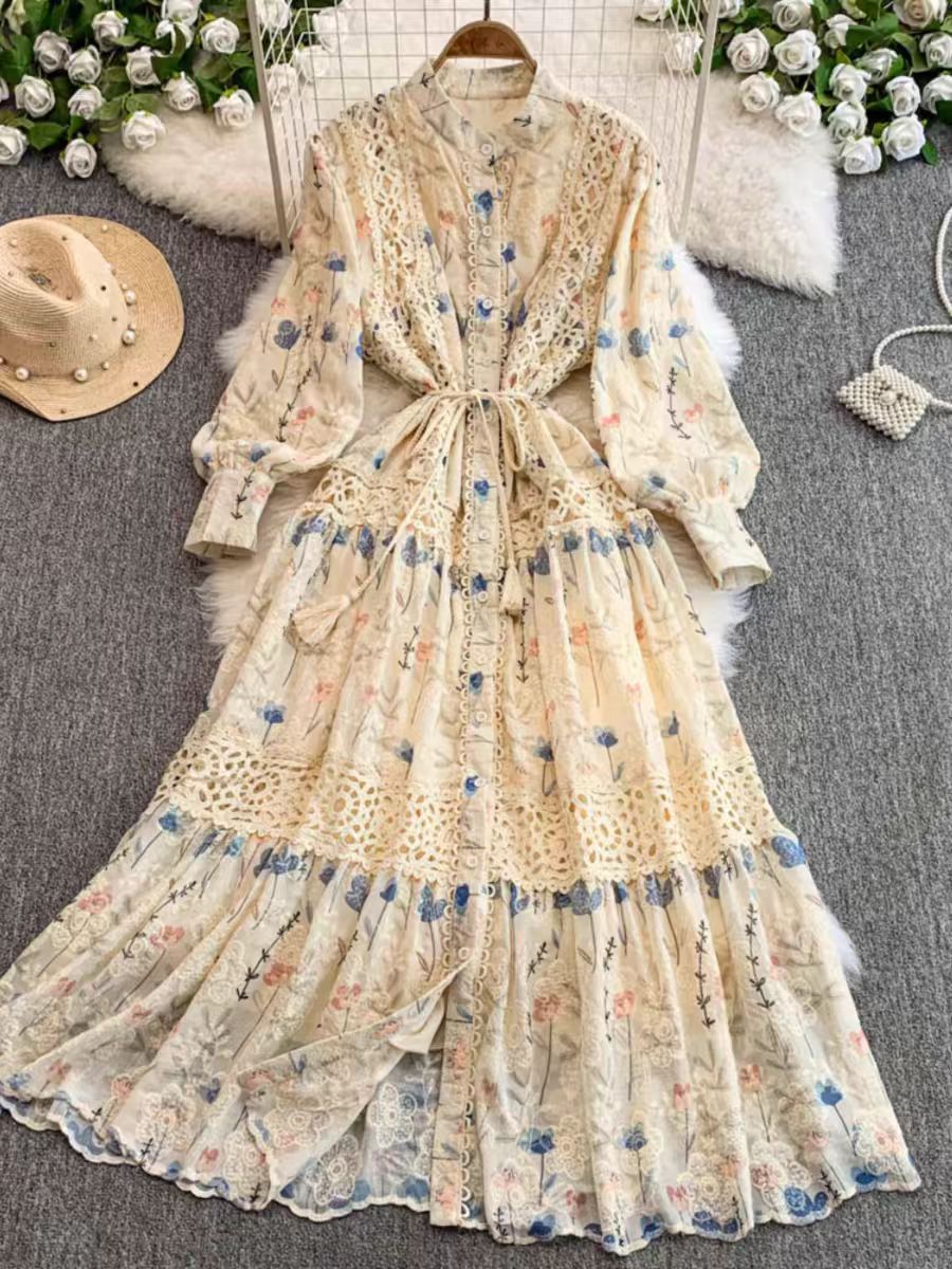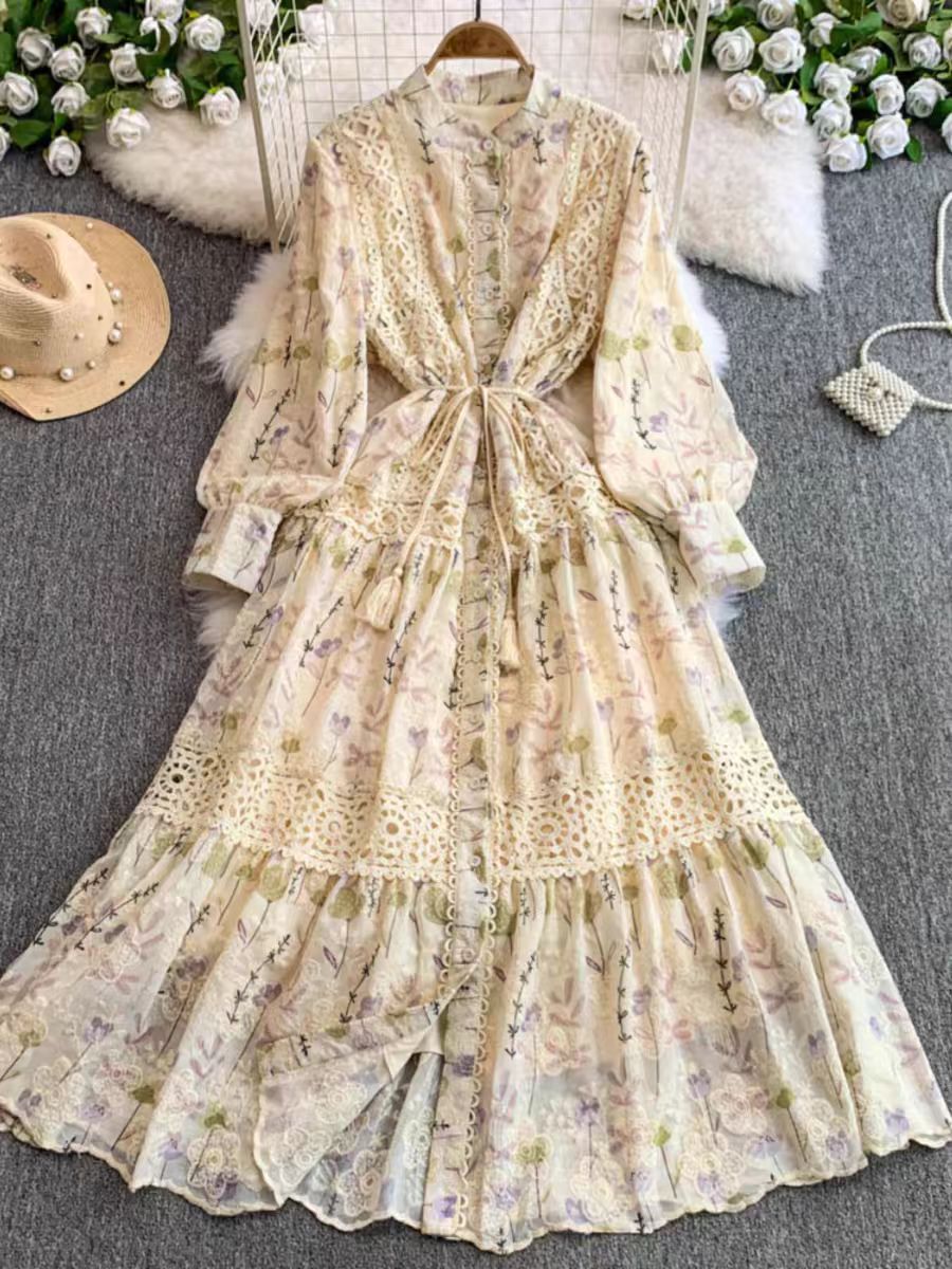 French retro court style hollow lace patchwork lantern sleeve waist cinched single breasted printed dress 2025 spring outfit