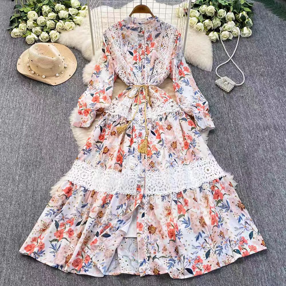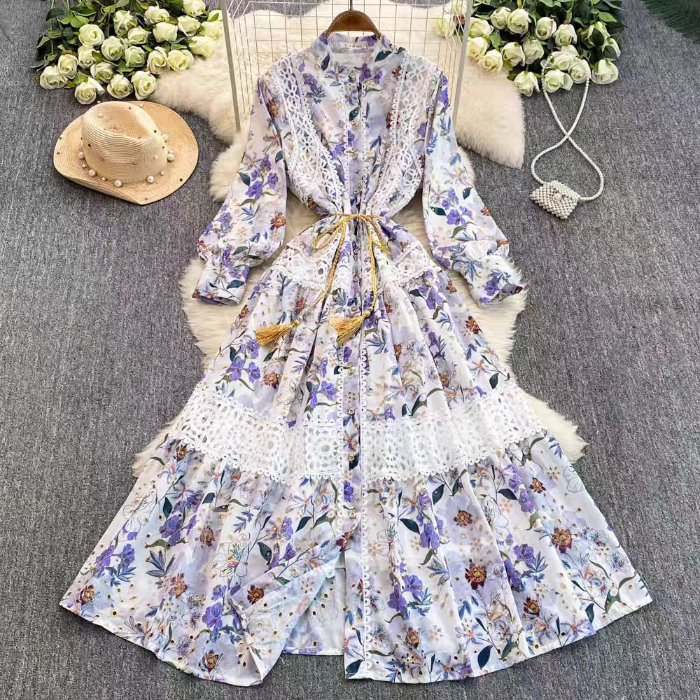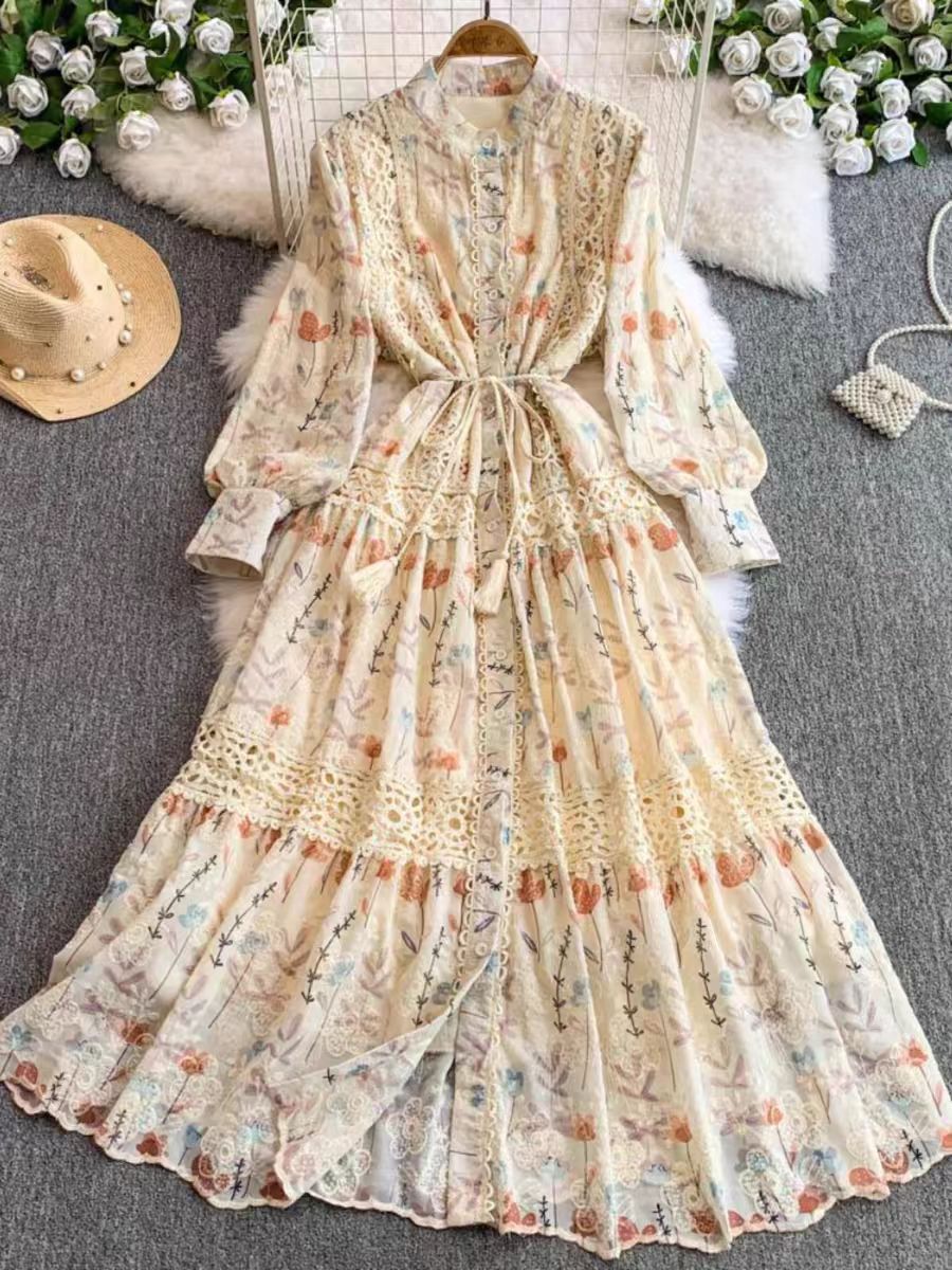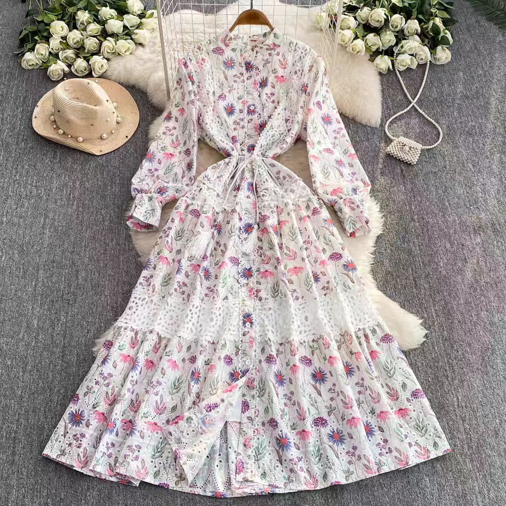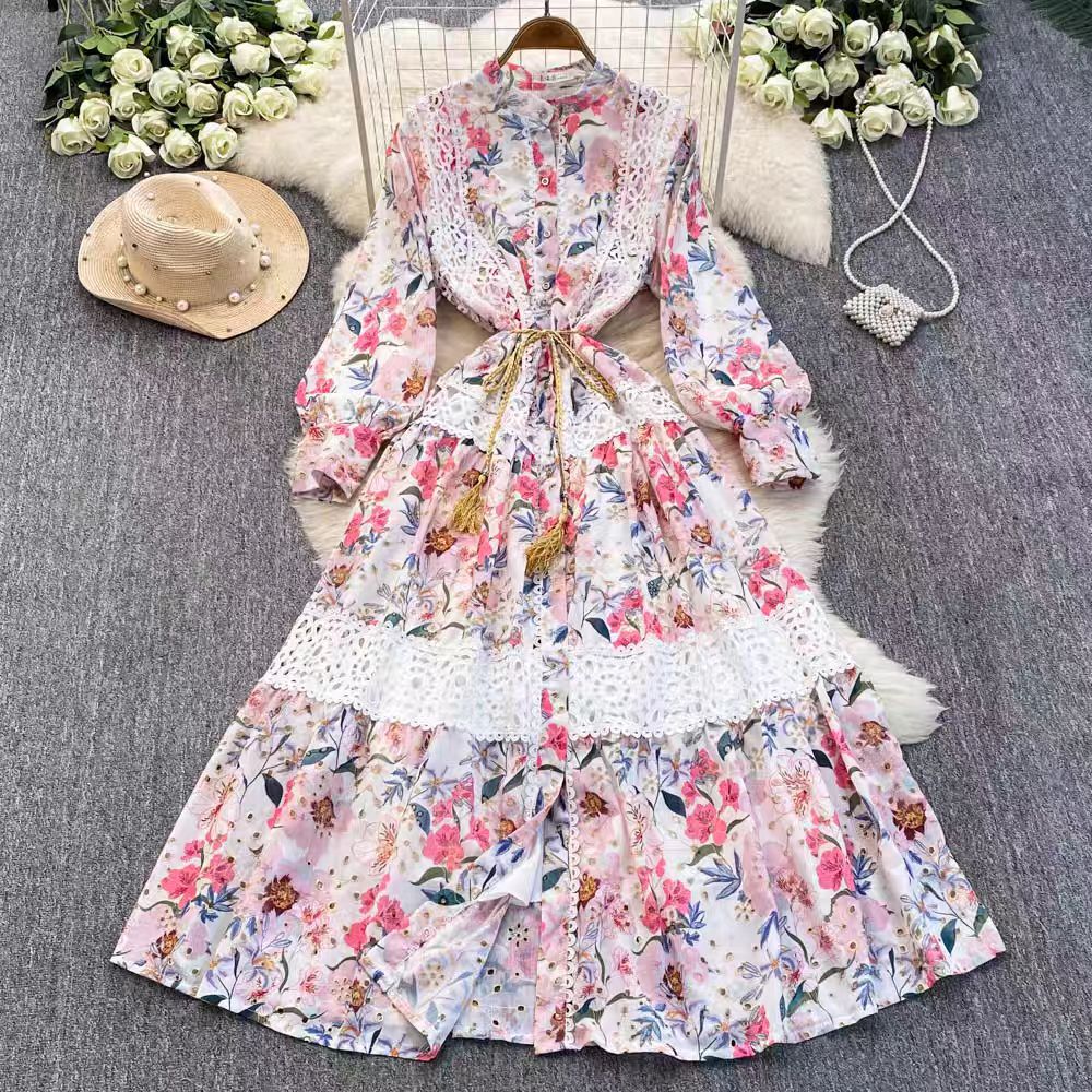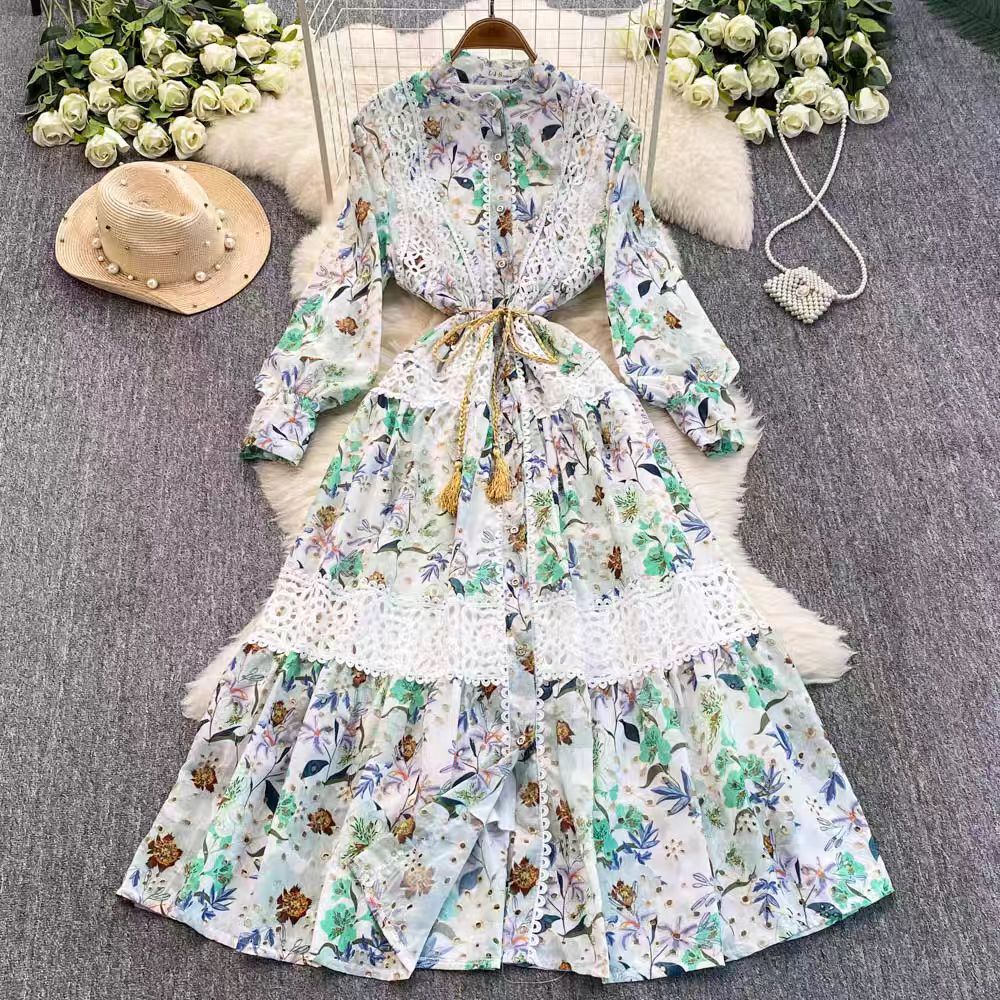 French retro court style hollow lace patchwork lantern sleeve waist cinched single breasted printed dress 2025 spring outfit