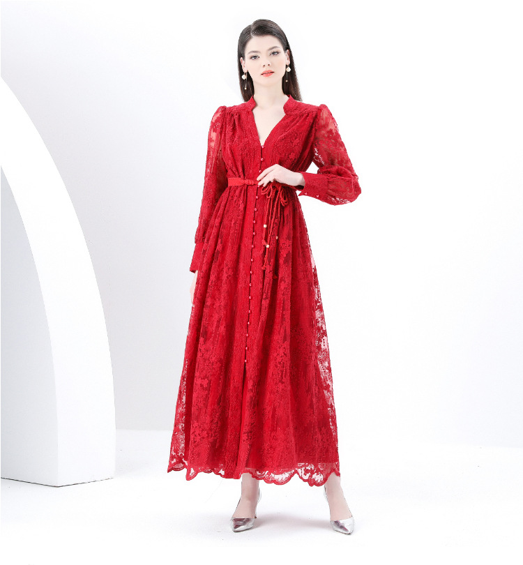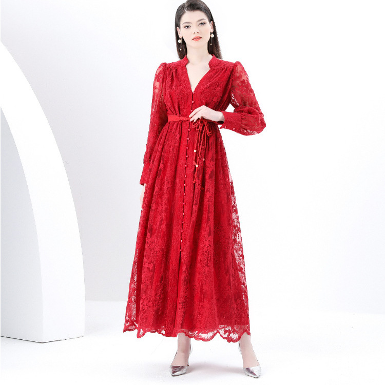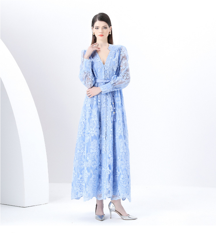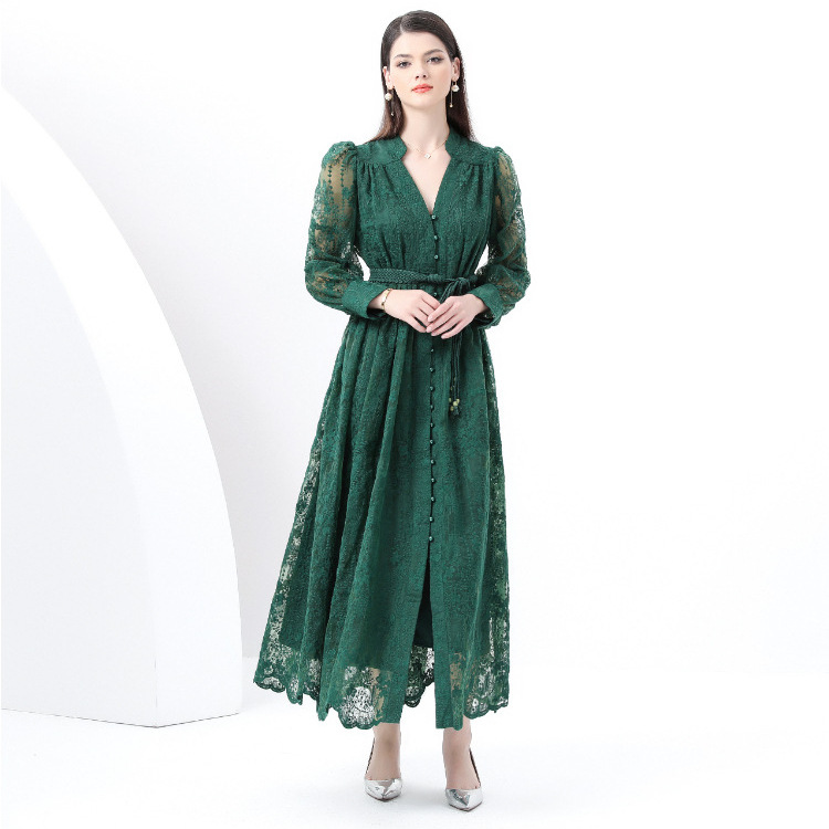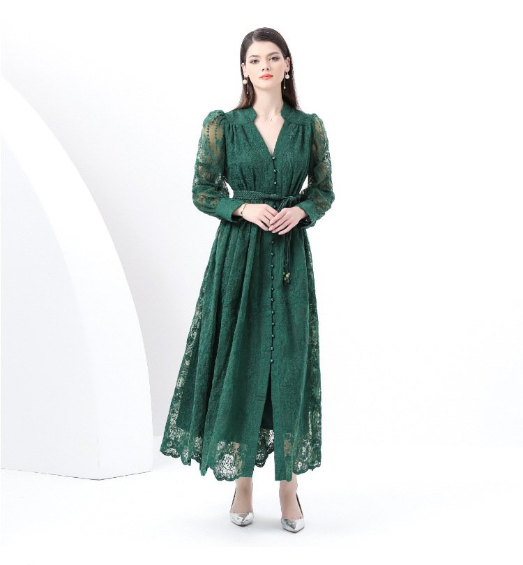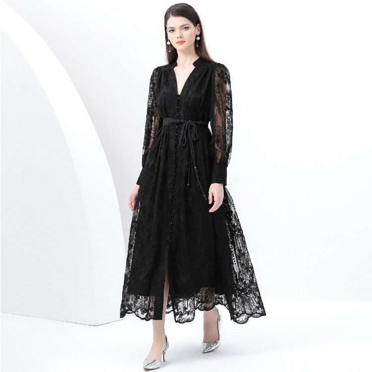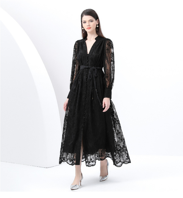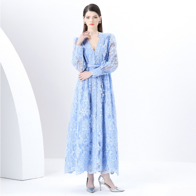French high-end women's dress for spring 2025 with waist cinching, heavy embroidery, V-neck lantern sleeves, single breasted long skirt