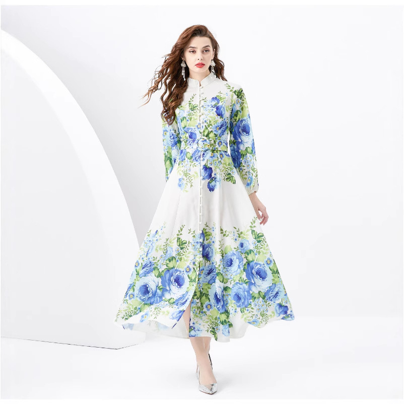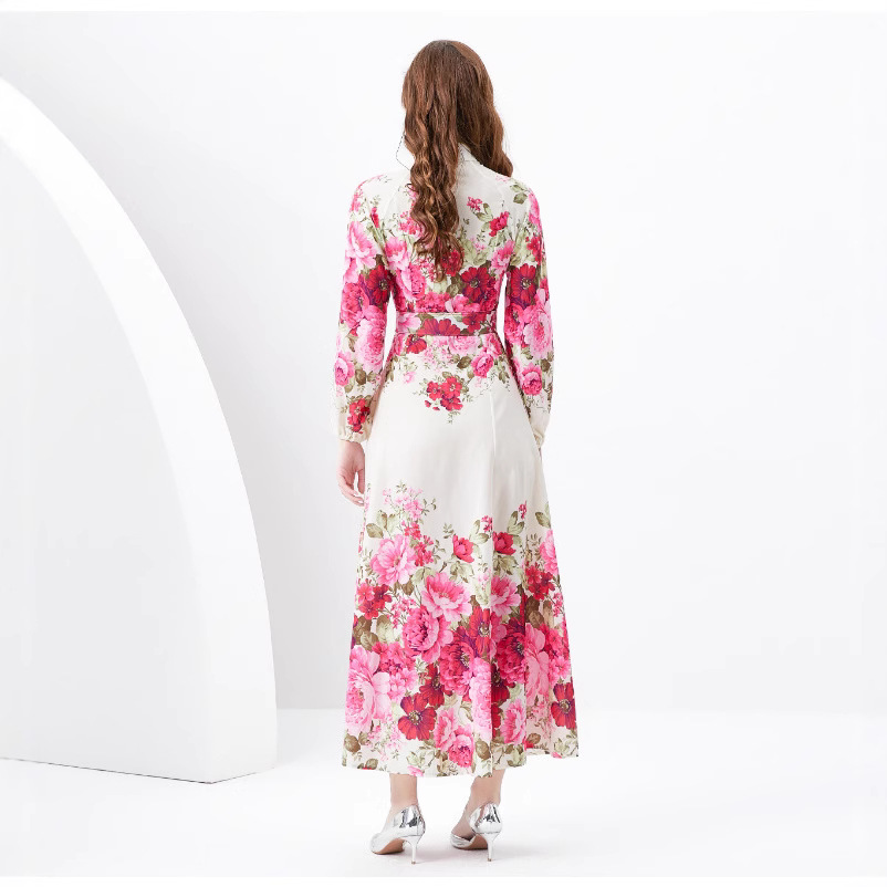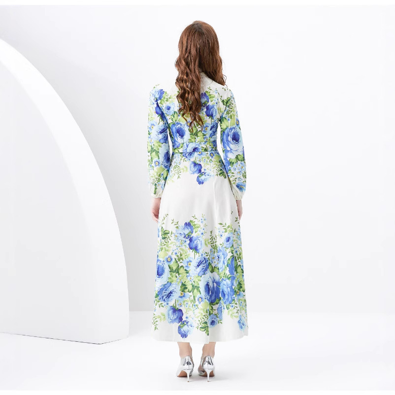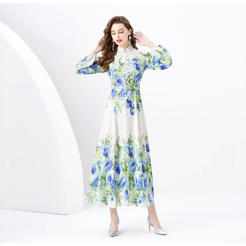 Floral series Spring and Autumn women 2024 new high-end printed slim fit long French bubble sleeve temperament dress