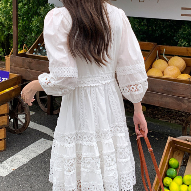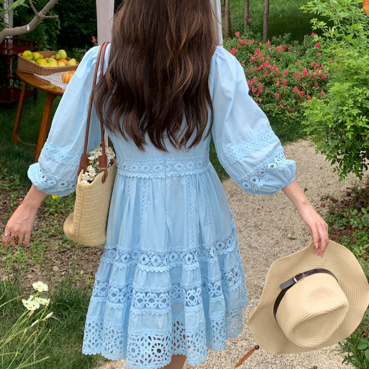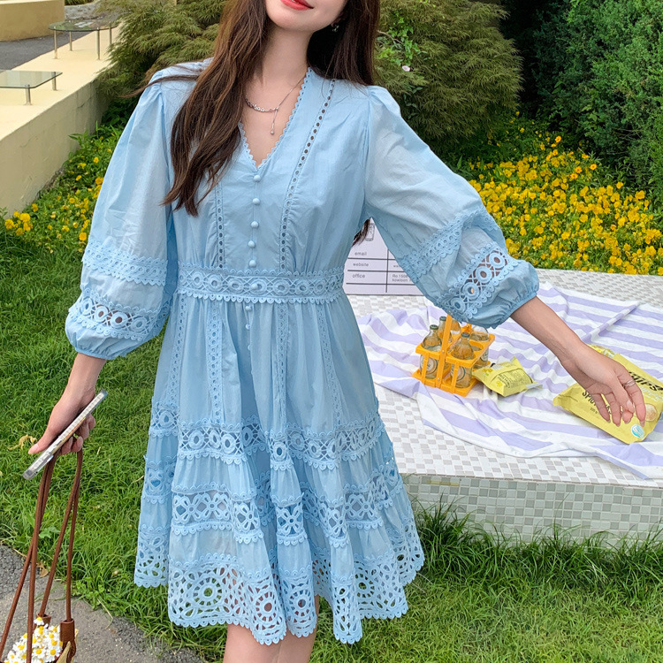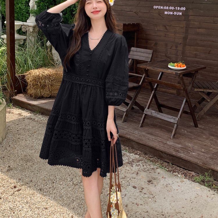 Long sleeved dress for women, new French style, slimming design, niche V-neck lace single breasted fluffy short skirt