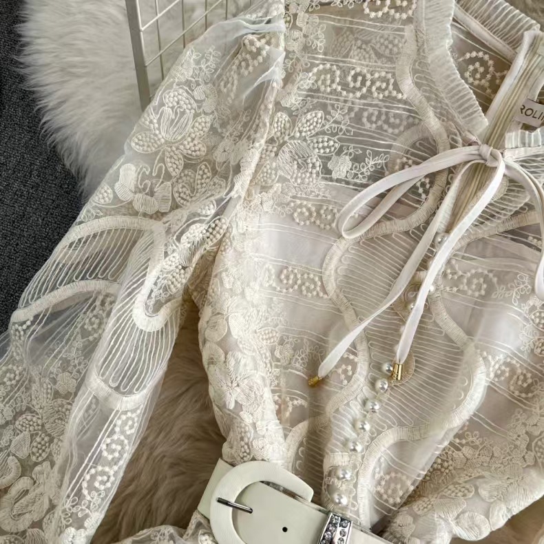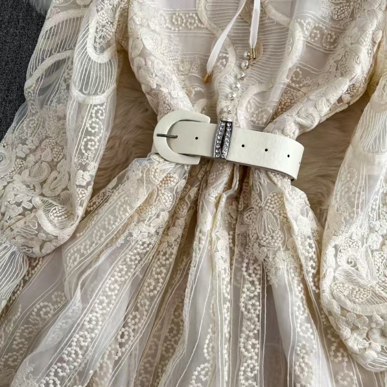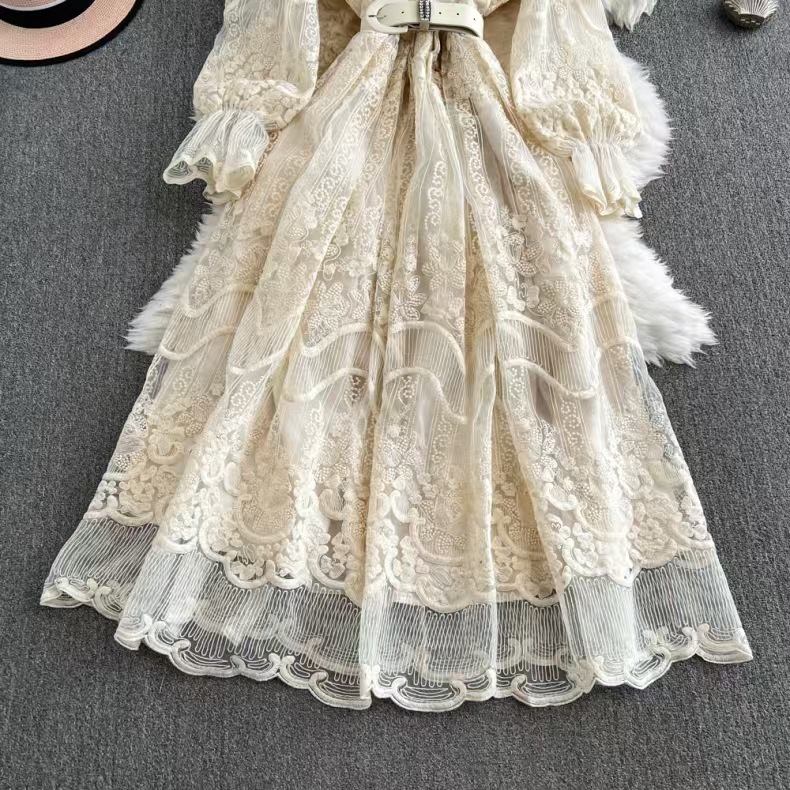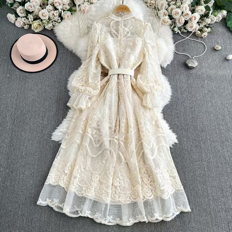 French retro palace style formal dress with heavy embroidery, mushroom edge, slim fit, long lace skirt, high-end exquisite dress
