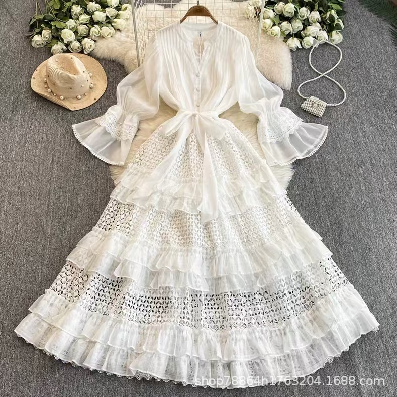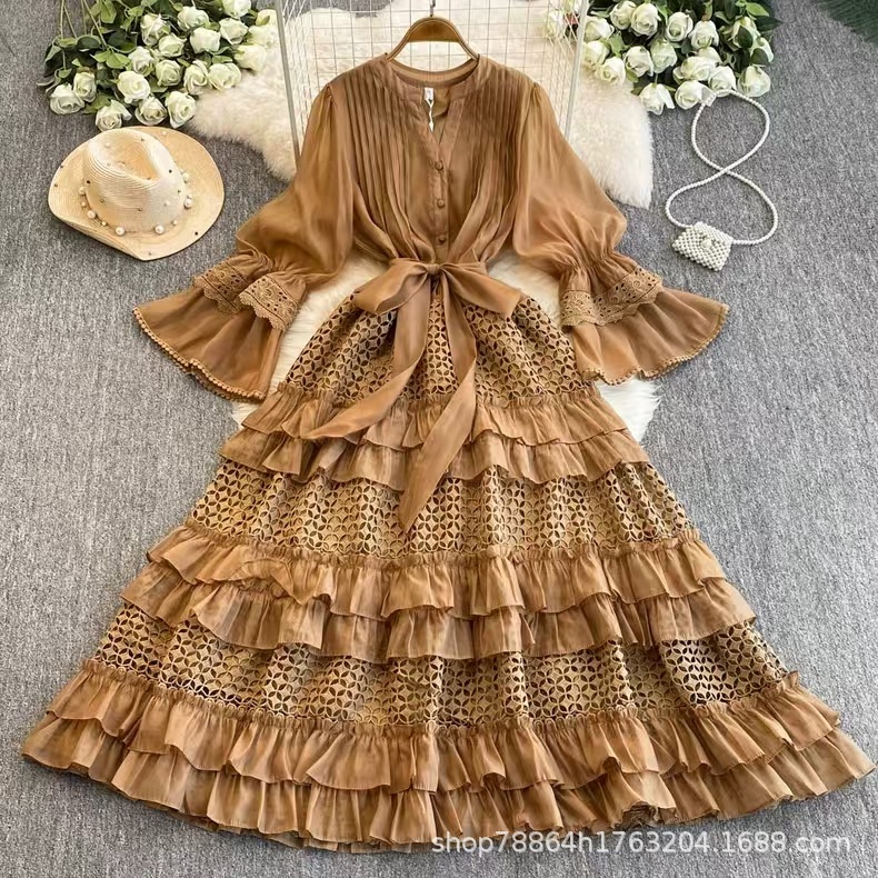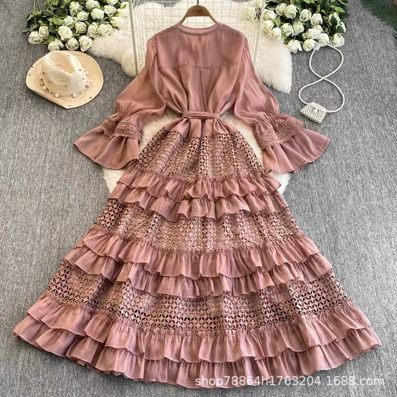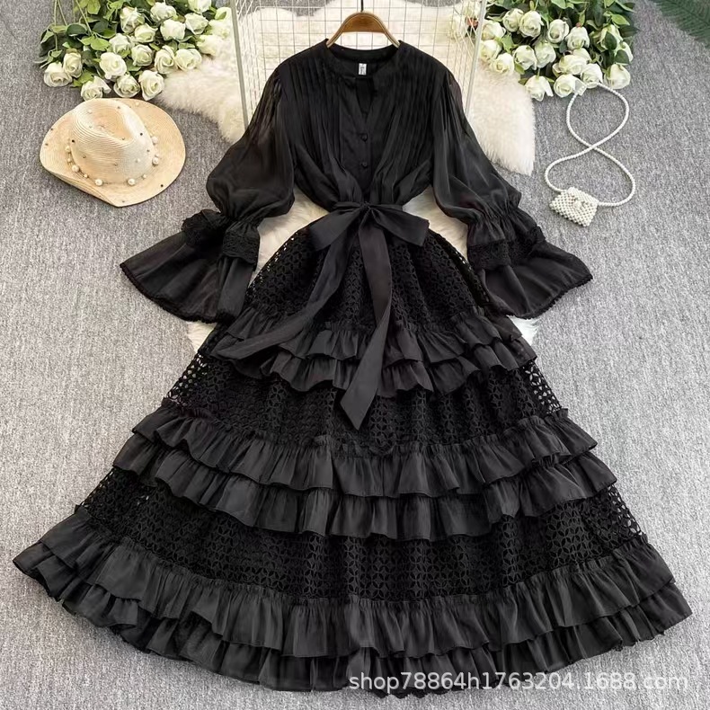 French retro court hollow lace patchwork trumpet sleeve dress with women's waist cinching temperament, knee high cake long skirt