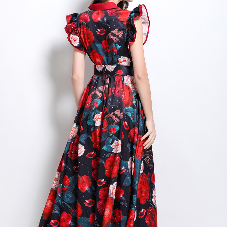 European and American fashion printed lotus leaf sleeves, lapel, single breasted waist cinching, big swing dress for women, slimming and elegant long skirt