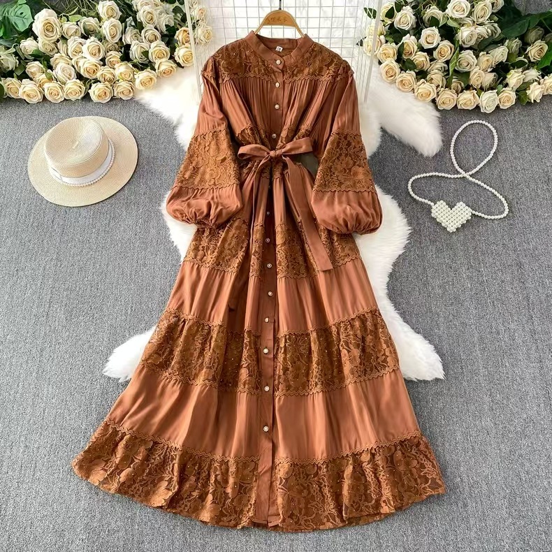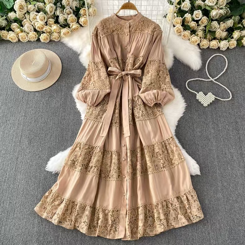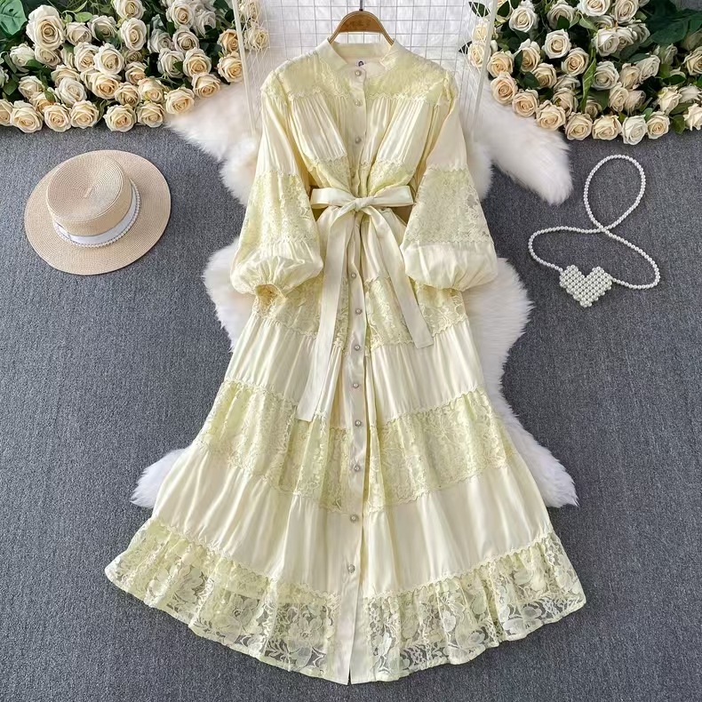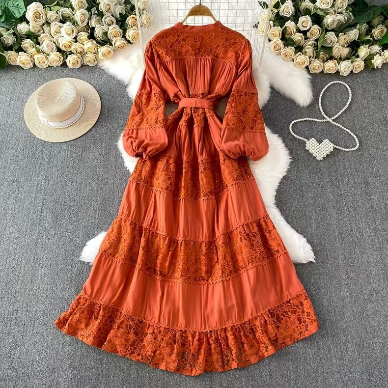 Palace style niche temperament dress for women in autumn 2025, featuring French straps, waist cinching, lace patchwork, and hot diamond long skirt