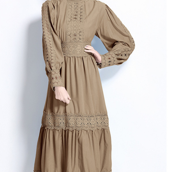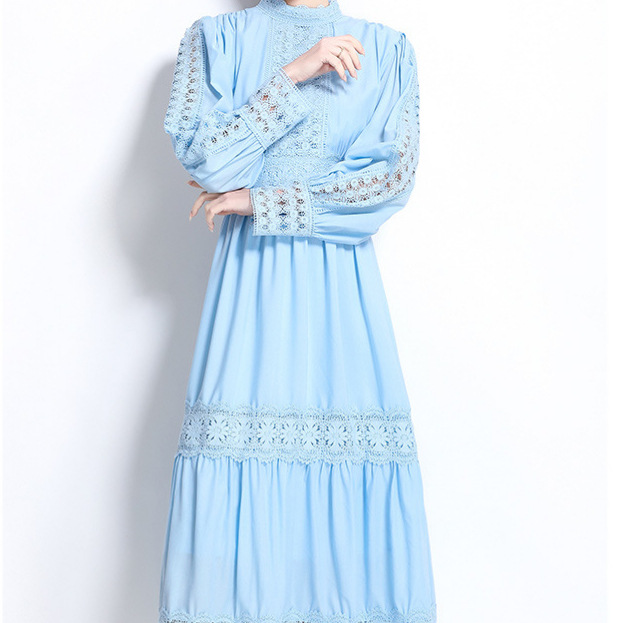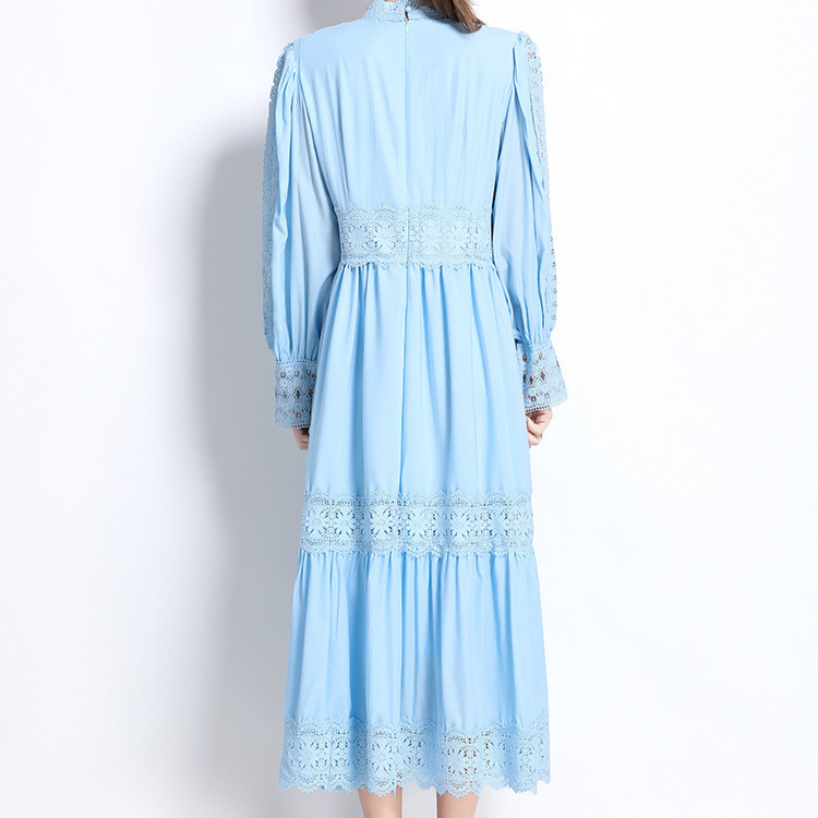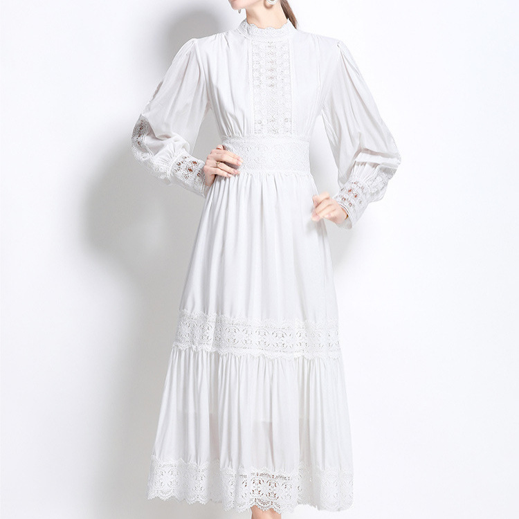 Spring French women's dress with palace style dress, cinched waist for slimming effect, hollowed out lace splicing, large swing vacation long skirt