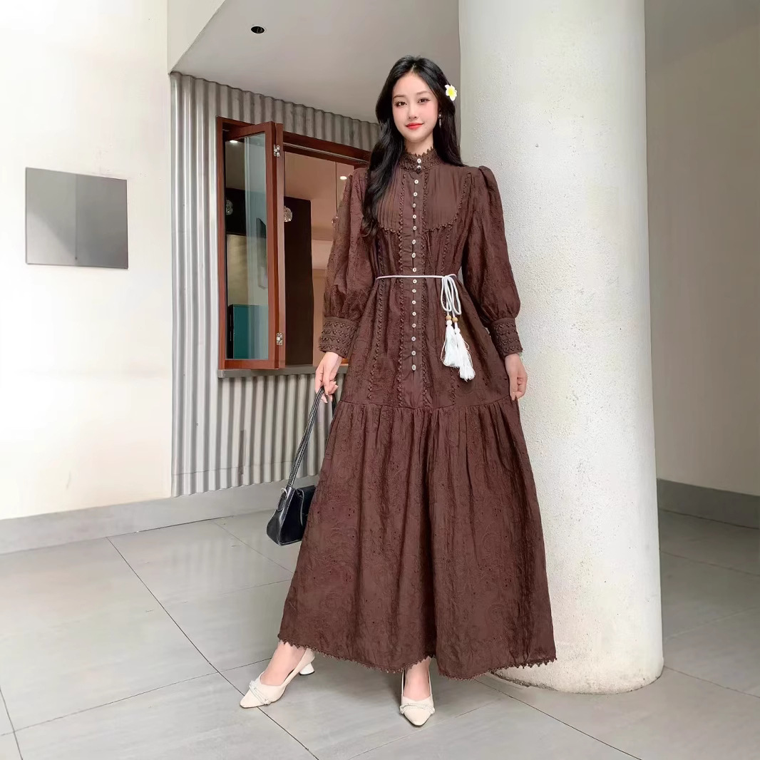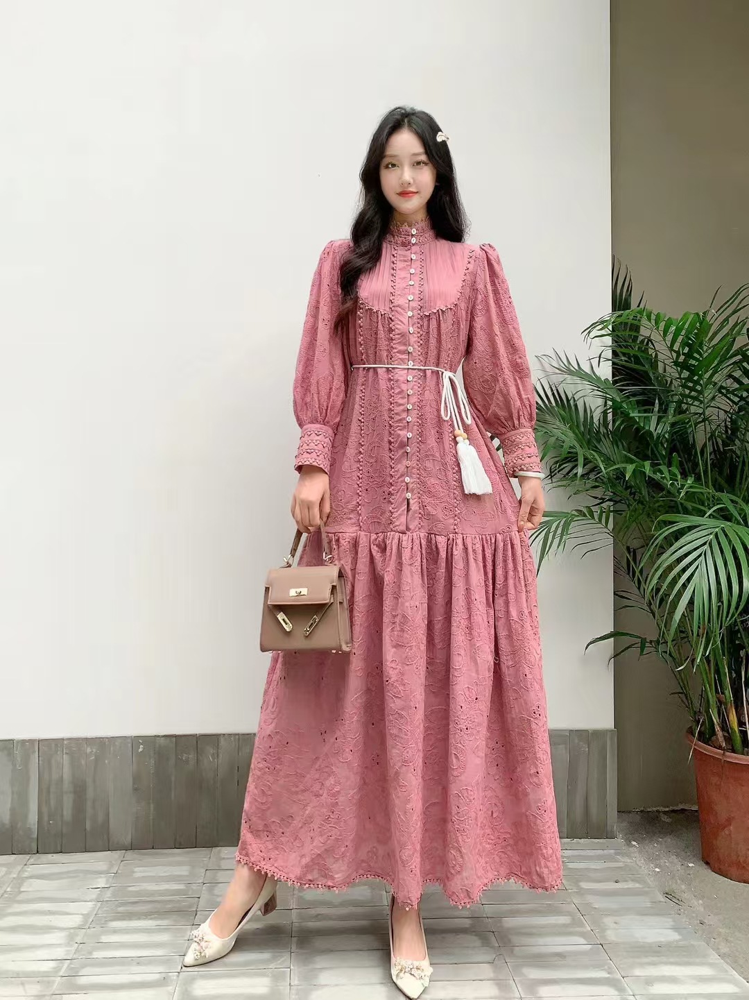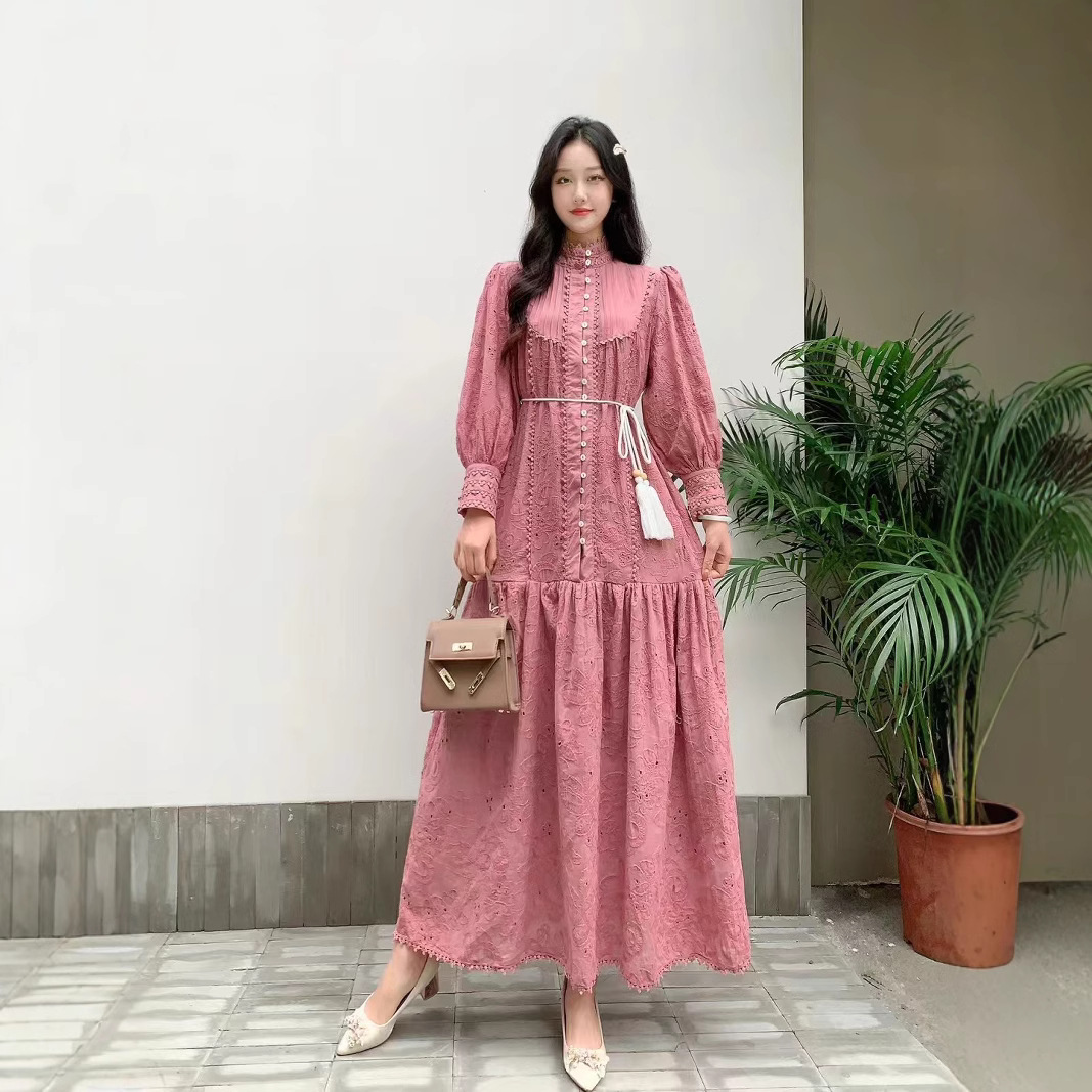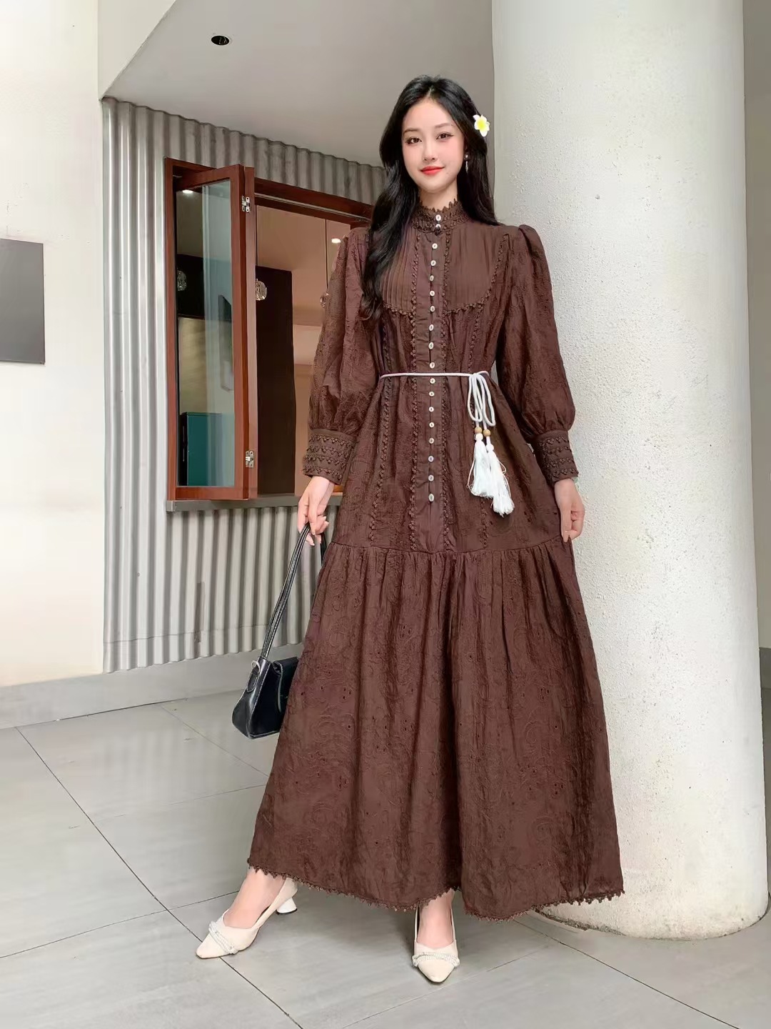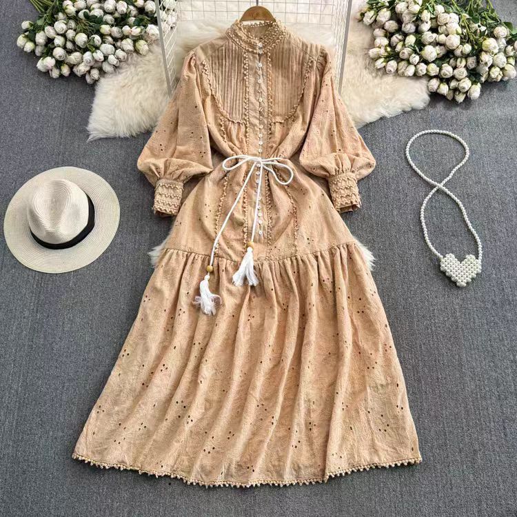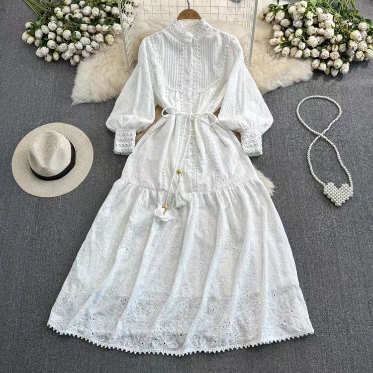 Sweet Heavy Industry Embroidered Hook Flower Lantern Sleeve Waist Dress for Women, French Style, High End, Showing Thin Temperament, Aging Long Dress