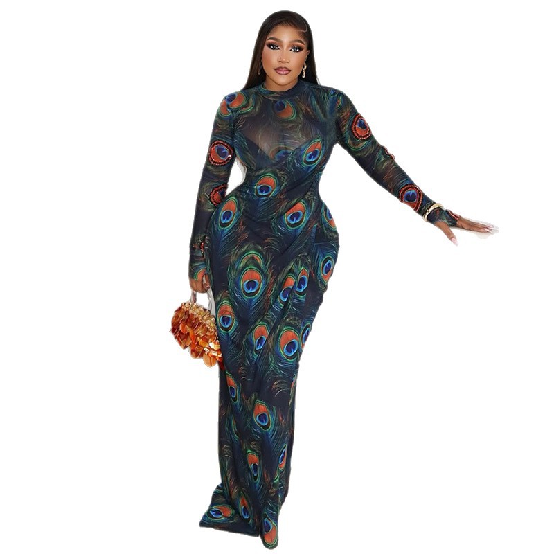 European and American style foreign trade personality temperament women's printed sexy bag skirt slightly transparent high neck long sleeved slim fit dress trendy