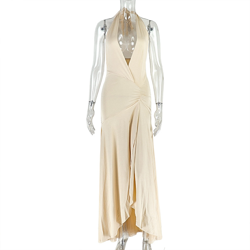 European and American style ins foreign trade women's clothing waist cinching slimming solid color hip hugging skirt V-neck pleated hanging chest hugging dress formal dress