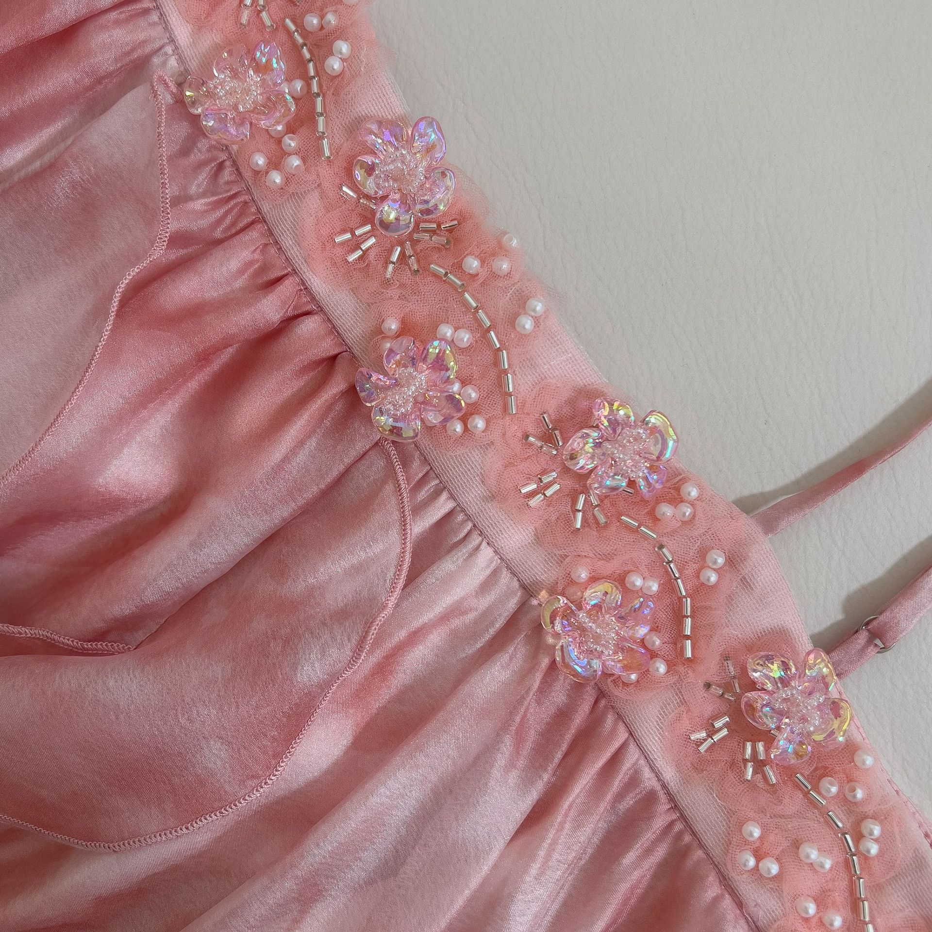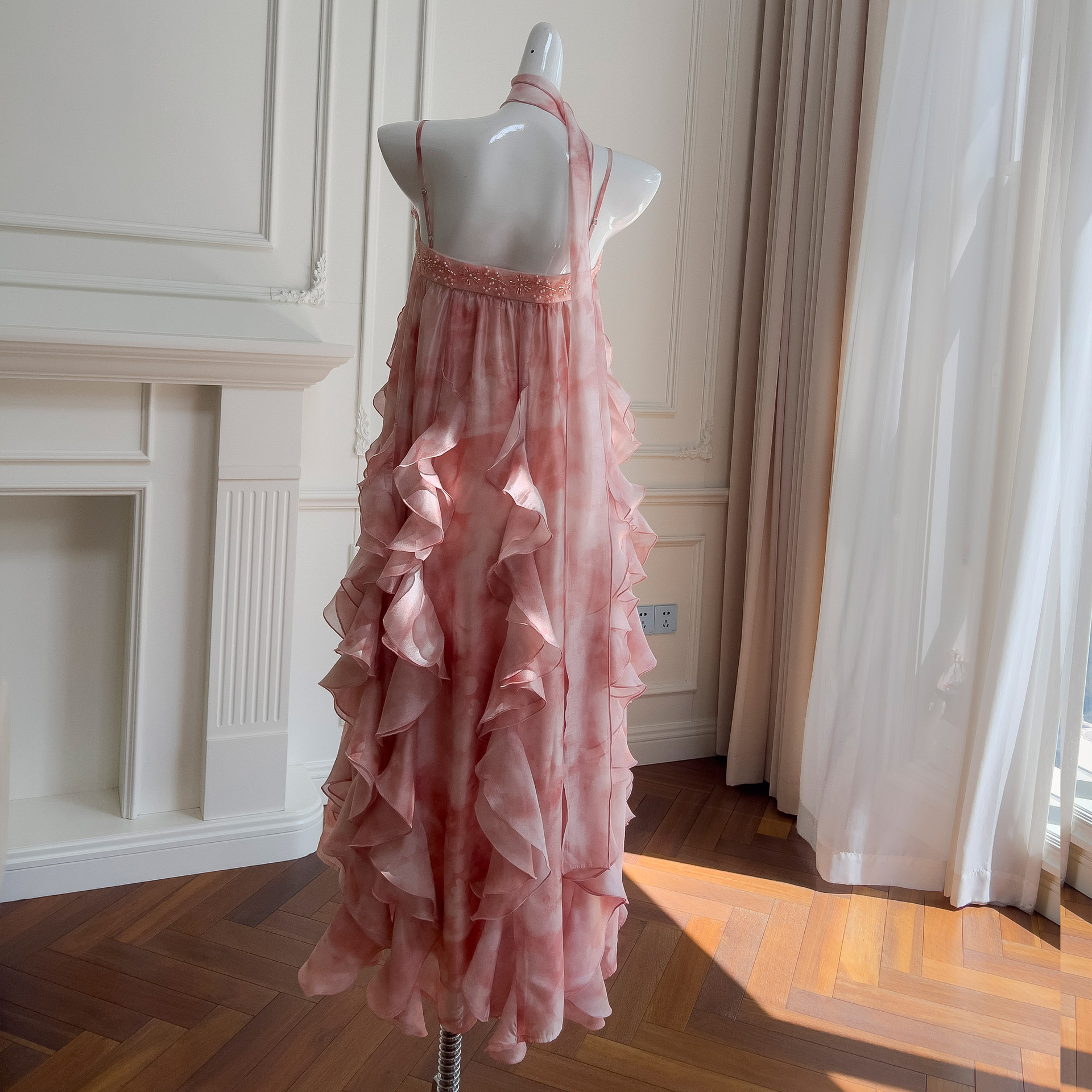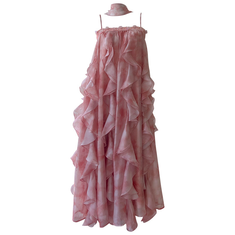 Rich heiress pink camisole dress for women summer vacation style fairy ruffled elegant princess dress 69118