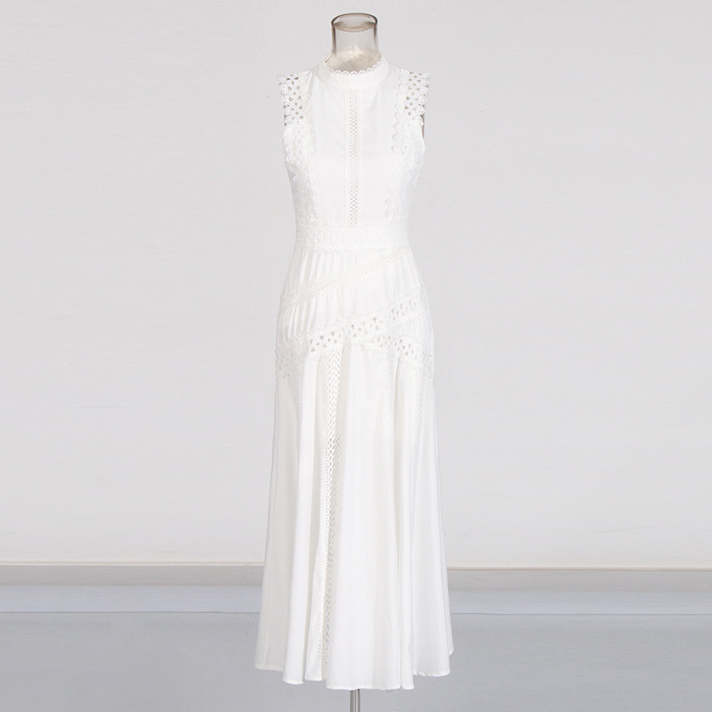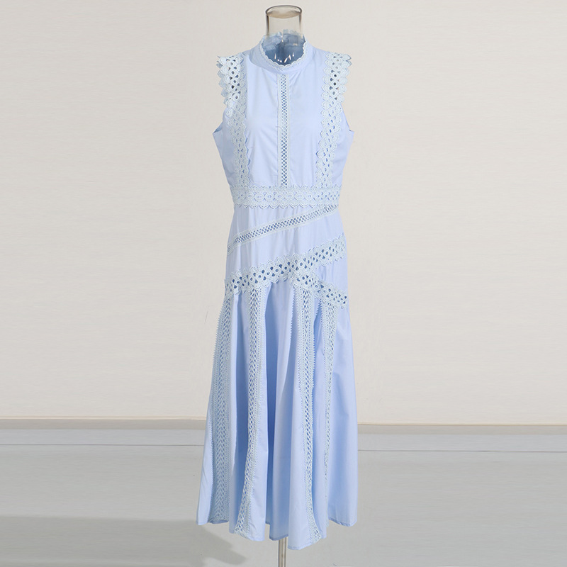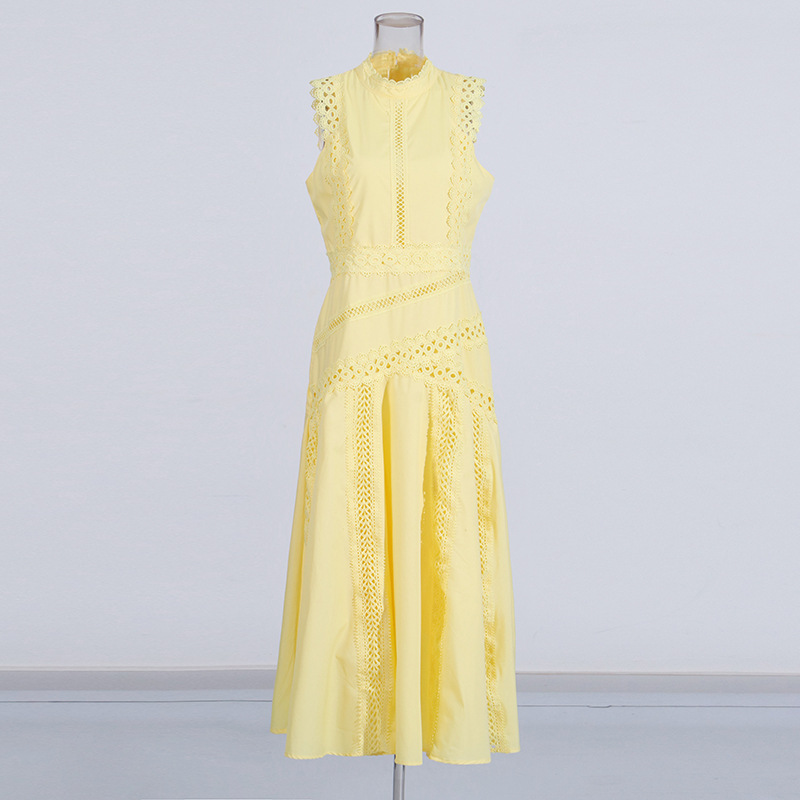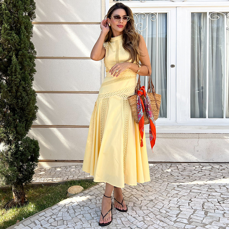 European and American cross-border seaside vacation style long dress for spring and summer 2025 stand up collar sleeveless lace fashion hollow waist dress