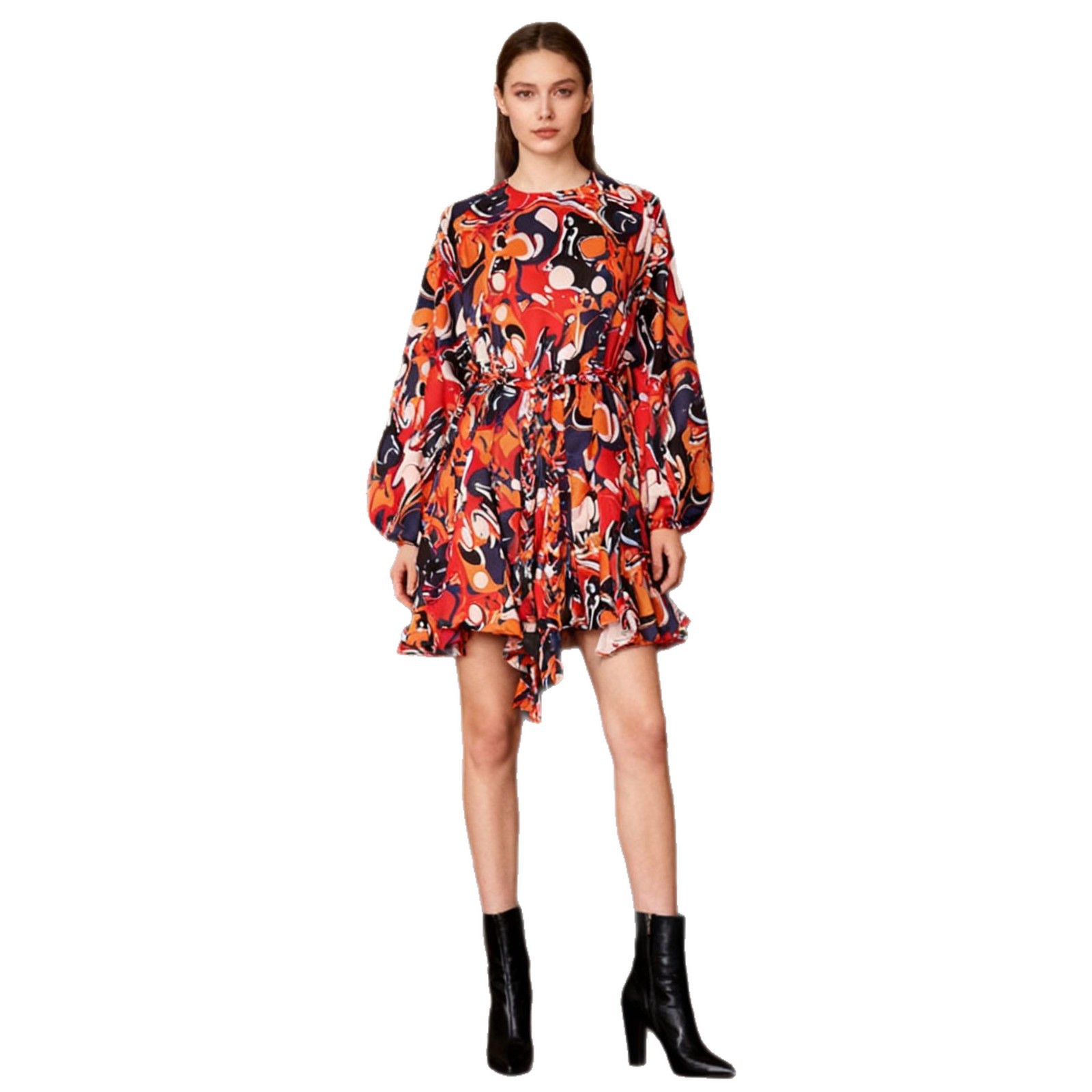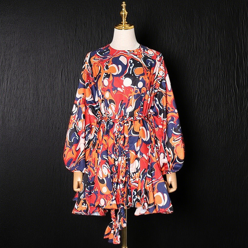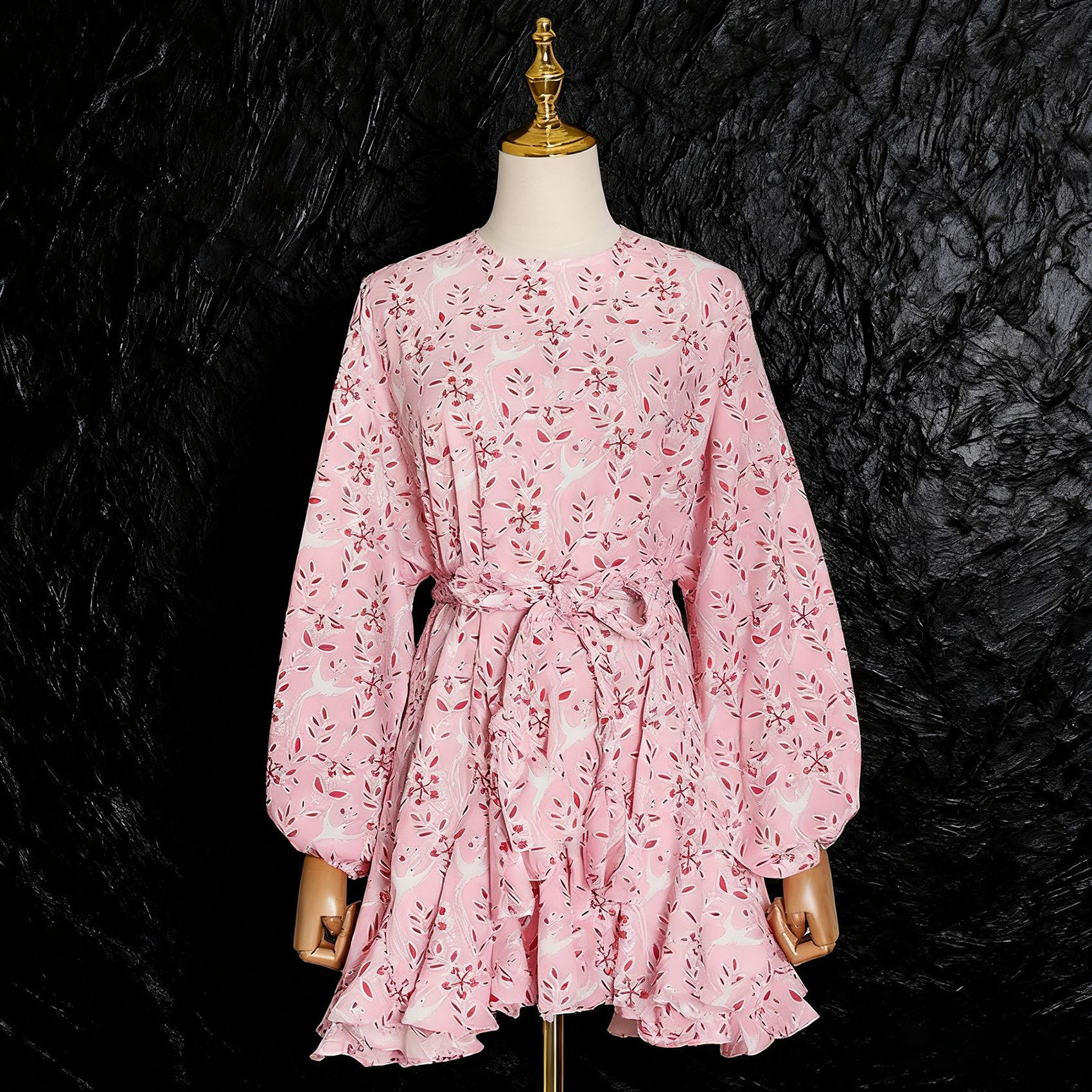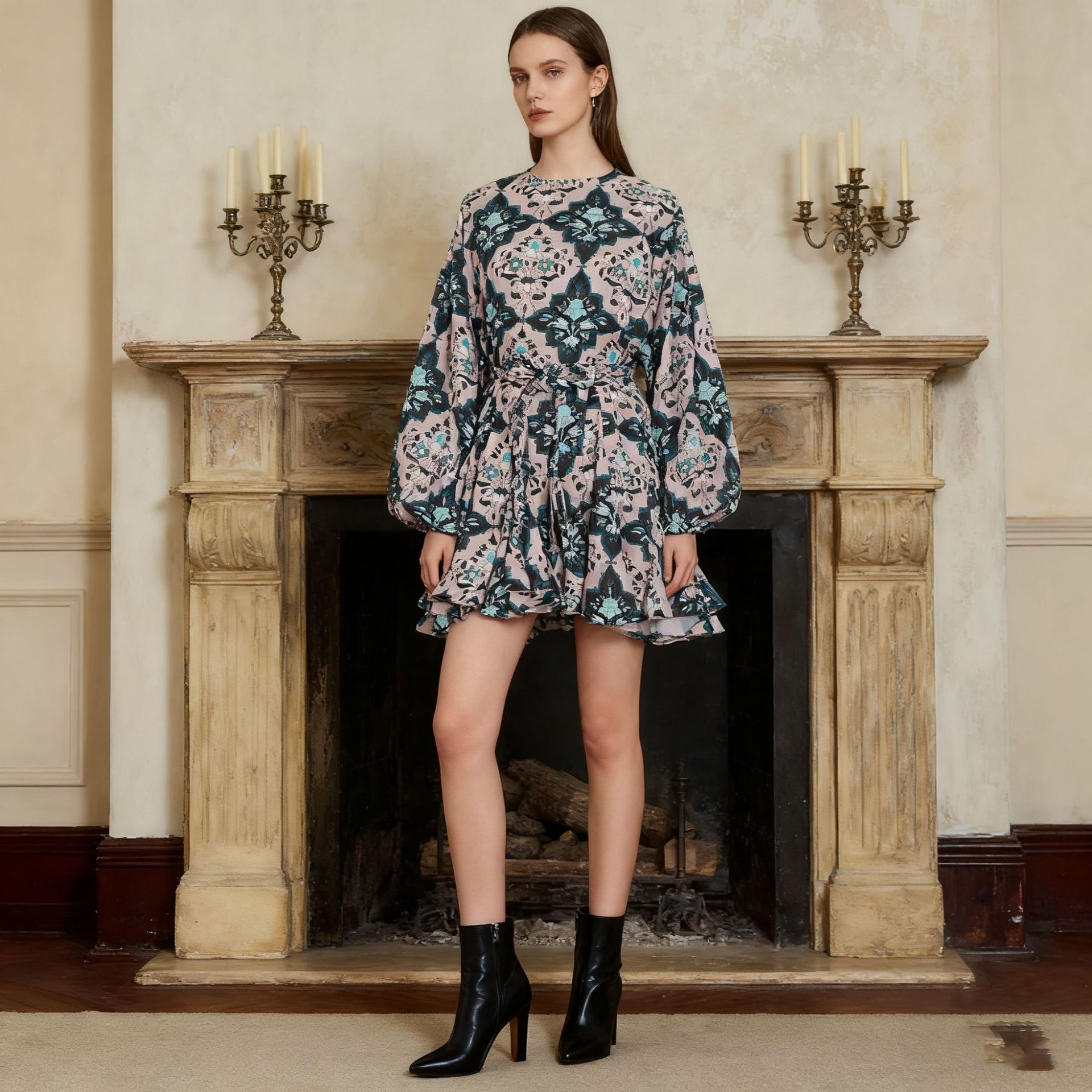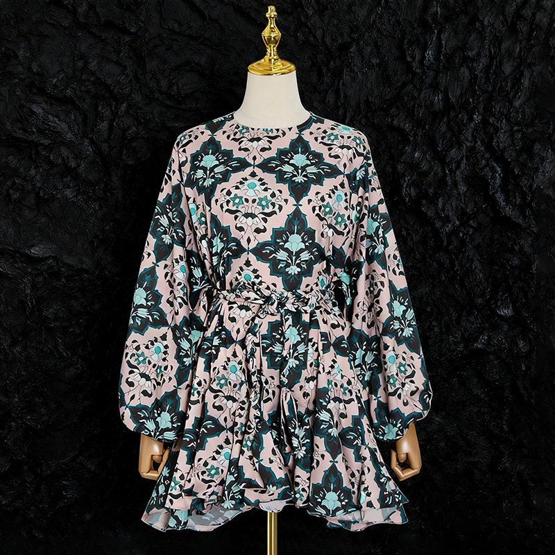 European and American Cross border Dress 2025 New Rural Style Retro Printed Round Neck Lantern Sleeve Strap Waist Short Skirt for Women