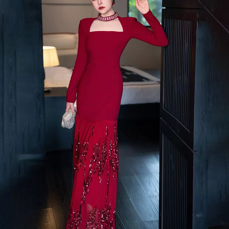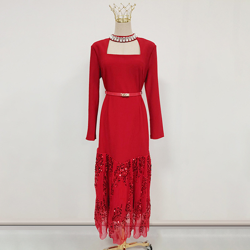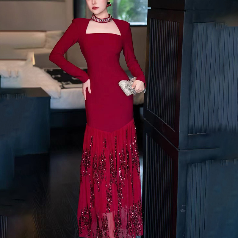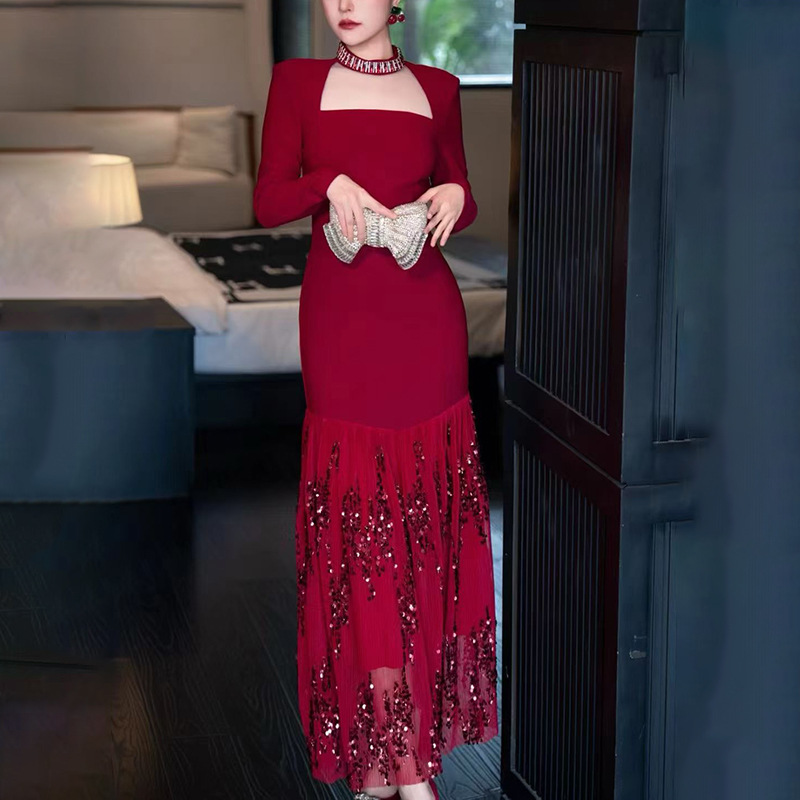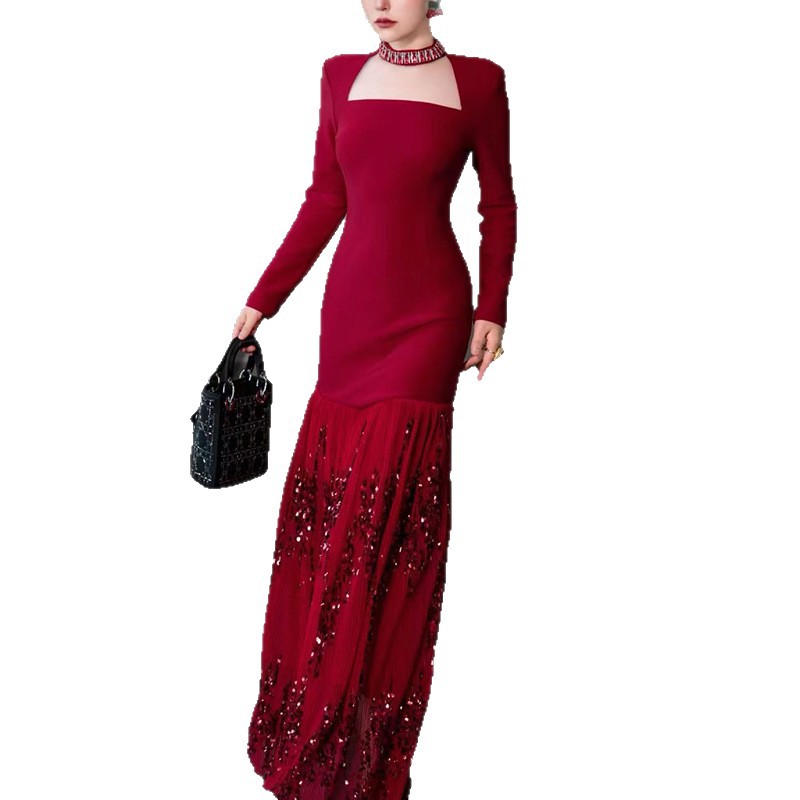 Elegant retro style dress 2025 new style temperament U-neck high-end feeling nail bead splicing mesh slim fit long skirt