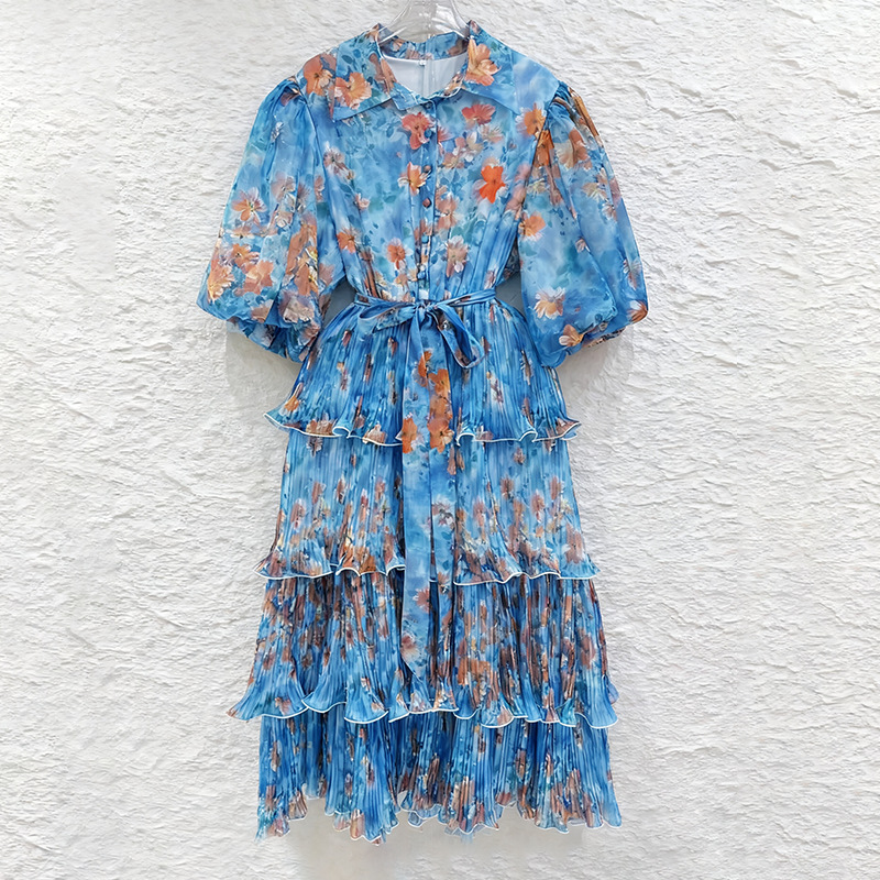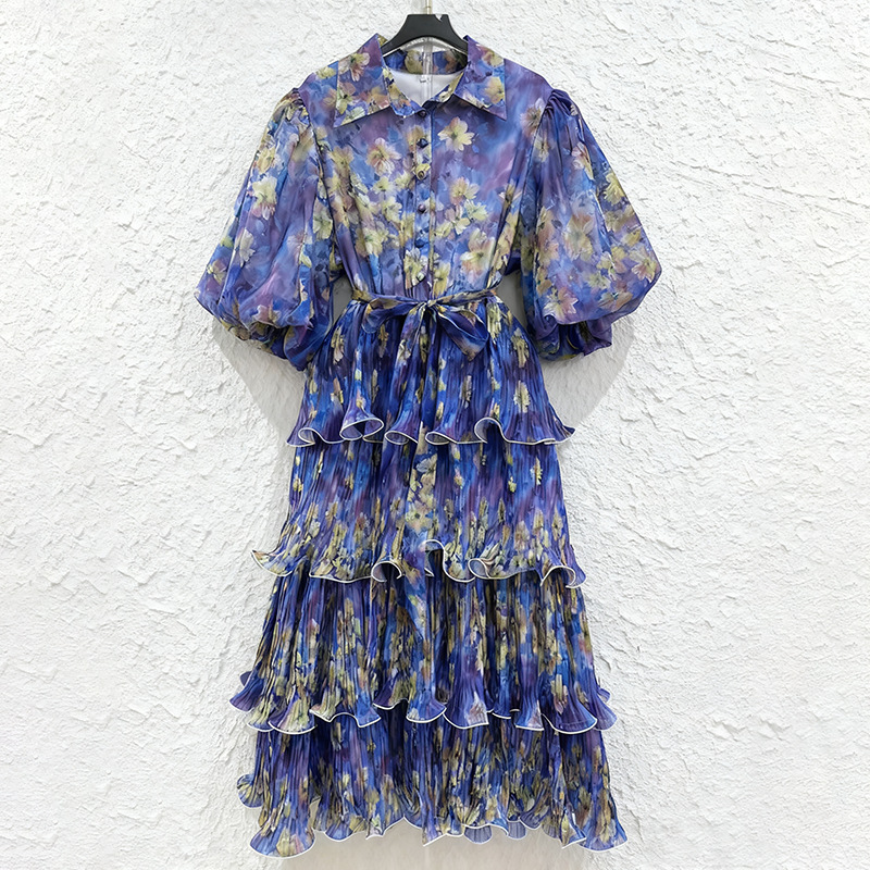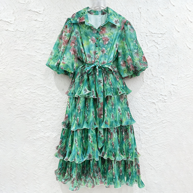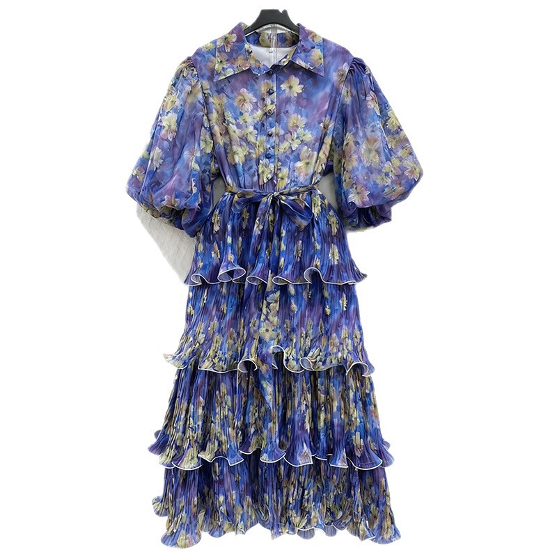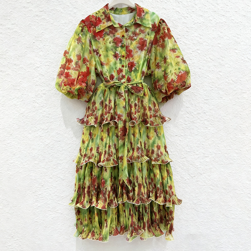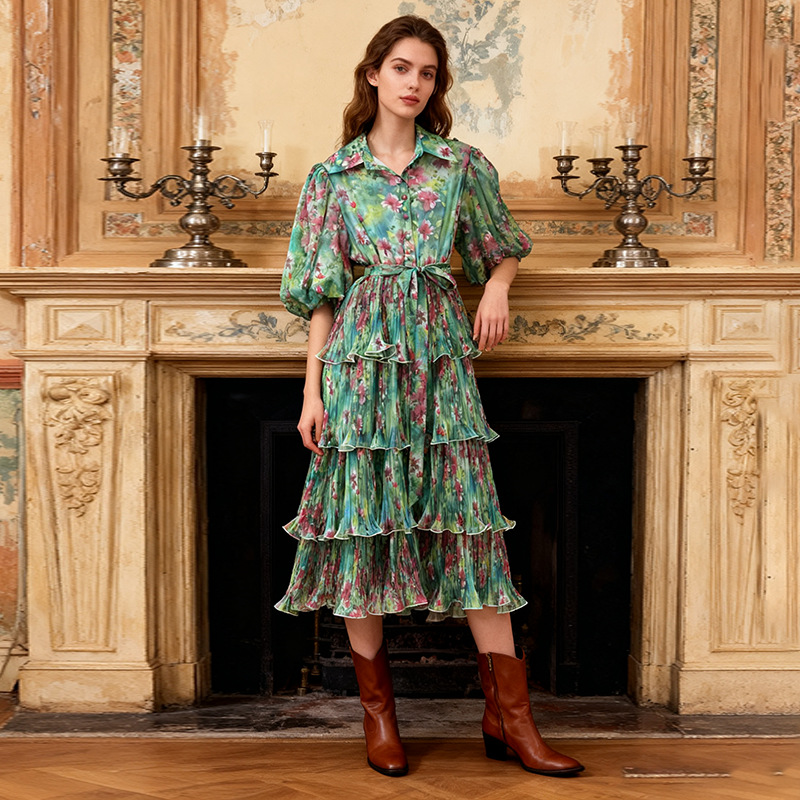 French retro high-end dress 2025 new fashionable lapel print lace up waist cinching layered cake skirt