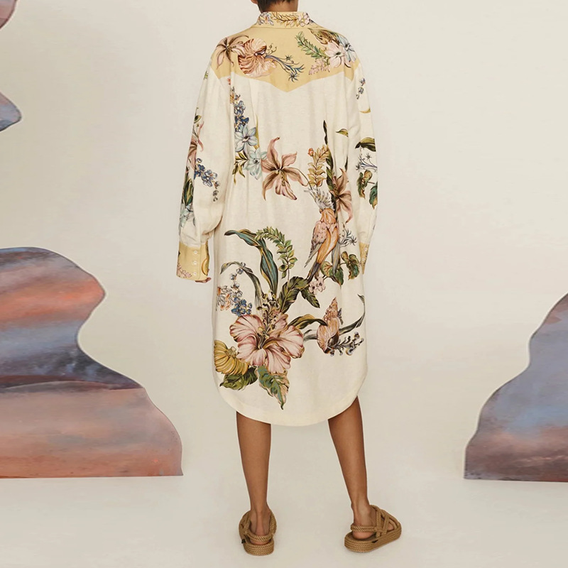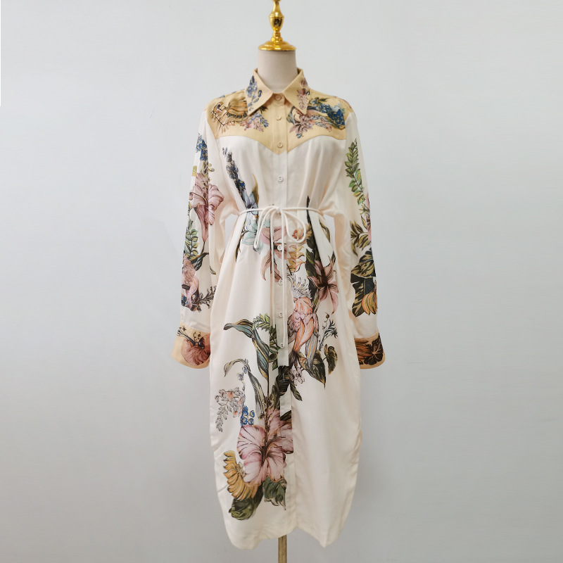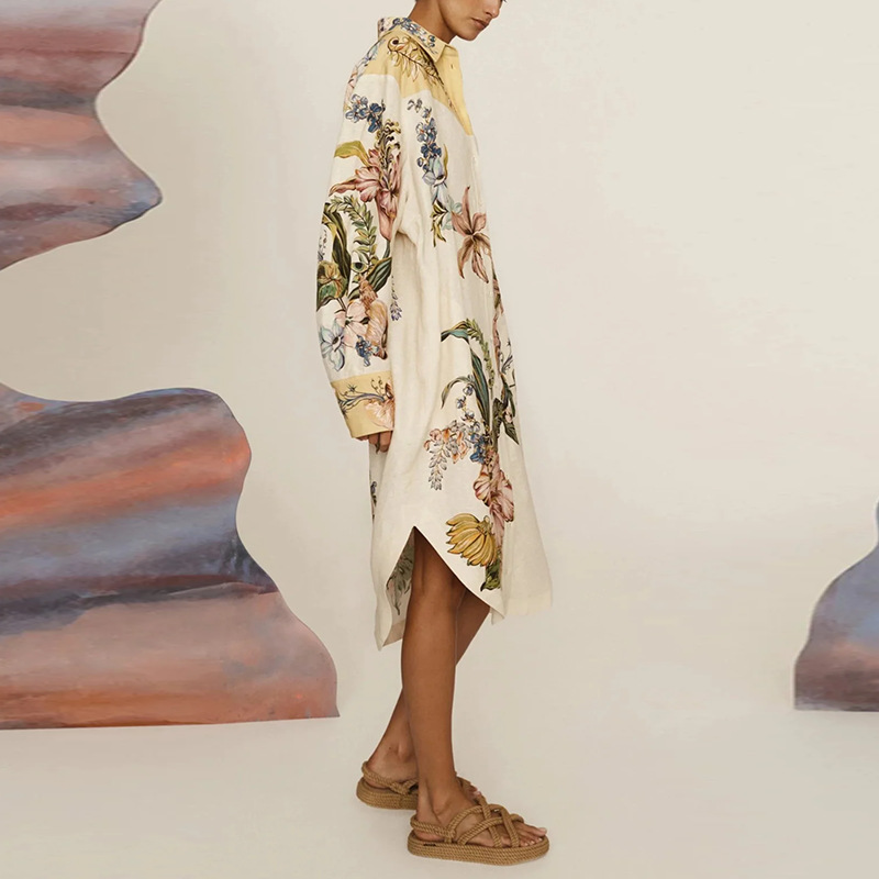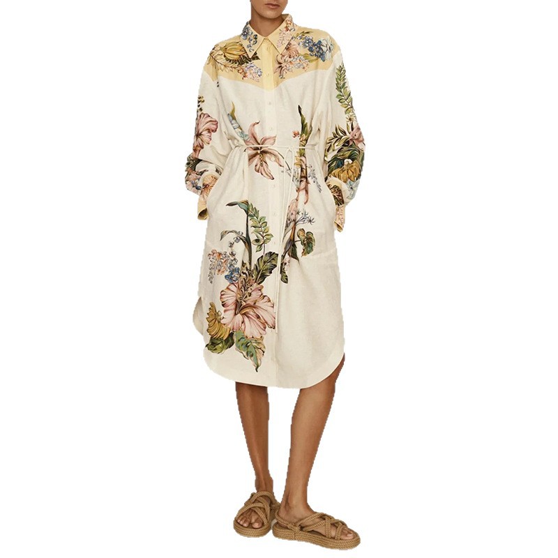 French retro vacation style dress for women's summer 2025 new style fashionable lapel long sleeved temperament printed irregular skirt