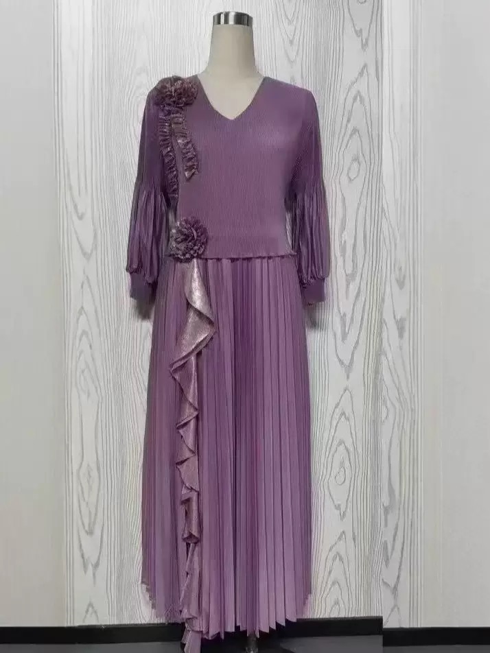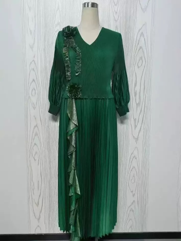 Folded European and American cross-border autumn hot stamping nail bead lotus leaf long dress elegant loose dress three-dimensional decoration flowers