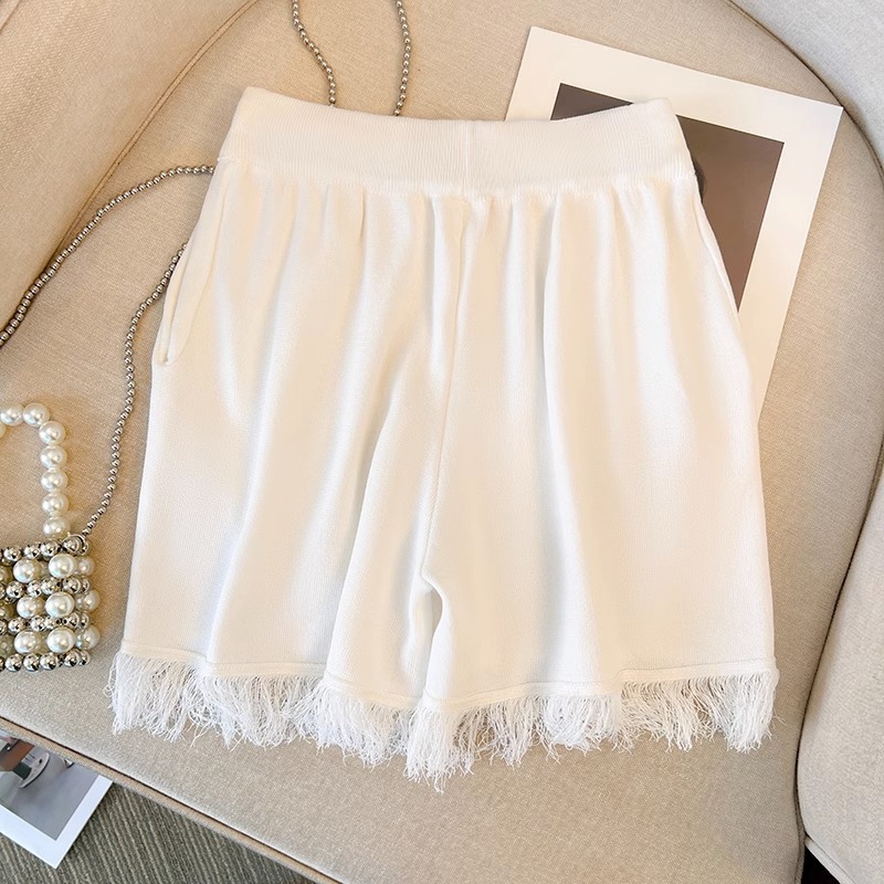French style sweet and spicy top set for women, pink tassel knitted small camisole vest+high waist wide leg casual shorts
